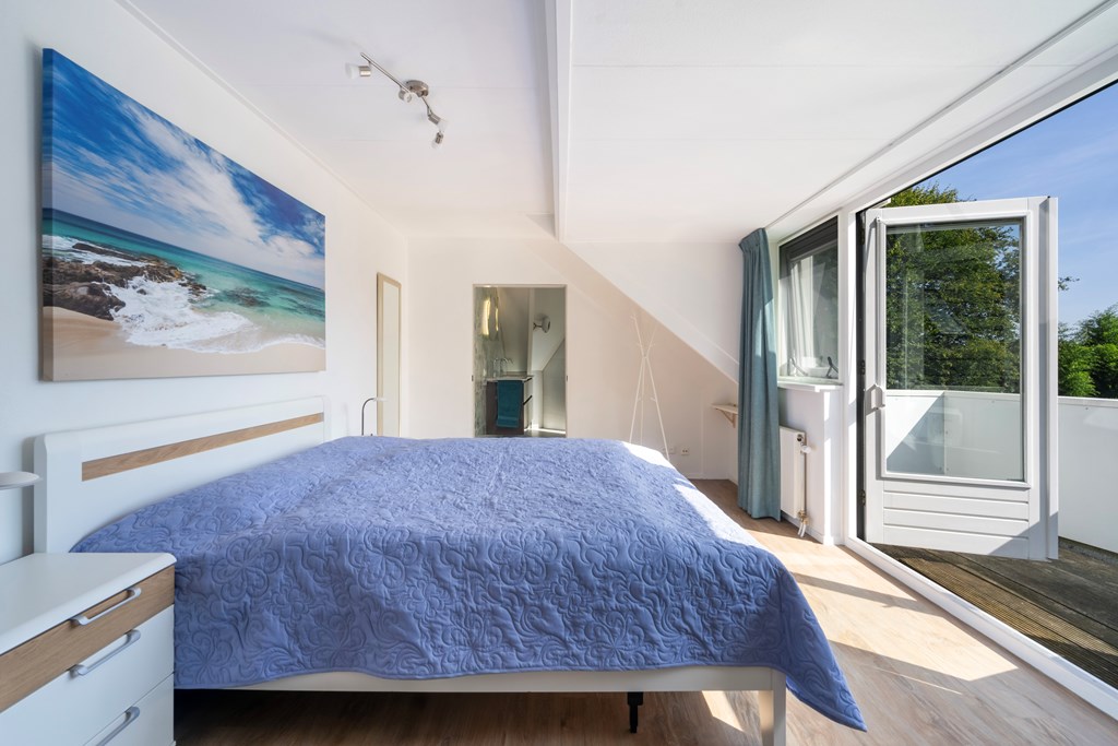 De overloop geeft toegang tot drie slaapkamers en een badkamer. De royale masterbedroom beschikt over een eigen en suite badkamer en is uitgerust met airconditioning voor extra comfort. De dubbele openslaande deuren van de slaapkamer geven u toegang tot een balkon, waar u een prachtig weids uitzicht heeft op de groene tuin. Grenzend aan de slaapkamer komt u in een ruime kastenkamer met daglicht. De tweede en derde slaapkamer liggen aan de voorzijde van het huis en beschikken beide over een ruime inbouwkast, ruimte voor een groot bed en een bureau, een openslaande deur naar het balkon aan de voorzijde en airconditioning. De schuine wanden, hoge nokken en zichtbare houten balken geven de hele verdieping een sfeervolle, karakteristieke uitstraling.