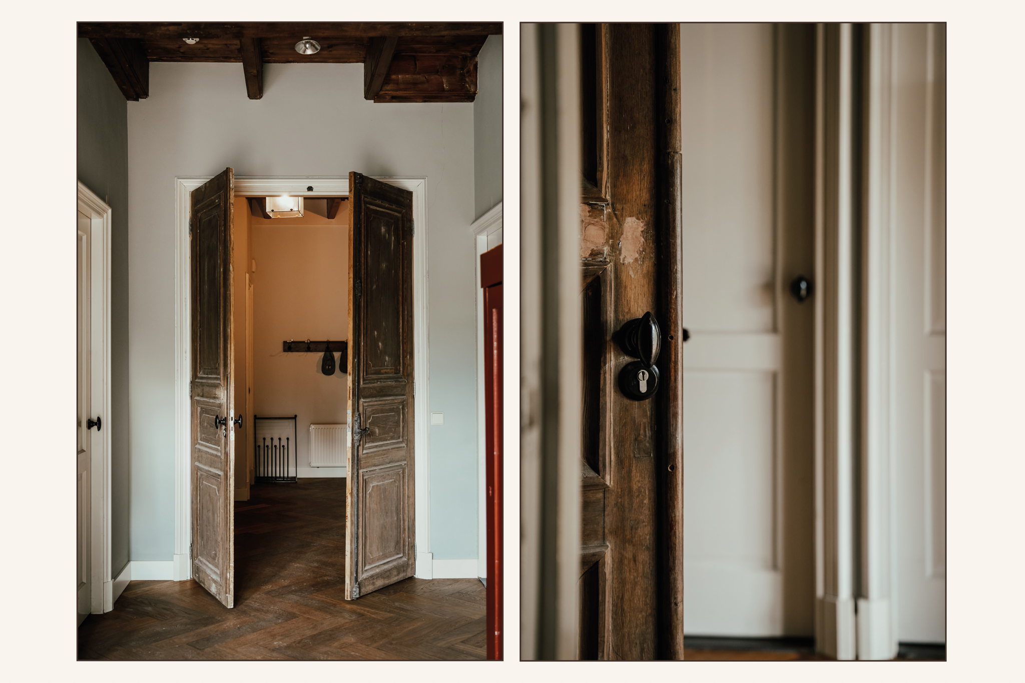 Ruime hal en achtergelegen gang met eiken Versaillesparket. Rechts van de hal ligt de studeerkamer met zicht op de Kerkstraat. Deze kamer heeft inbouwkasten en een brede schouw met houtkachel.