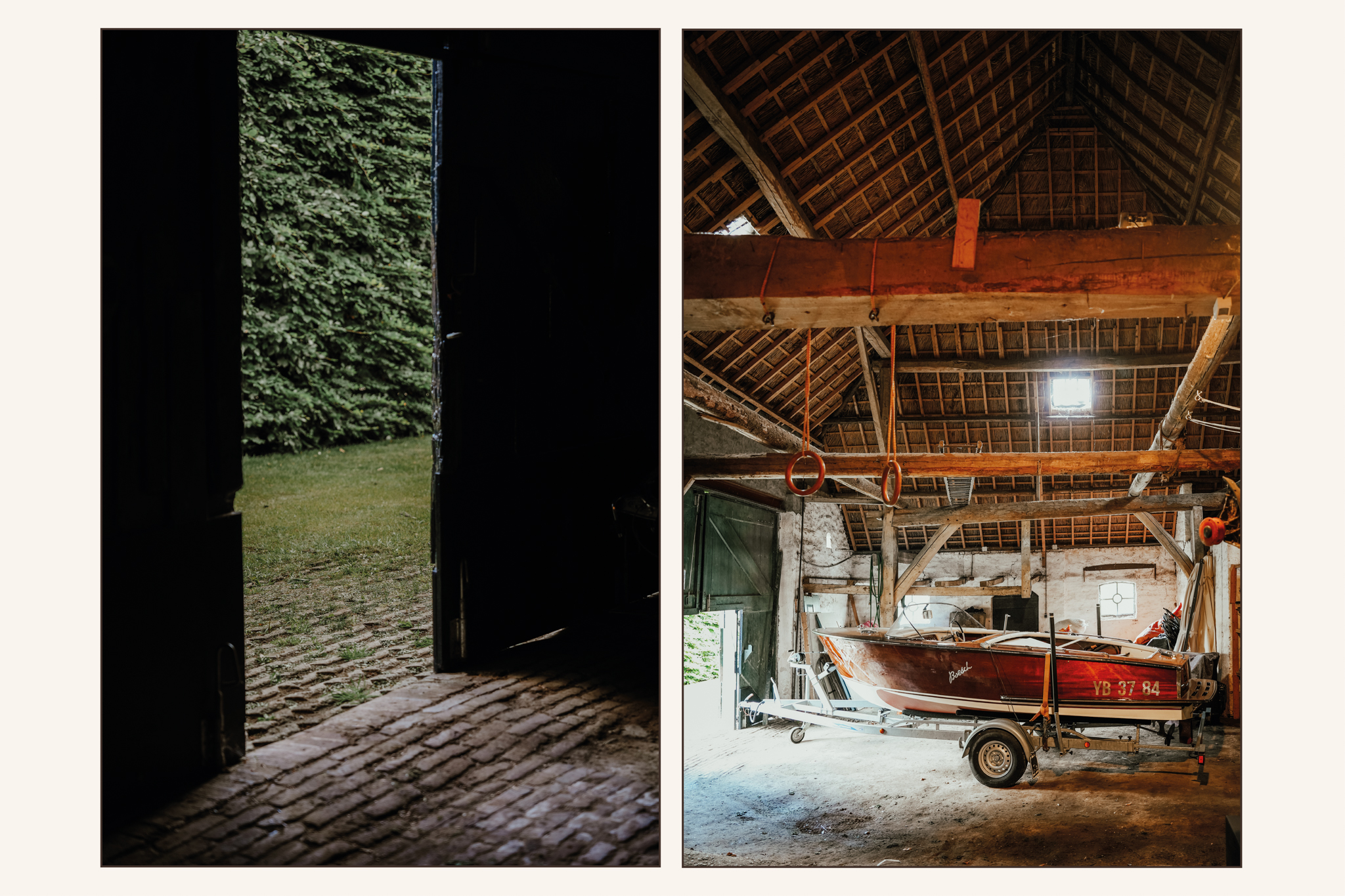 Vanuit de hal loop je binnendoor naar de kapschuur en naar een bergruimte die toegang geeft tot de zij-tuin. De kapschuur is in gebruik als stallingsruimte en biedt plaats aan een heuse oldtimercollectie. De trap die toegang geeft tot de grote kantoorruimte op de eerste verdieping is met een afsluitbare glazen pui afgeschermd van de rest van de hal.
