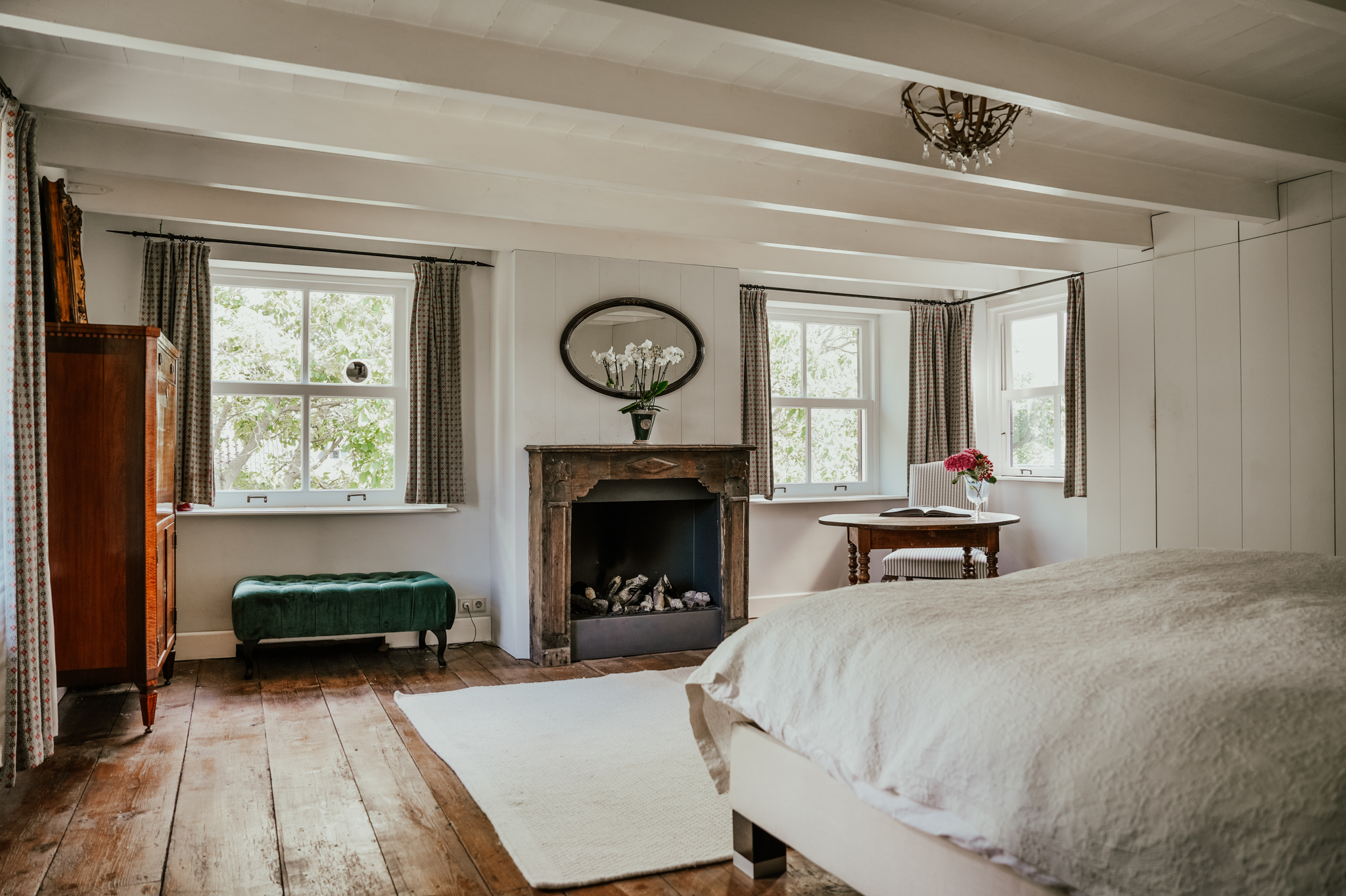 Aan de linkerzijde van de hal ligt de woonkamer. Door de hoge roederamen met binnenluiken en het witgeschilderde balkenplafond een heerlijke lichte ruimte. Er is een schouw met openhaard, brede eiken vloerdelen en een diepe vaste kast.