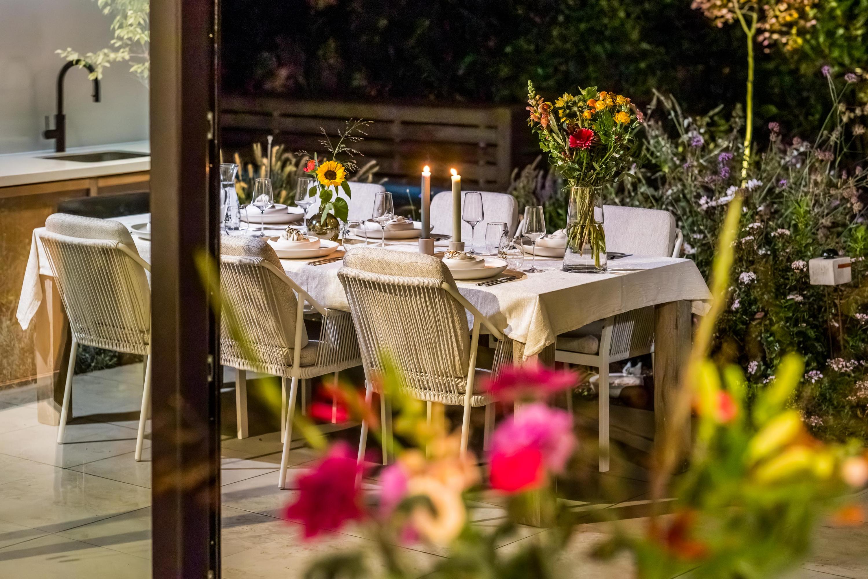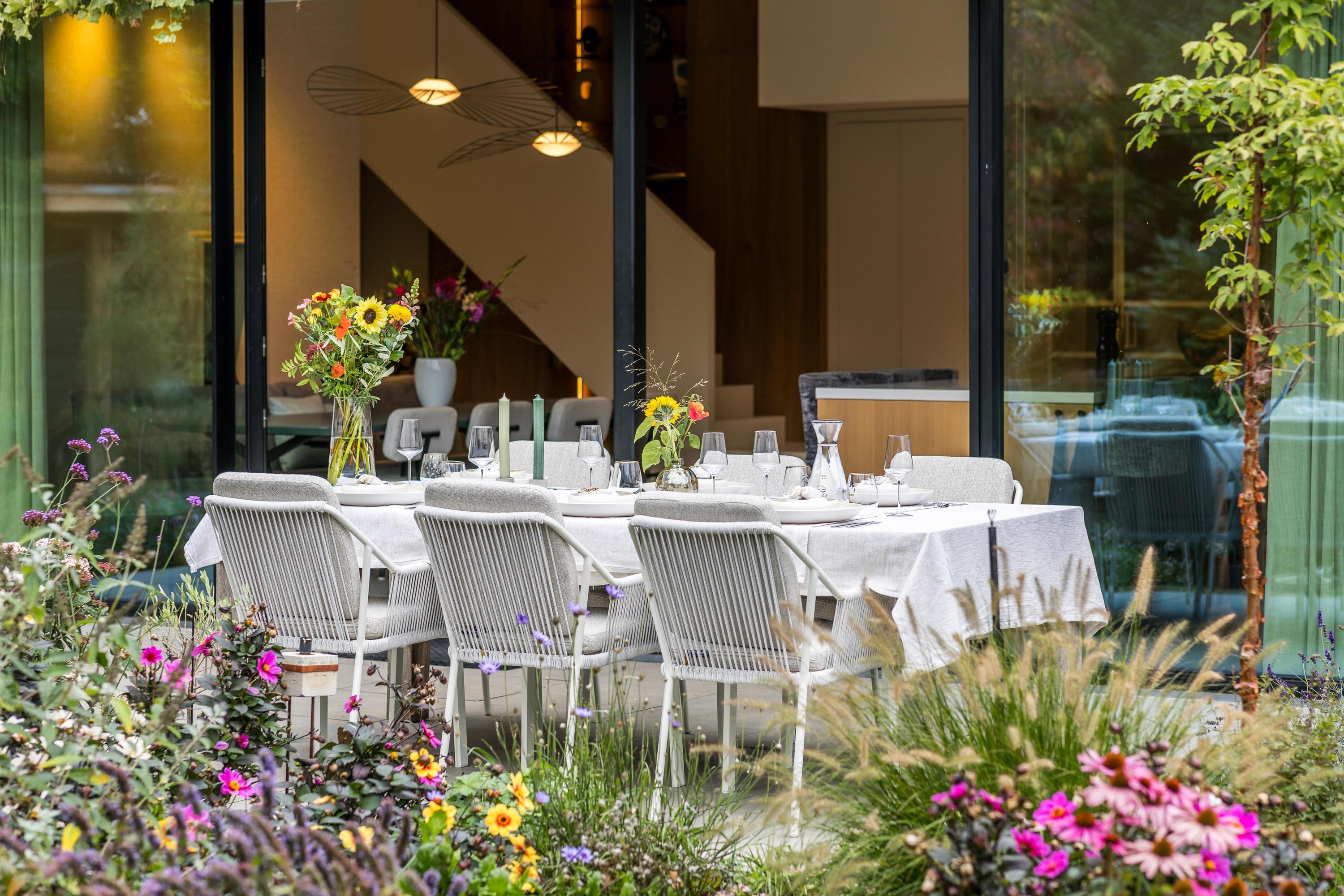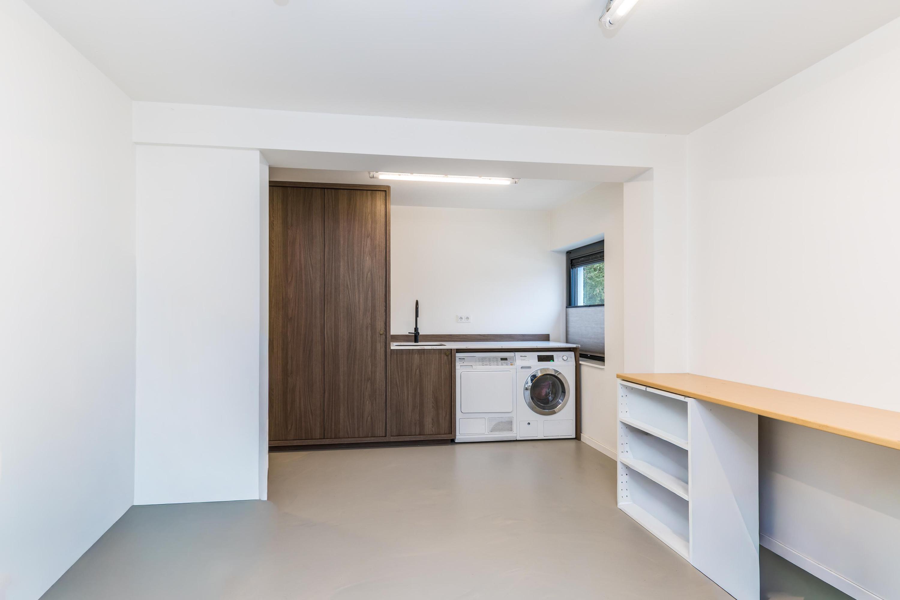 In het verlengde van de entreehal is er toegang tot de tuingerichte woonkeuken met een spectaculaire hoogte, een prachtige strakke keuken met kookeiland en voorzien van alle wenselijke inbouwapparatuur. Schuifpuien geven toegang tot het onderheide terras en de aantrekkelijke achtertuin.