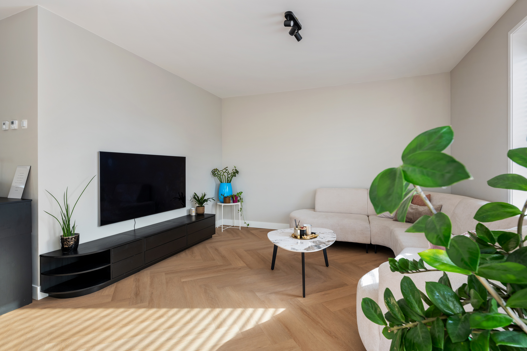 De sfeervolle woonkamer is opvallend licht en ruim, met het zitgedeelte aan de achterzijde van de woning, voorzien van een moderne elektrische haard. Aan de voorzijde bevindt zich de royale leefkeuken met een stijlvol kookeiland.