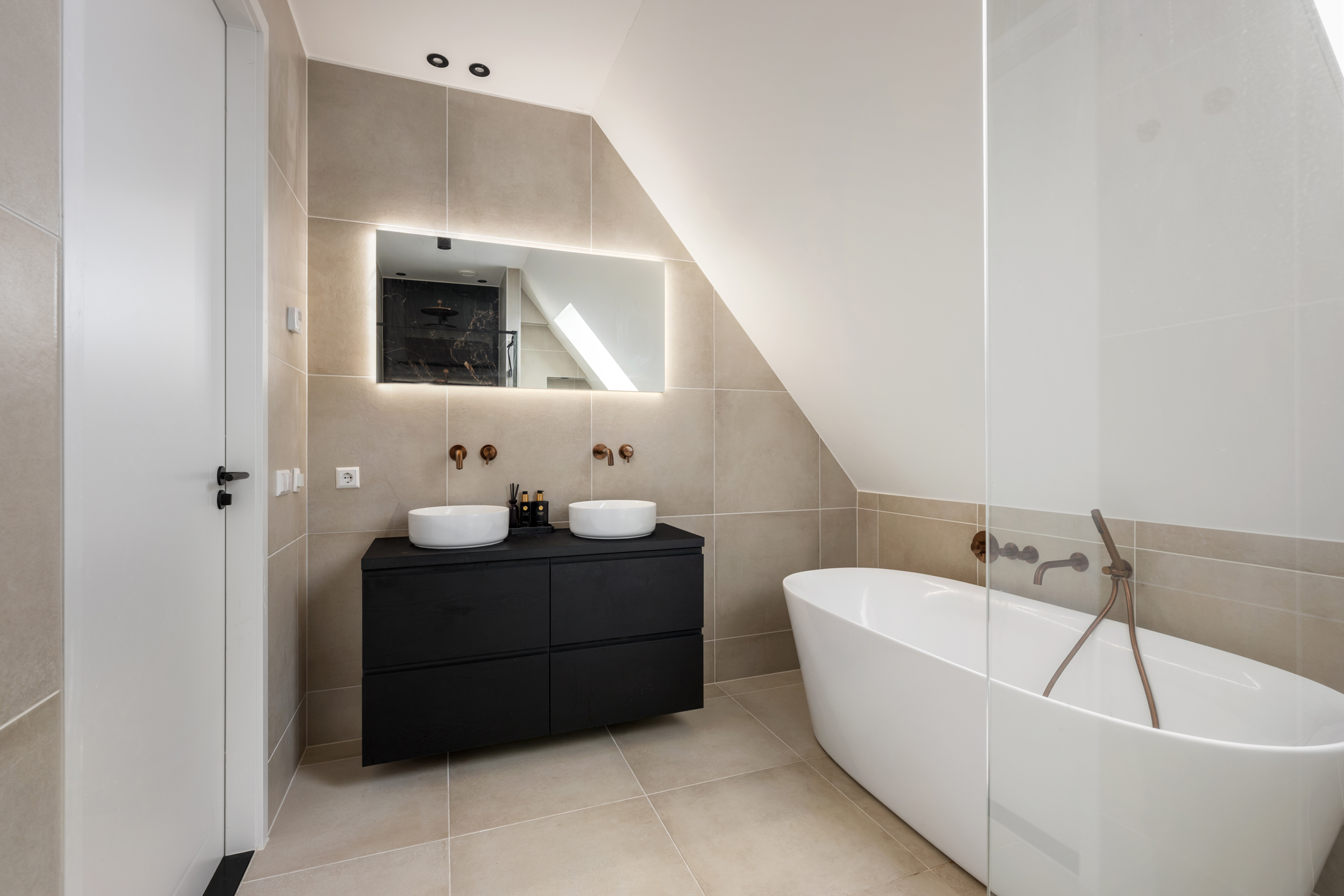 De moderne badkamer is voorzien van een ligbad, inloopdouche, toilet, dubbele wastafel en verlichte, verwarmde spiegel.