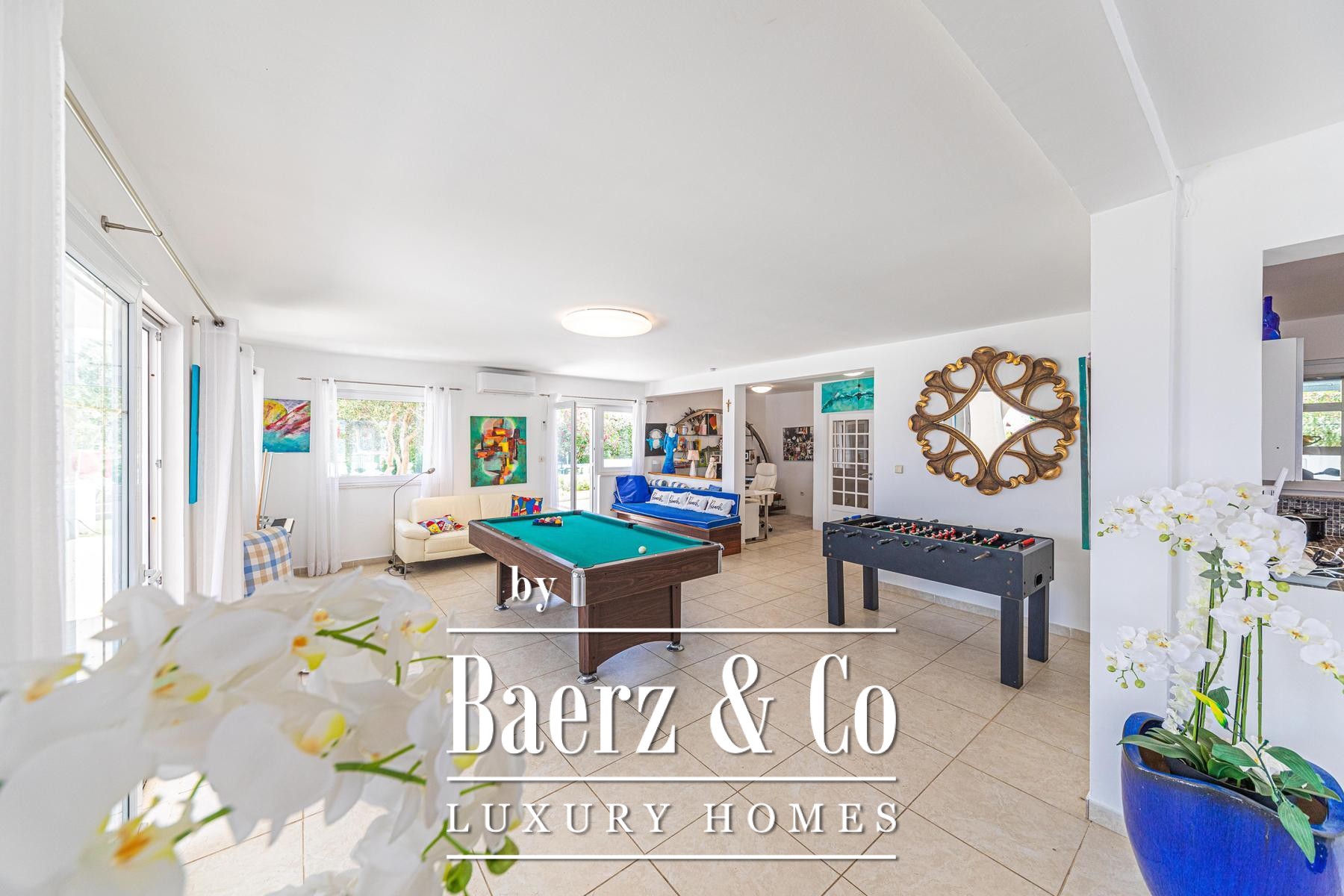 De ruime woonvertrekken lopen naadloos over in twee terrassen, elk ontworpen om optimaal zicht op zee te bieden en plaats te bieden aan dineren, ontspannen en buiten koken. Een zwembad, omringd door aparte barbecue- en loungezones, zorgt voor een ingetogen gevoel van privacy. Onder deze terrassen bevindt zich nog een garage en extra bergruimte met directe toegang tot het strand, ideaal voor boten, watersportuitrusting en ligstoelen.