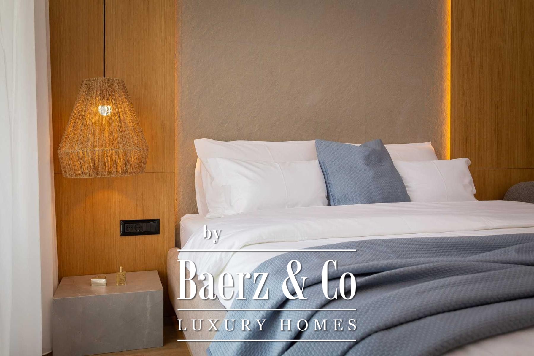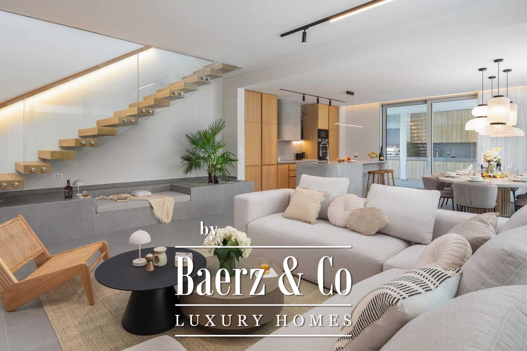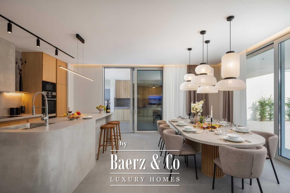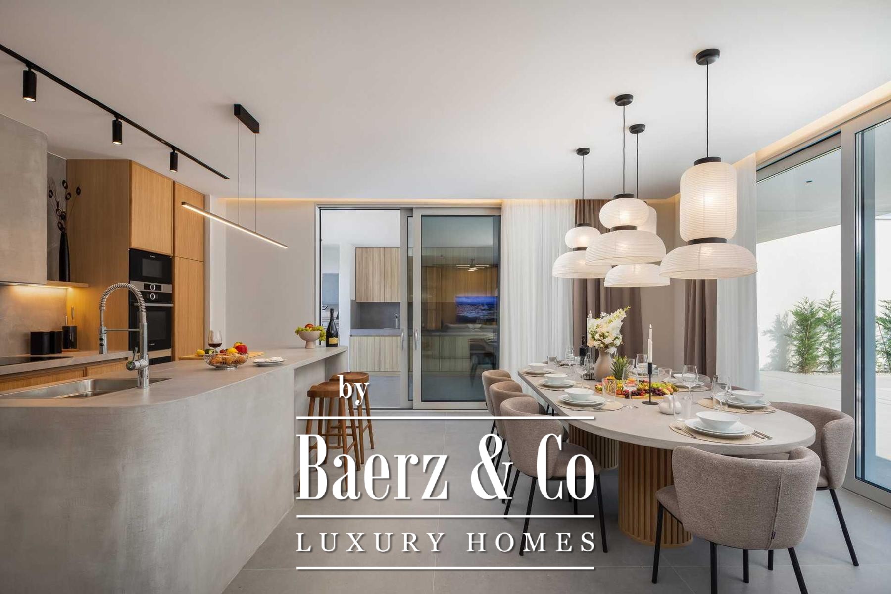 De entree leidt naar een zorgvuldig ontworpen begane grond, waar een fitnessruimte met sauna en een badkamer het welzijn centraal stellen. De open keuken, eetkamer en woonkamer worden gekenmerkt door grote glazen wanden die het daglicht rijkelijk laten binnenstromen en het binnenleven naadloos verbinden met buiten. Overdekte terrassen grenzen aan zowel de keuken als de woonkamer en voeren naar een verwarmd zwembad en een aangelegd zonneterras.