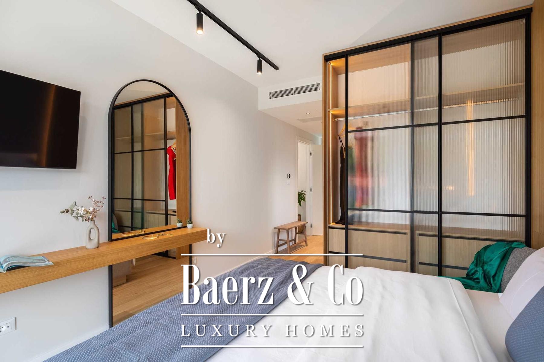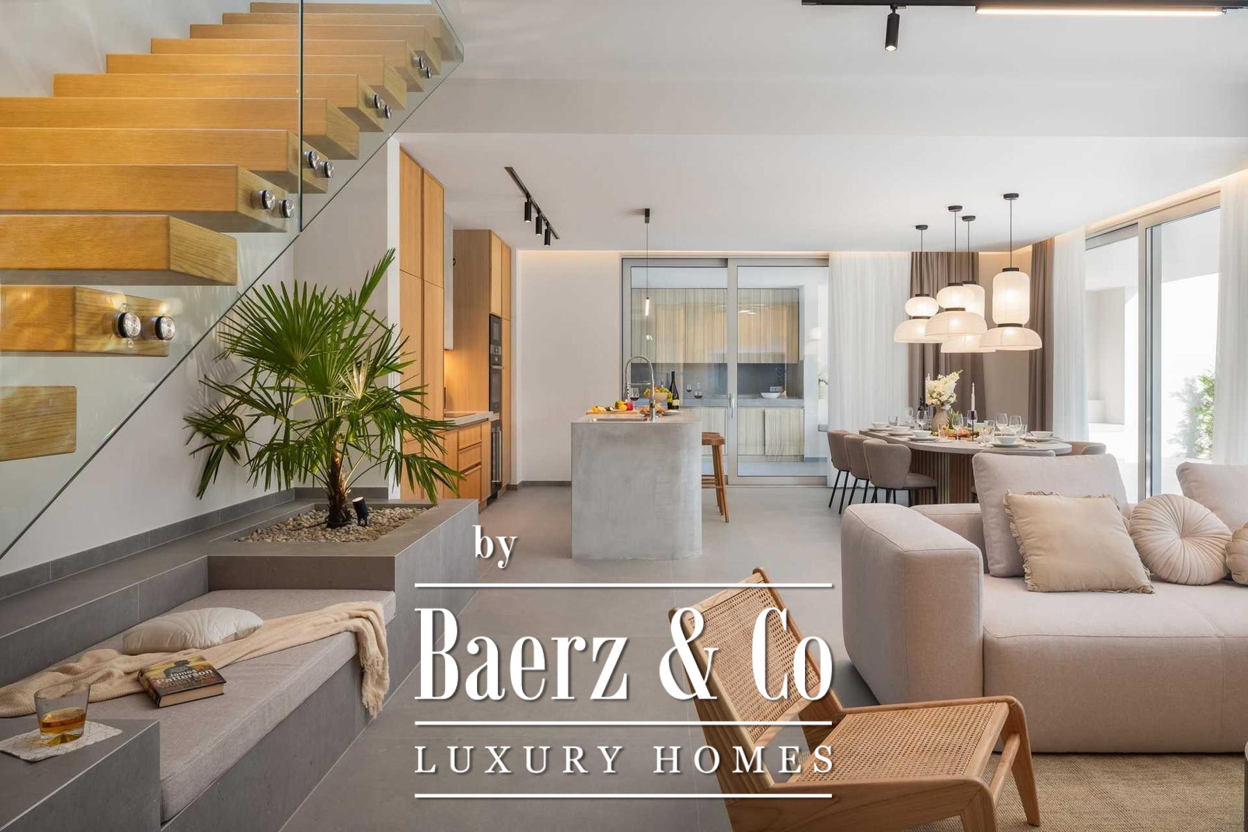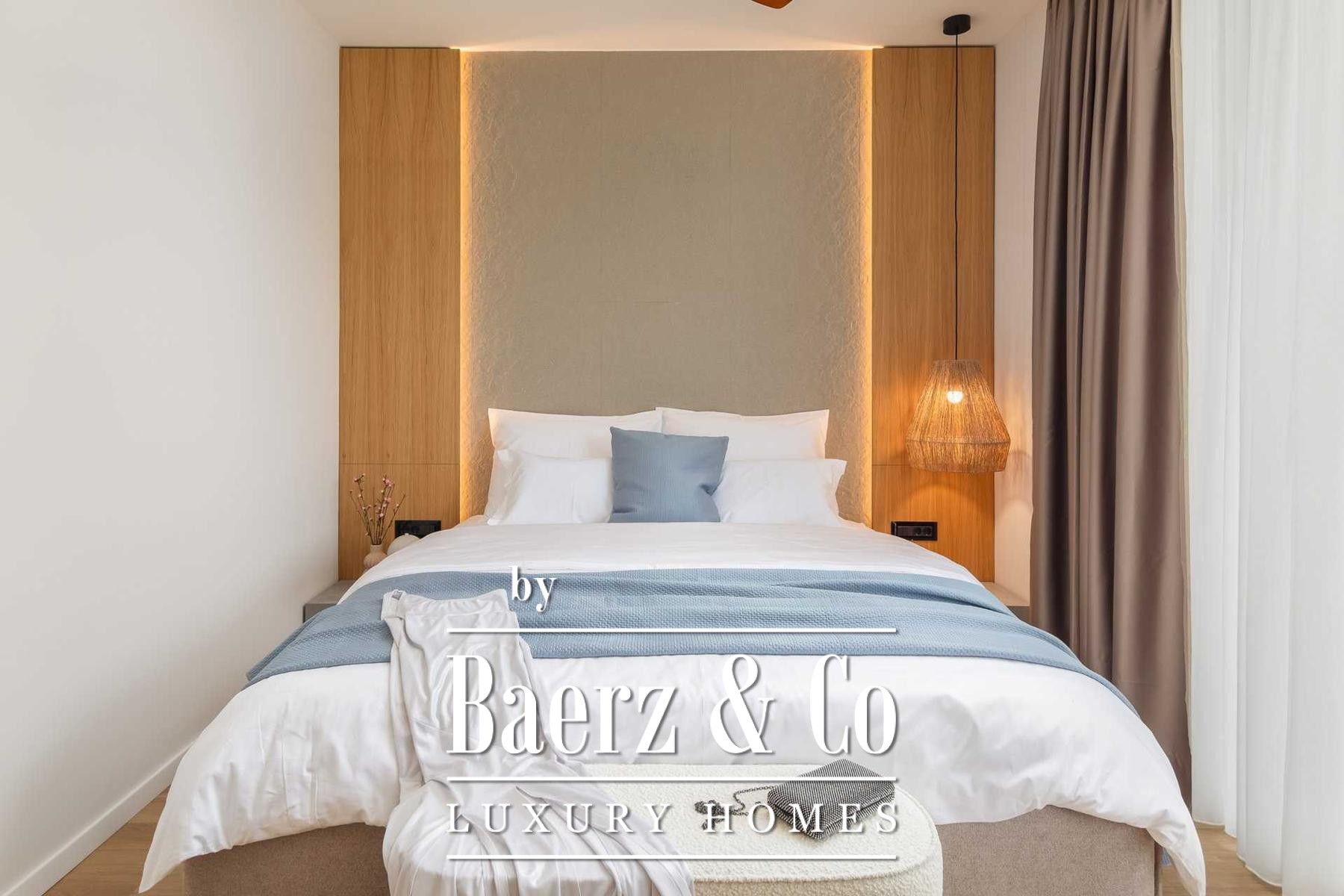 De entree leidt naar een zorgvuldig ontworpen begane grond, waar een fitnessruimte met sauna en een badkamer het welzijn centraal stellen. De open keuken, eetkamer en woonkamer worden gekenmerkt door grote glazen wanden die het daglicht rijkelijk laten binnenstromen en het binnenleven naadloos verbinden met buiten. Overdekte terrassen grenzen aan zowel de keuken als de woonkamer en voeren naar een verwarmd zwembad en een aangelegd zonneterras.