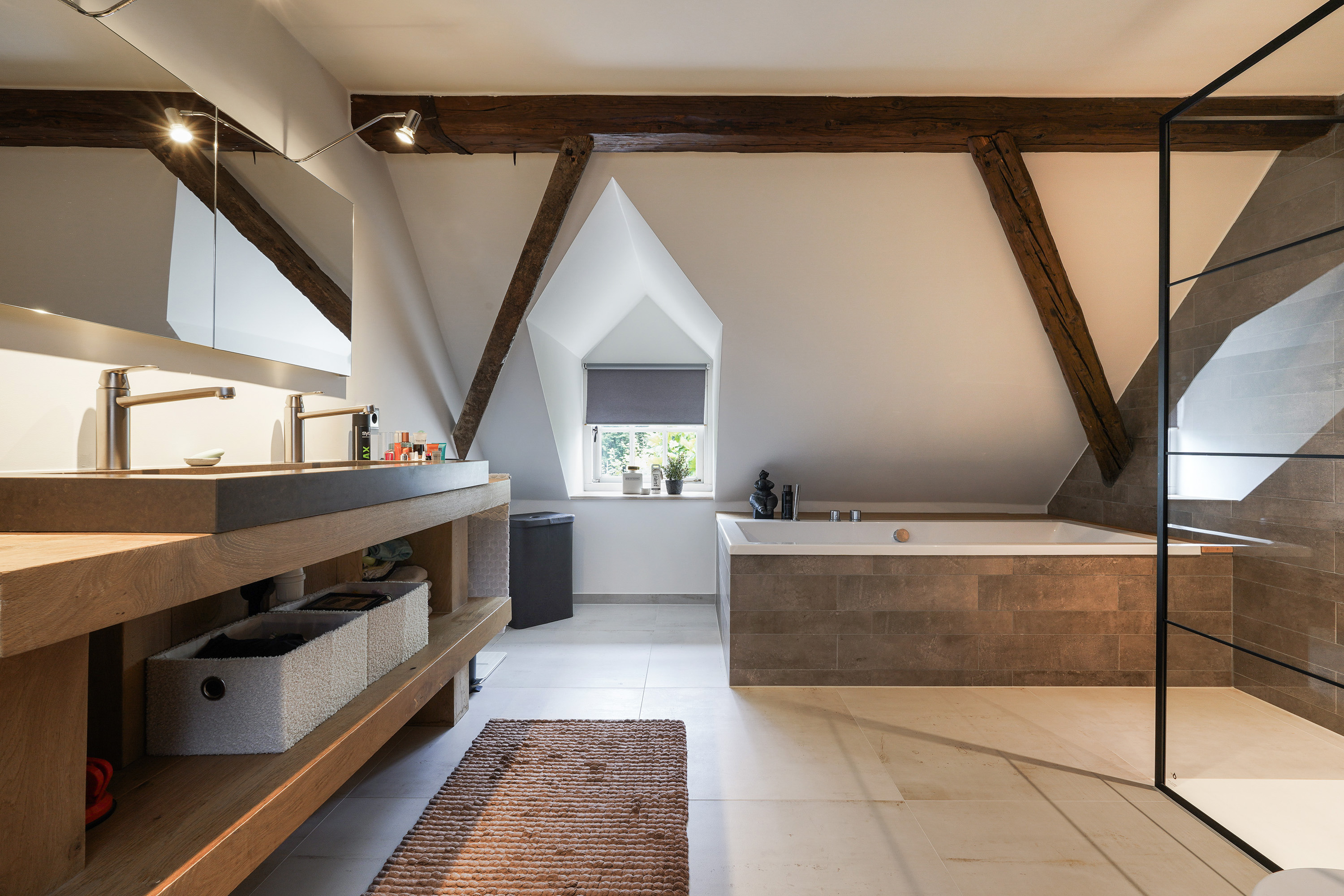 Aansluitend aan de woonkamer leidt een brede gang naar drie (slaap)kamers, waarvan één met toegang tot een praktische inloopkast. De moderne in 2024 gerealiseerde badkamer is stijlvol en compleet uitgevoerd met ligbad, inloopdouche en een fraai wastafelmeubel van hout met hardstenen wastafel en dubbele kranen.