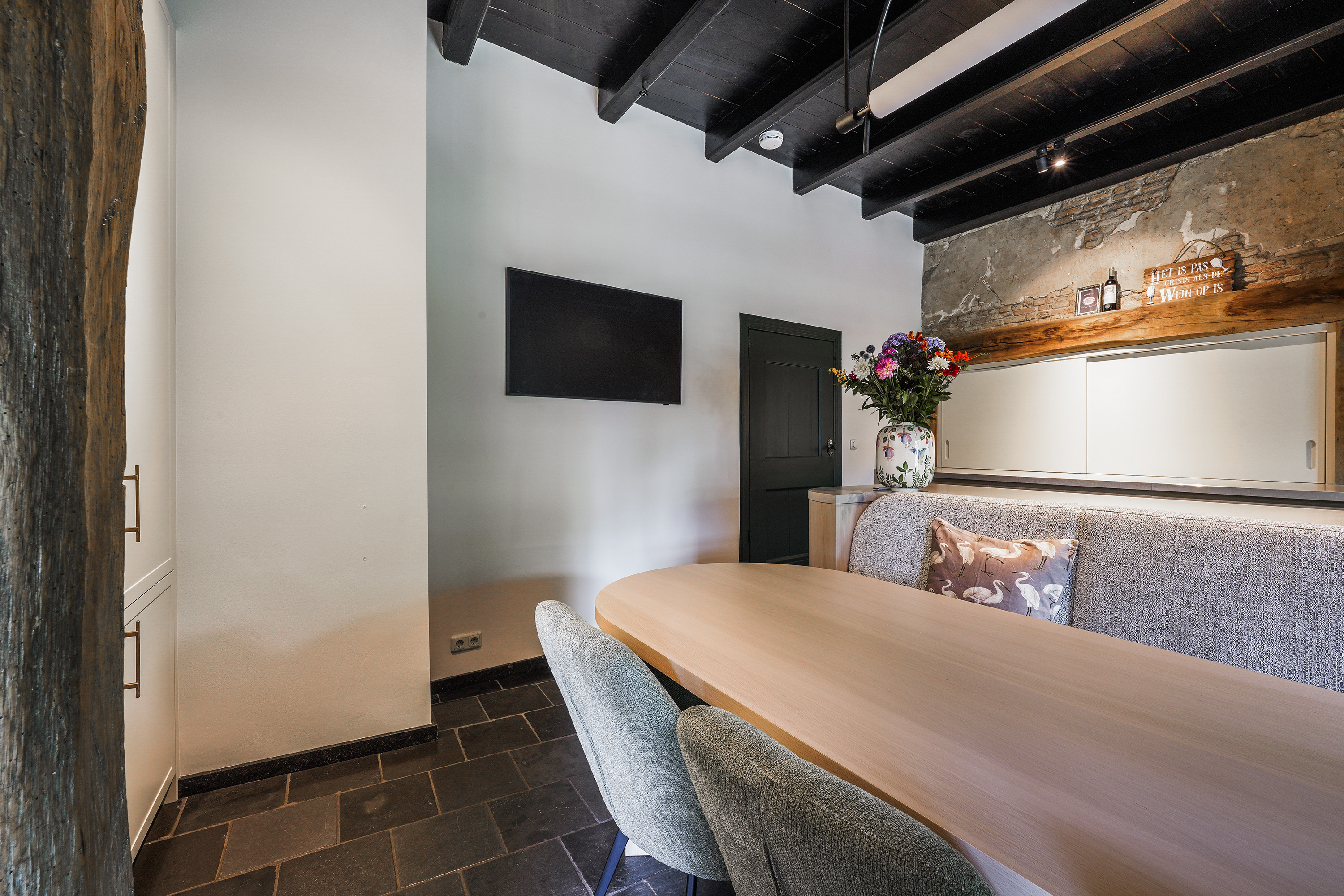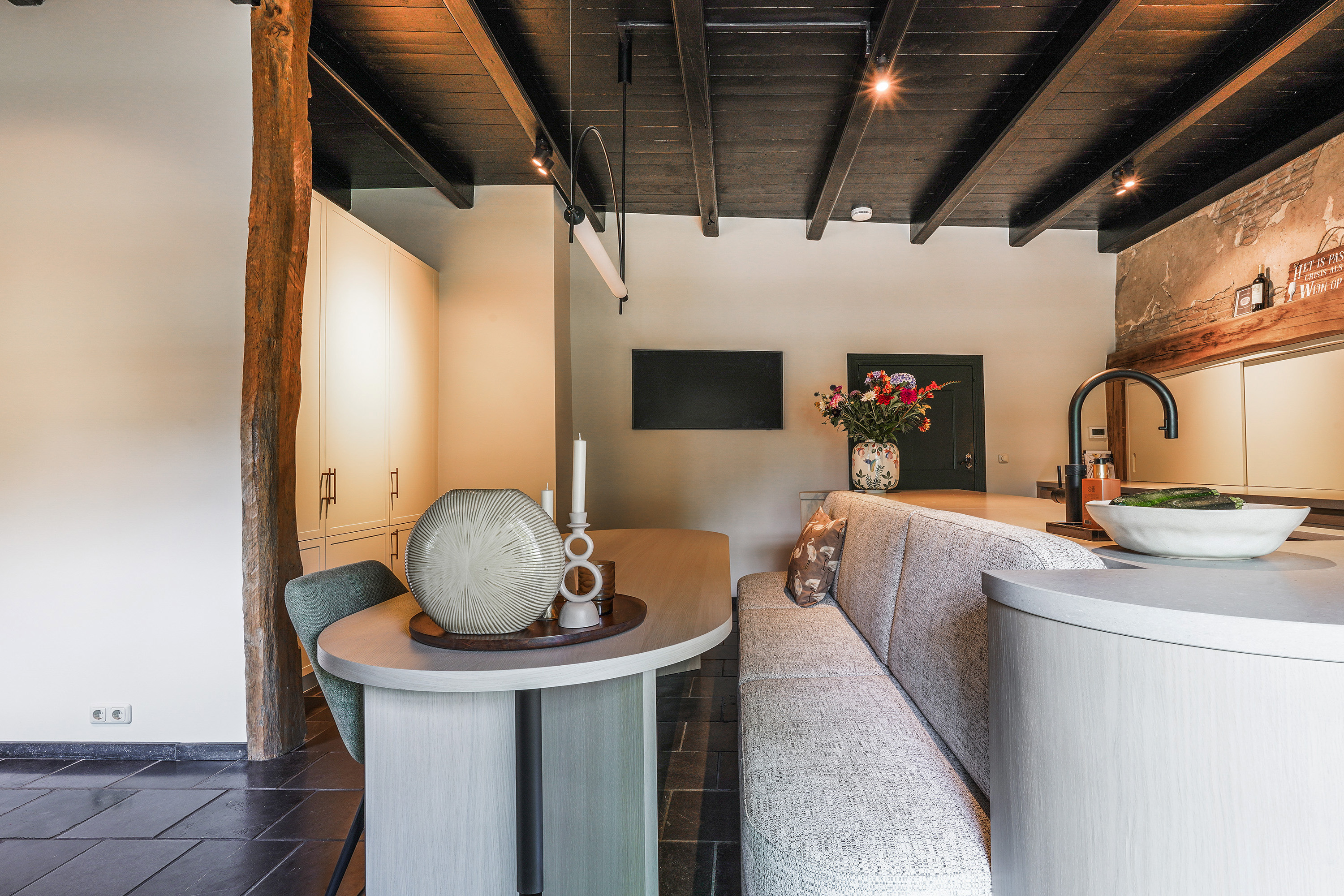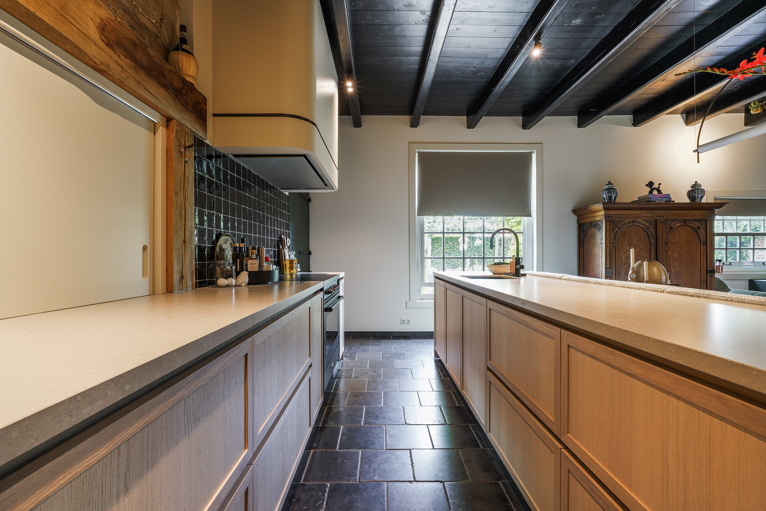 De woonkeuken vormt het hart van de woning en biedt uitzicht op de tuin. Via de twee royale entrees (aan de voorzijde en de zijkant) kom je direct in deze ruimte binnen. In 2024 is de keuken compleet vernieuwd door Ecker Interieurbouw. Het resultaat is een warme, stijlvolle leefkeuken met moderne apparatuur, veel werk- en bergruimte, maatwerk kasten en een doordachte indeling. De lange eetkamerbank sluit prachtig aan op het spoeleiland en de bijpassende op maat gemaakte tafel biedt plaats aan een groot gezelschap. Het is een plek waar koken, borrelen en tafelen moeiteloos samenkomen, een ruimte waarin je met gemak uren doorbrengt. Via een trap staat de keuken in verbinding met de woonkamer op de verdieping.