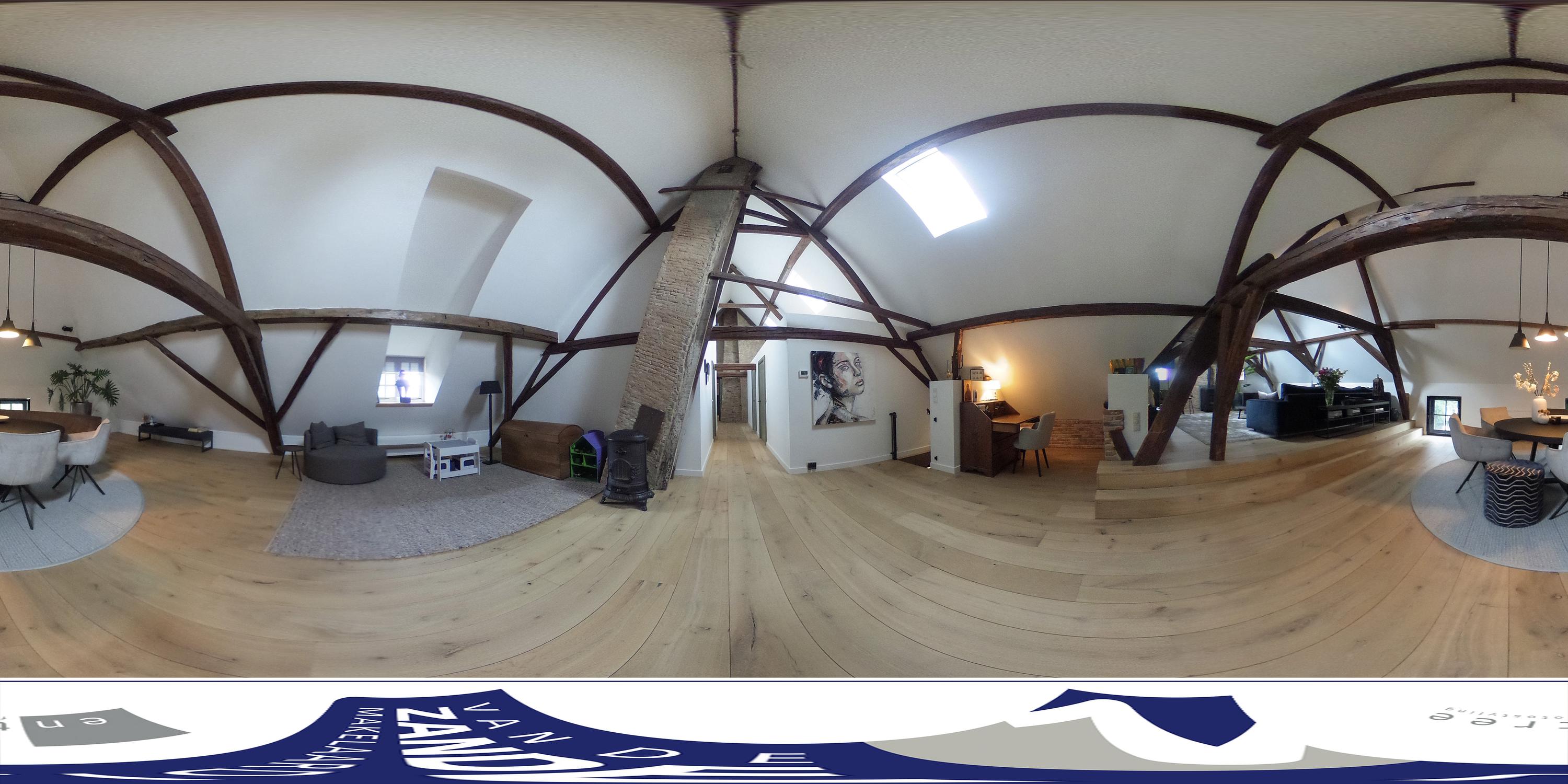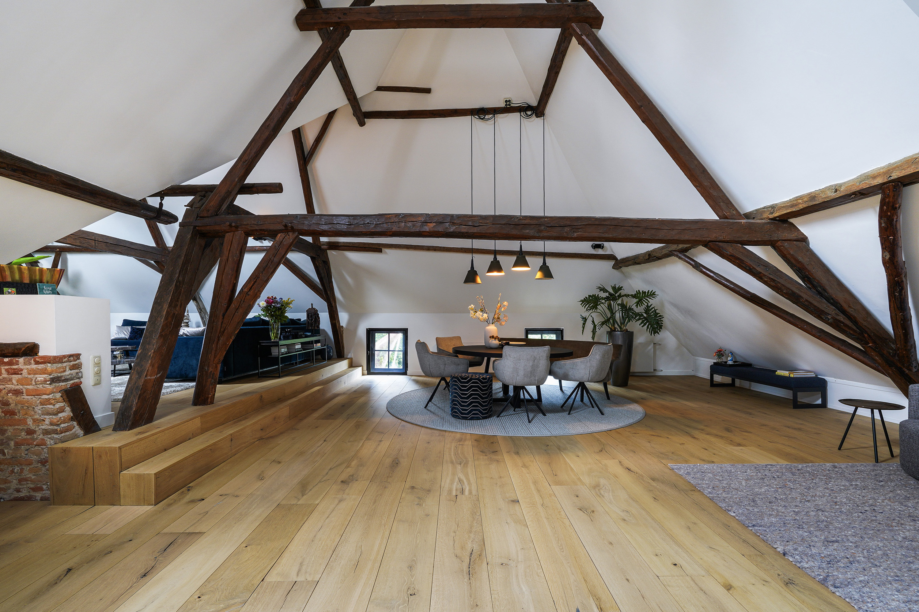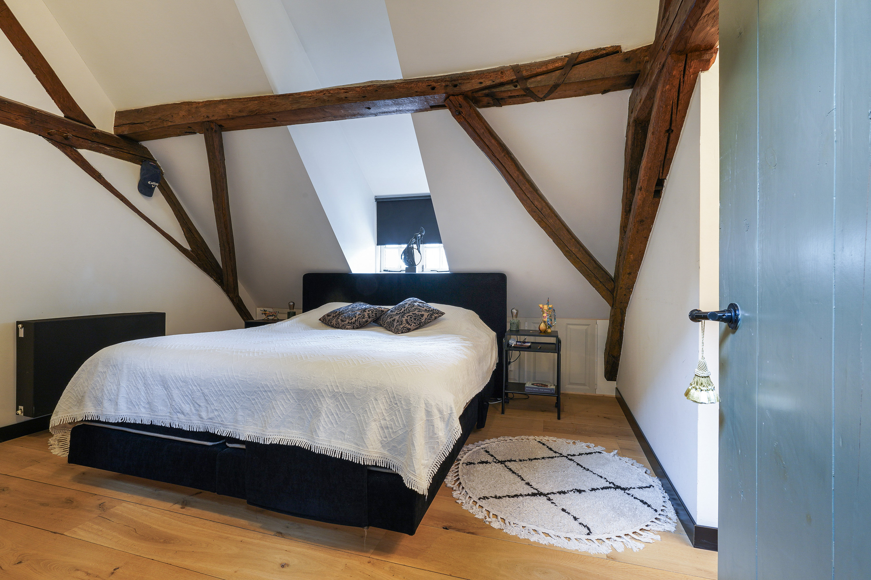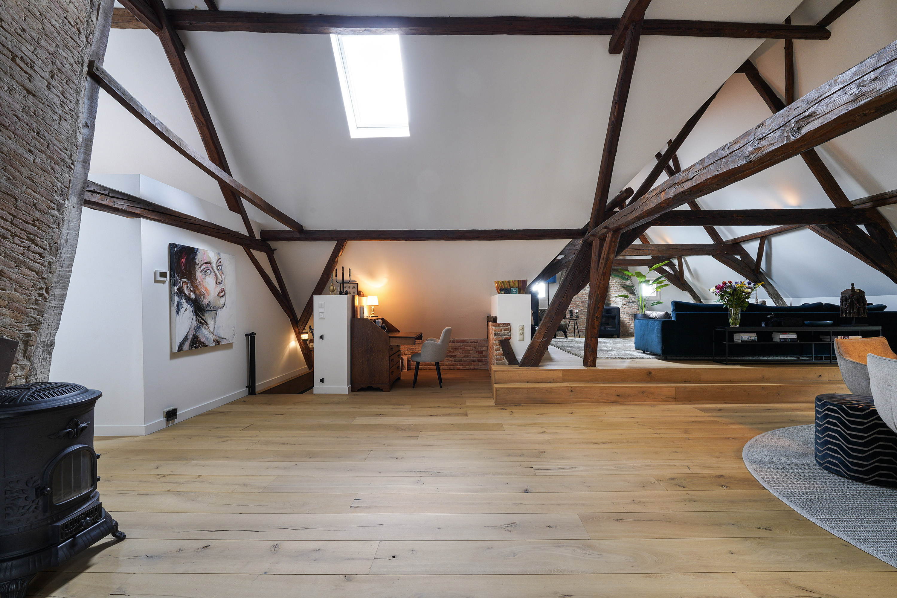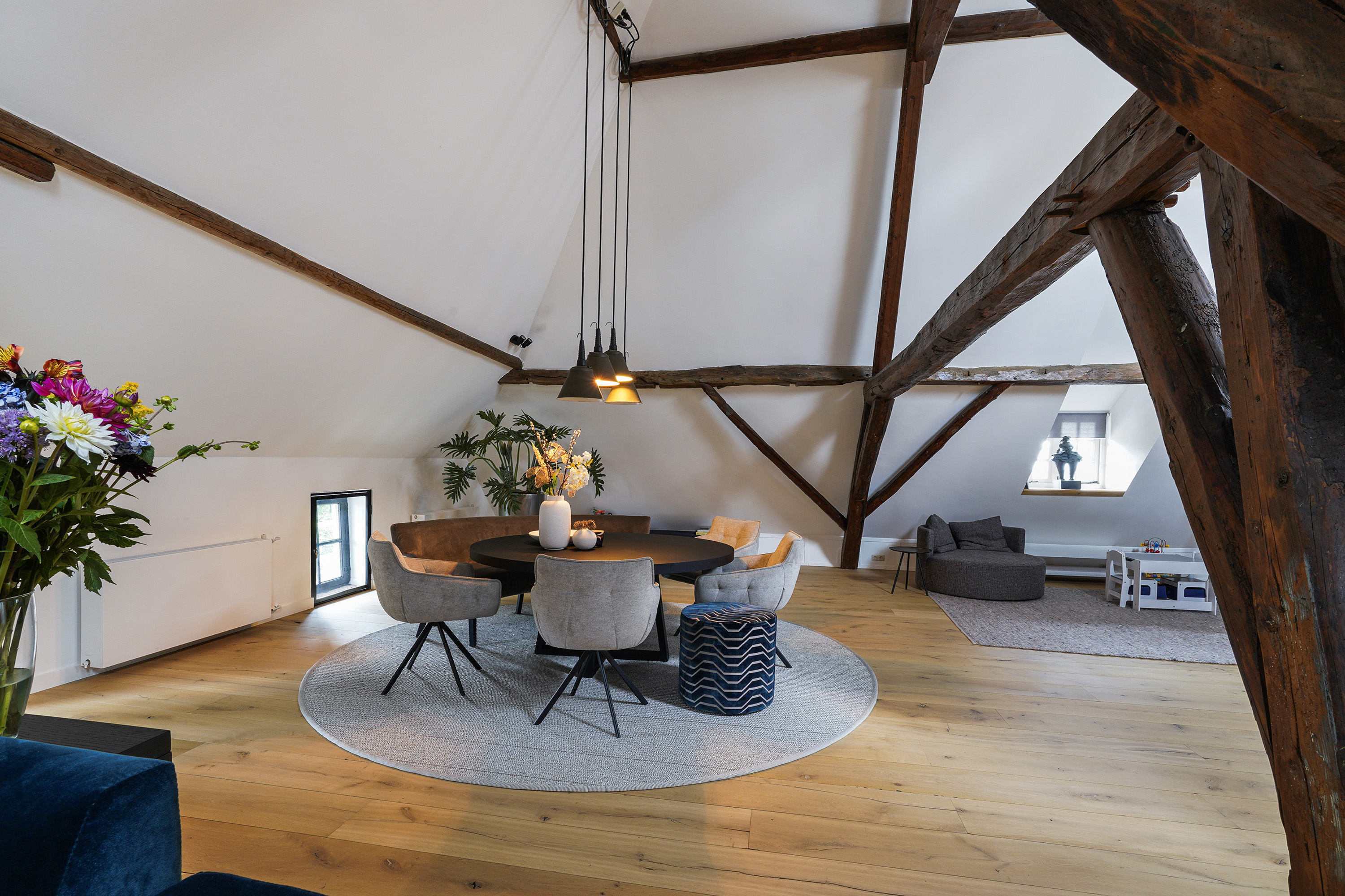 De woonkamer heeft een indrukwekkende oppervlakte van bijna 90 m² en voelt door de hoogte tot in de nok nog ruimer aan. De kap is geïsoleerd en fraai afgewerkt met wit stucwerk tussen de robuuste houten balken. Samen met het hoogteverschil, de houten vloer en de pelletkachel ontstaat een sfeervolle leefruimte die groots en toch warm aanvoelt.