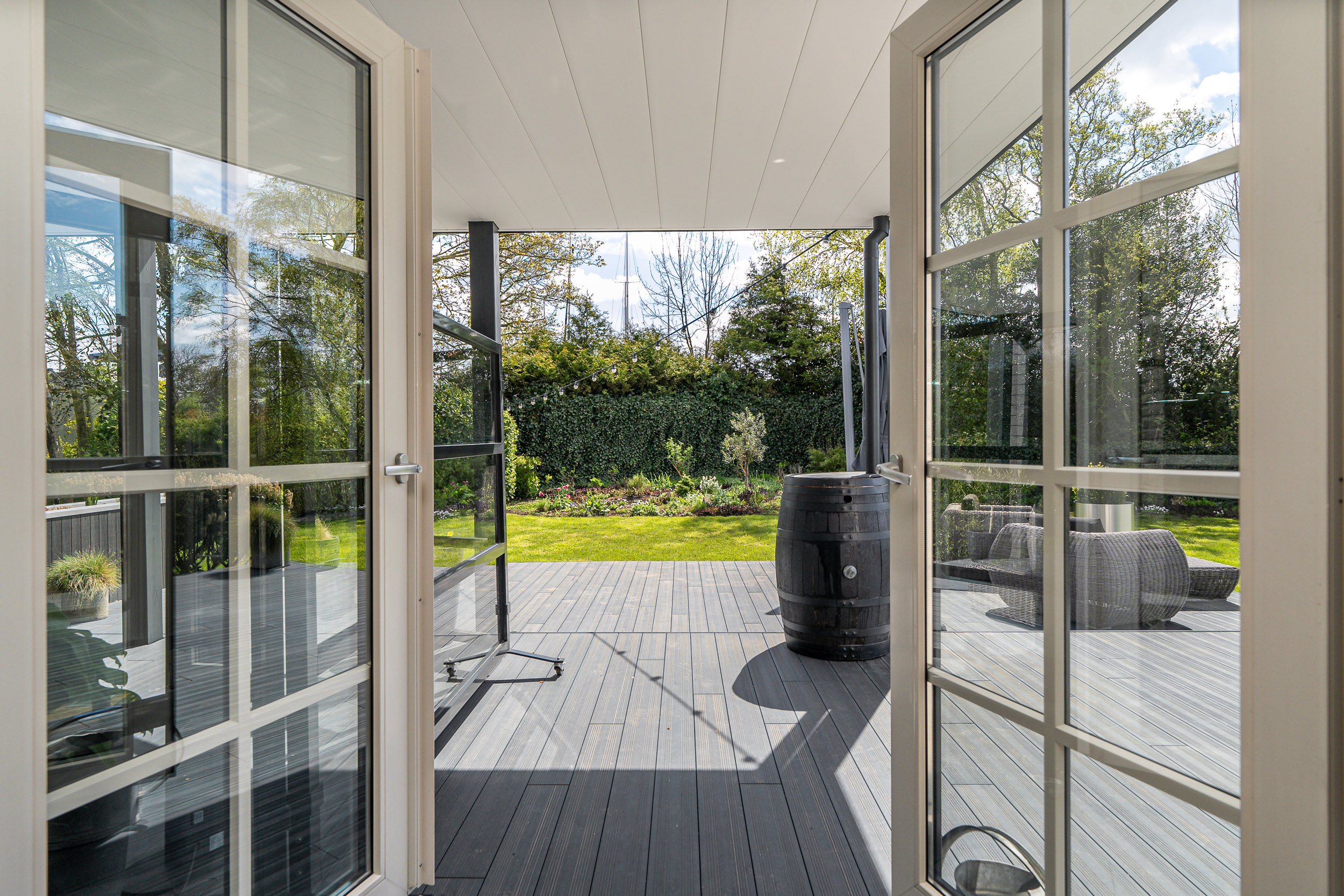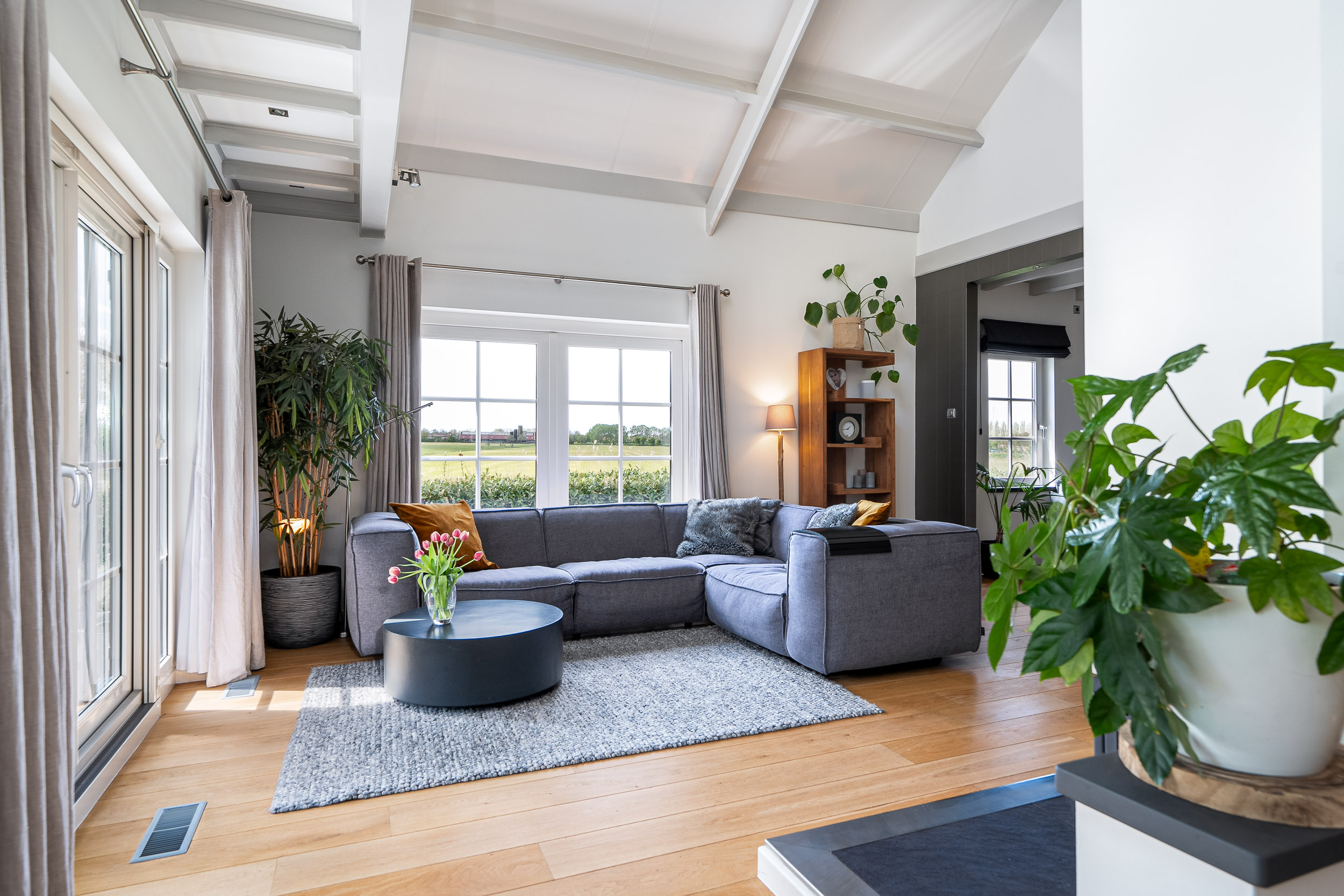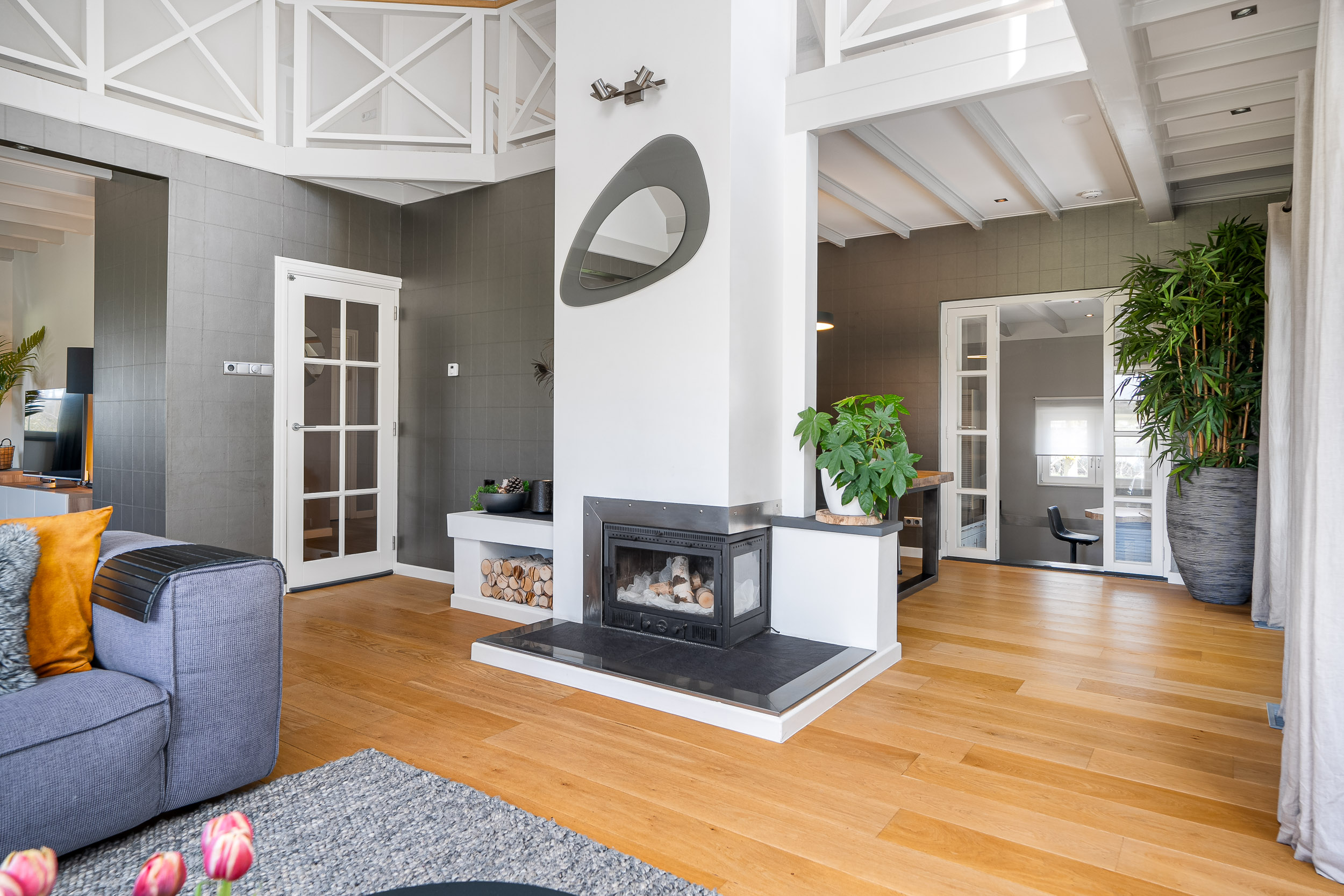 De woonkamer krijgt door de vele raampartijen en de vide veel licht en het uitzicht door elk raam is gefocust op de natuur. De adembenemende vergezichten vervelen hier nooit. De woonkamer heeft diverse sfeerhoeken als een zithoek rond de houthaard, een entertainment hoek en een eethoek. Er ligt een prachtige warme houten vloer voorzien van hete lucht verwarming en de openslaande tuindeuren geven direct toegang tot de gezellige veranda en het terras dat rondom alle privacy biedt.
