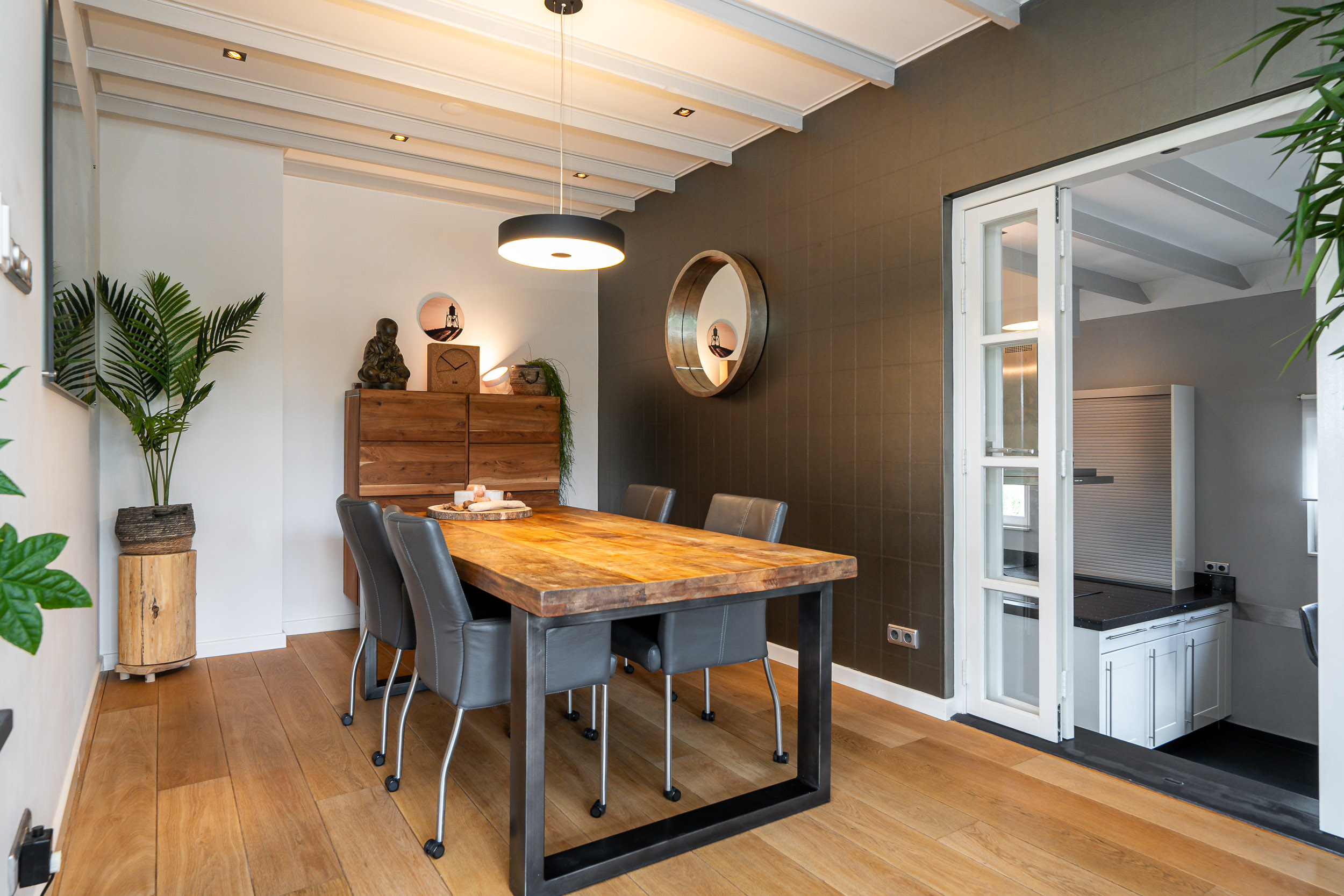 De halfopen woonkeuken is voorzien van diverse inbouwapparatuur en ook hier is een deur naar de tuin. Verwarming middels vloerverwarming. Er is voldoende plaats voor een eethoek in de keuken, maar ook het direct naast de halfopen keuken gelegen knusse woonkamer gedeelte biedt uitstekend ruimte voor een lange eettafel.