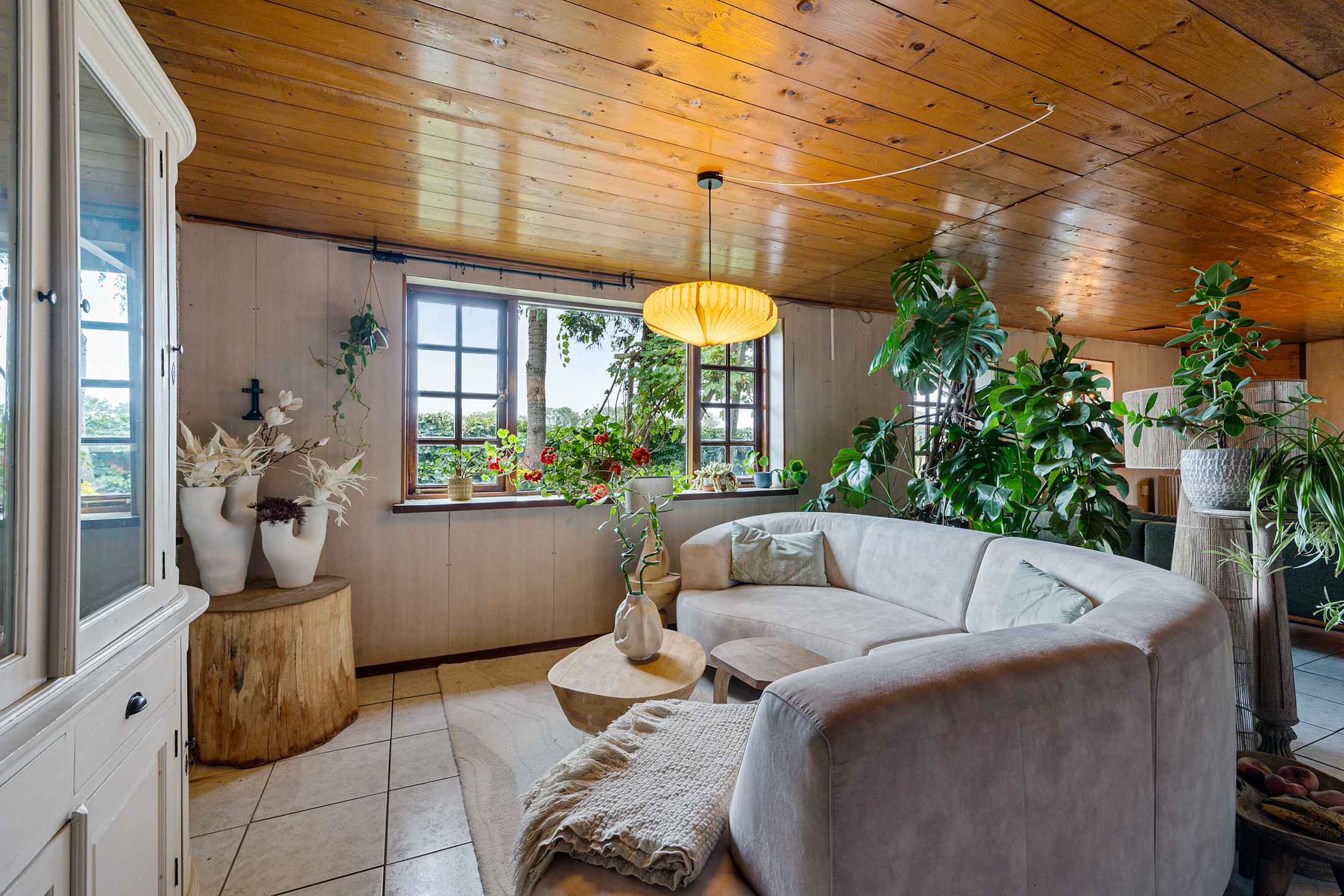 De sfeervolle L-vormige woonkamer beschikt over een houtkachel en biedt door de vele raampartijen een prachtig uitzicht over de tuin, terrassen, velden en het bos. Binnen en buiten vloeien hier naadloos in elkaar over.