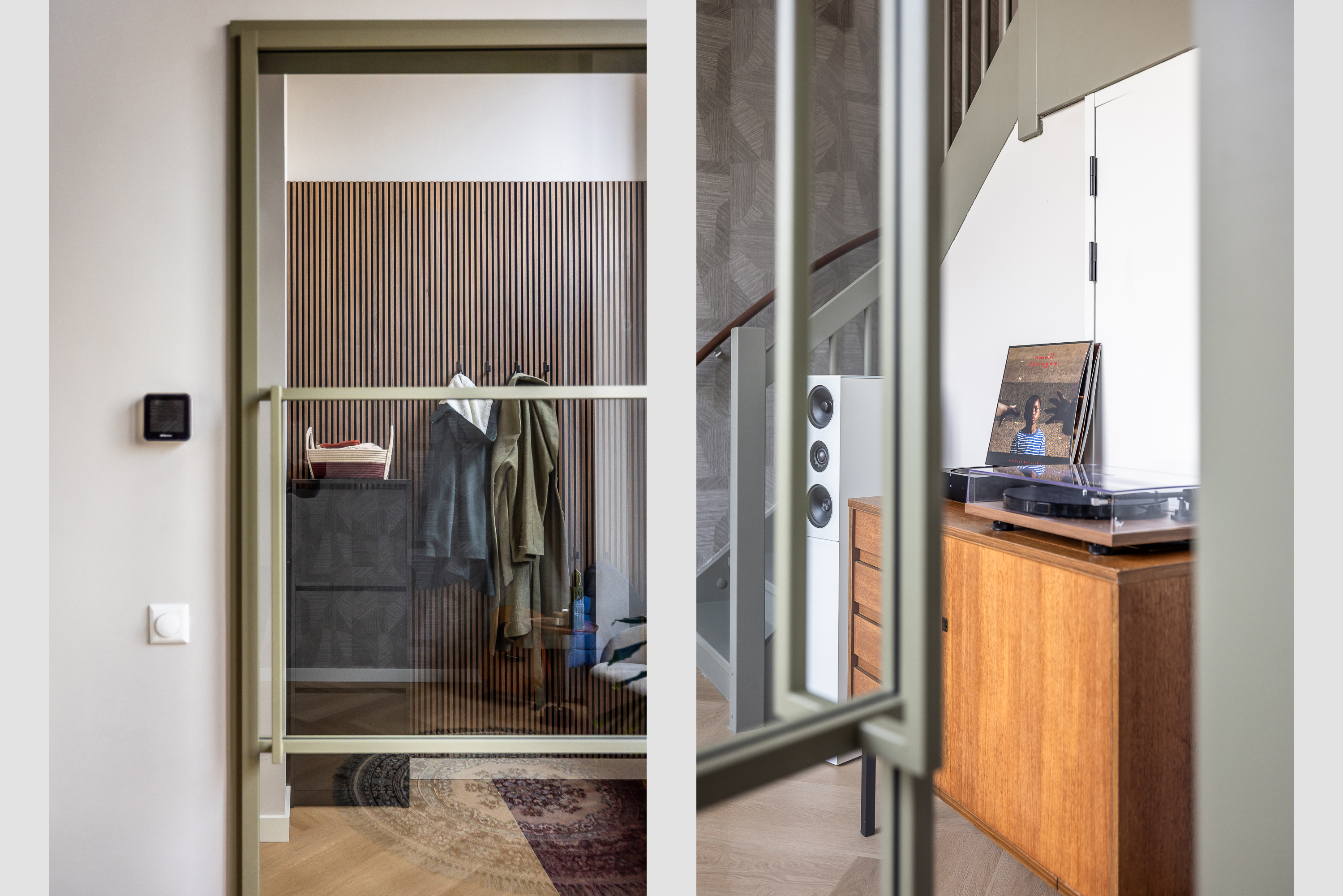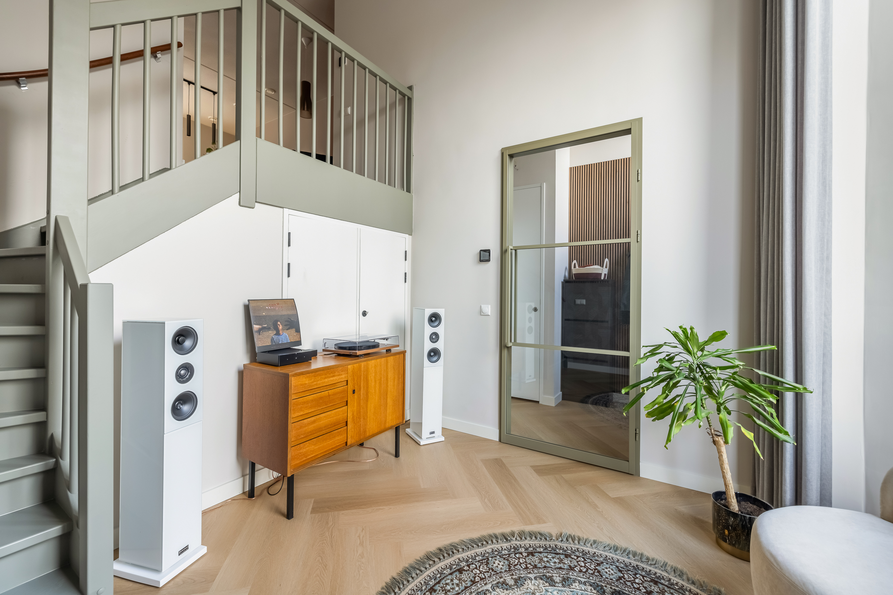 Zodra je binnenkomt, valt alles samen. De hoogte van de voorkamer is indrukwekkend. Met bijna vijf meter tot het plafond voelt deze ruimte groots, licht en vrij. De ramen lopen helemaal door tot boven en laten het daglicht op een bijna theatrale manier naar binnen vallen. Dit is zo’n ruimte die je niet hoeft in te richten, die vertelt zelf al een verhaal. Een plek waar je muziek maakt, yoga doet, werkt, speelt of gewoon even zit en naar de lucht kijkt terwijl de kleuren van de dag veranderen.