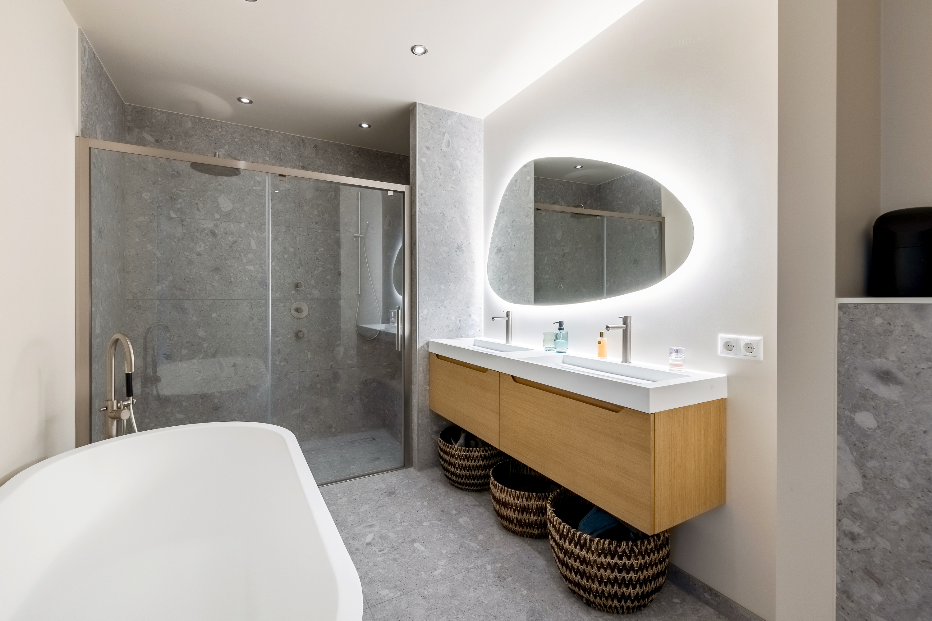 Overloop met grote bergkast. De badkamer is royaal en modern uitgevoerd met ligbad, dubbele douche en dubbele wastafel. Op deze verdieping zijn twee ruime slaapkamers, perfect als kinder, werk of logeerkamer.