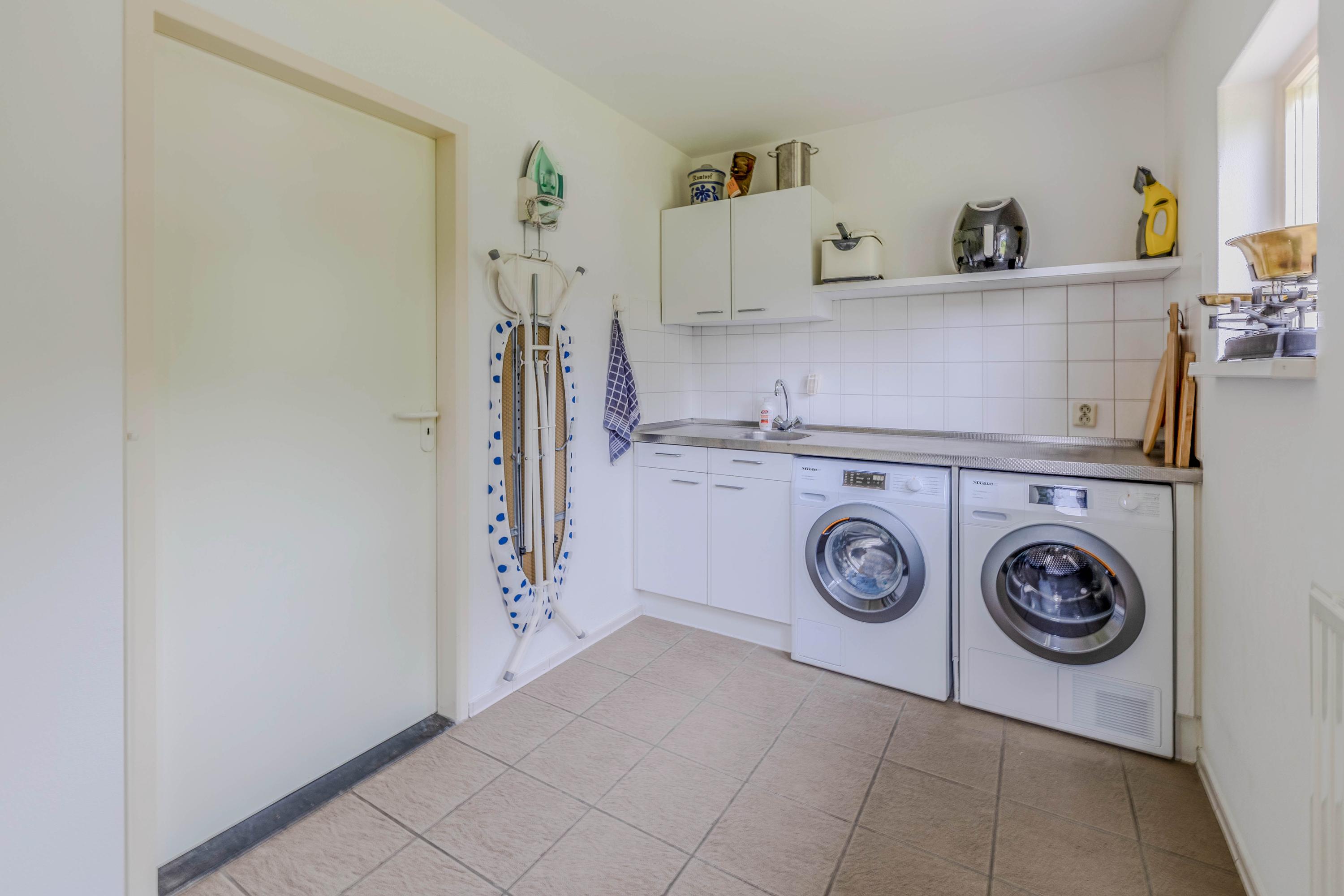De garage (ca. 21m²) kunt u bereiken via de bijkeuken. Deze is voorzien van verwarming, gootsteen en elektra. Een grote kantelpoort biedt toegang tot de ruime oprit voor 2 auto’s en door middel van een aparte loopdeur bereikt u de zij- en achtertuin.