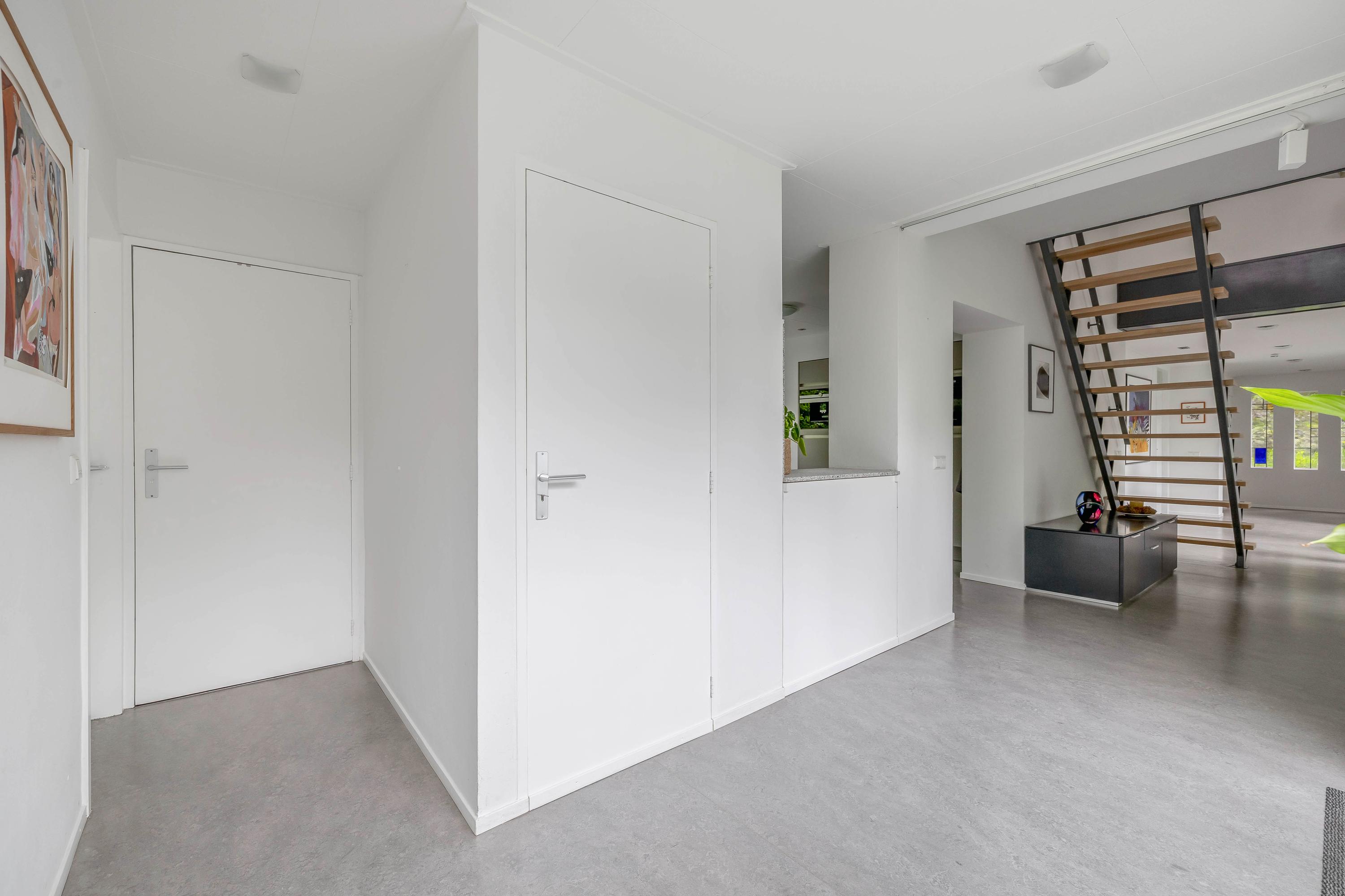 Je betreedt de woning via een royale, open entreehal met dubbele deuren. Deze beschikt over veel natuurlijke lichtinval dankzij de grote raampartijen.