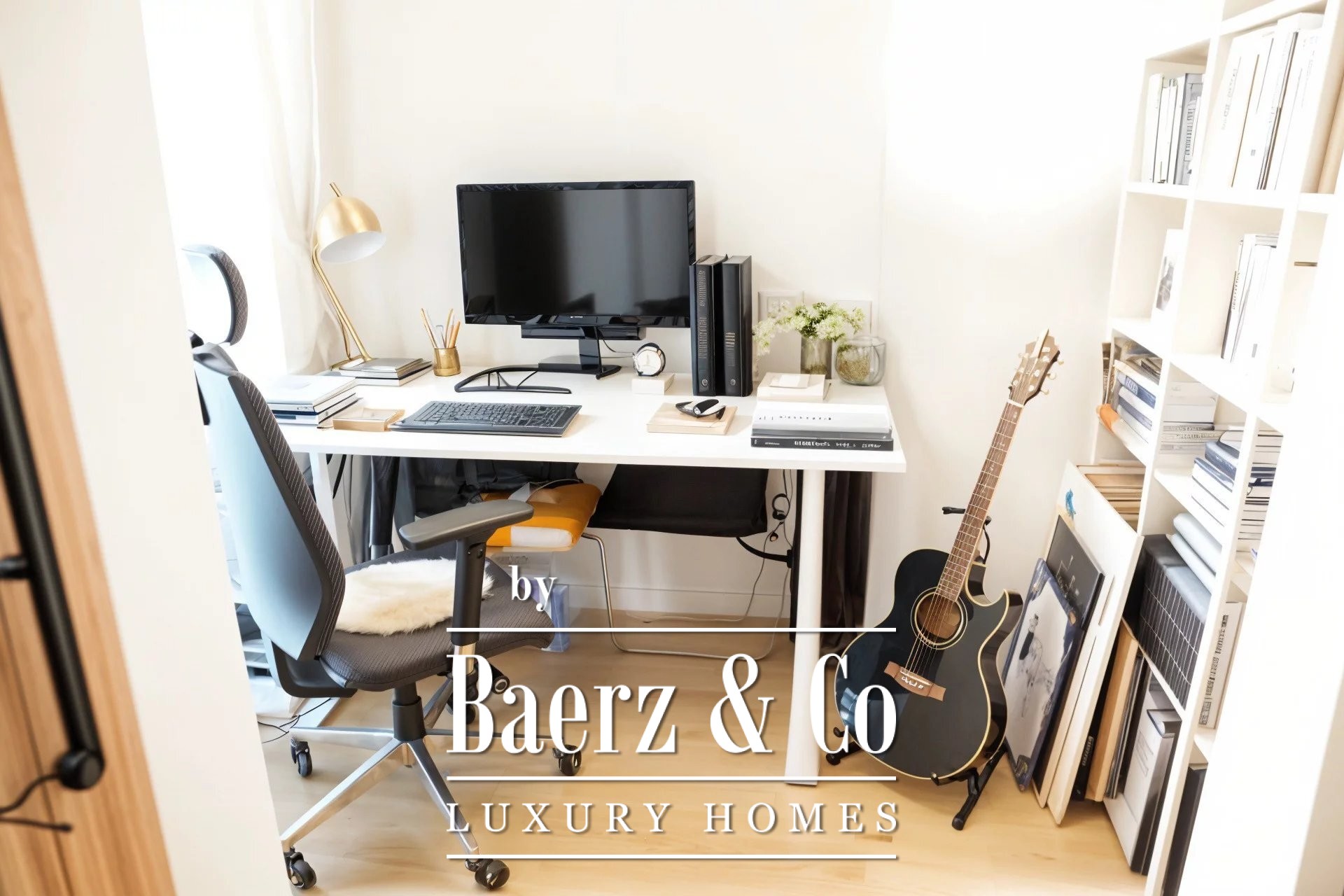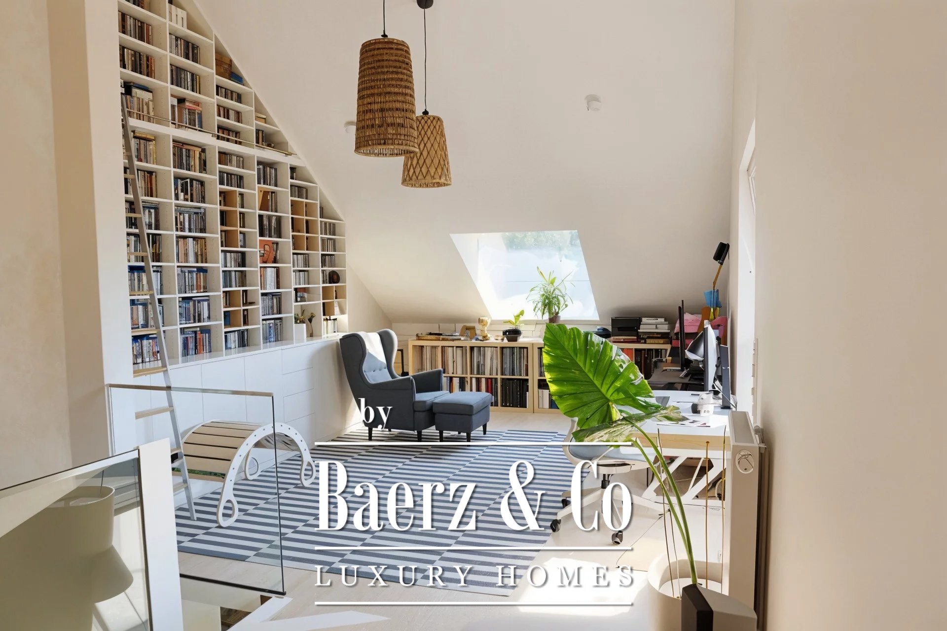 De zolder is omgebouwd tot een grote kantoor-bibliotheek van 37 m², een veelzijdige ruimte die een speelkamer, een logeerkamer of een ontspanningsruimte kan worden, afhankelijk van je wensen, ideaal voor degenen die kantoor aan huis houden.