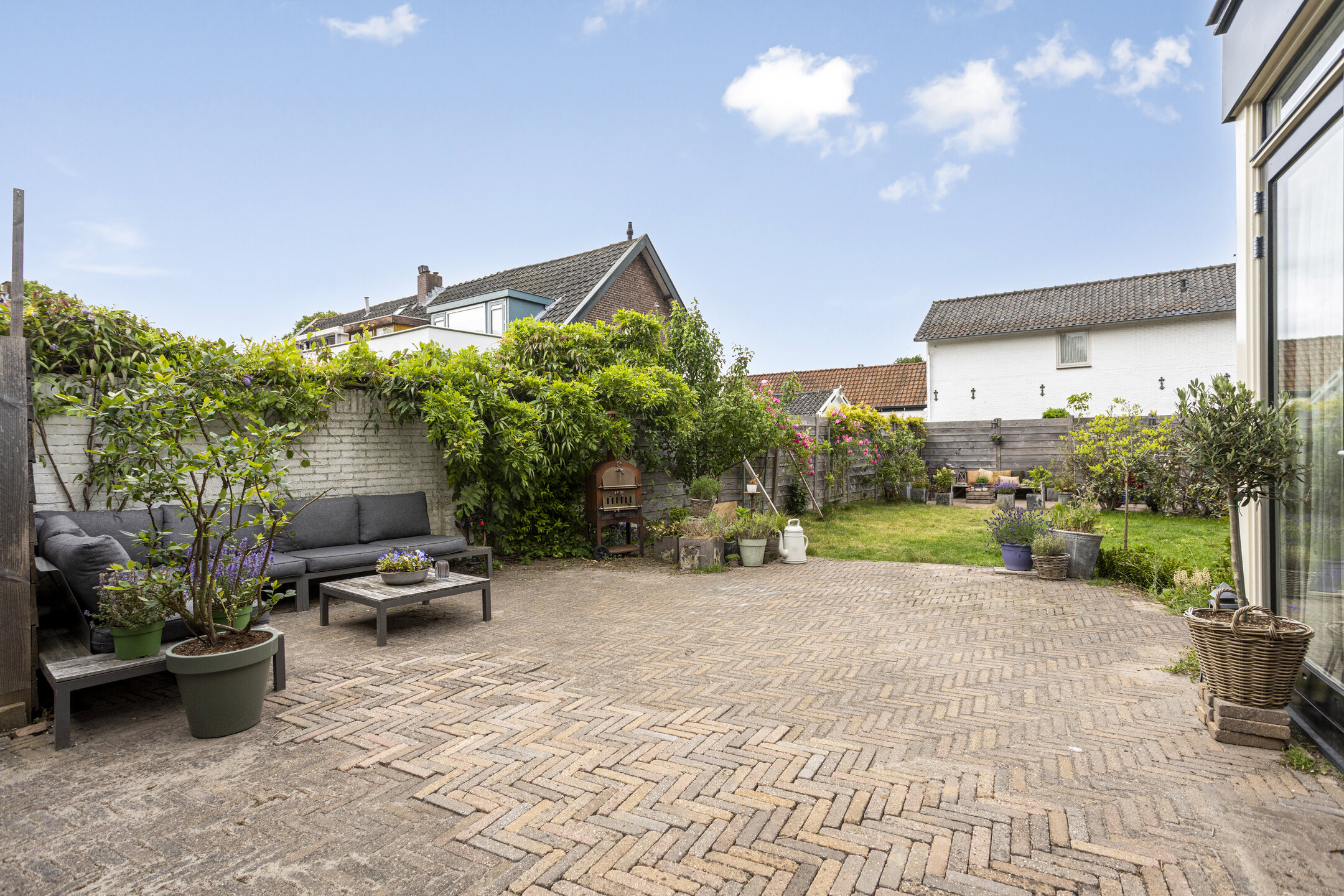 Zeer ruime, ommuurde tuin met veel privacy en een achterom met parkeerplaats. Een tweede parkeerplaats bevindt zich naast de voordeur.