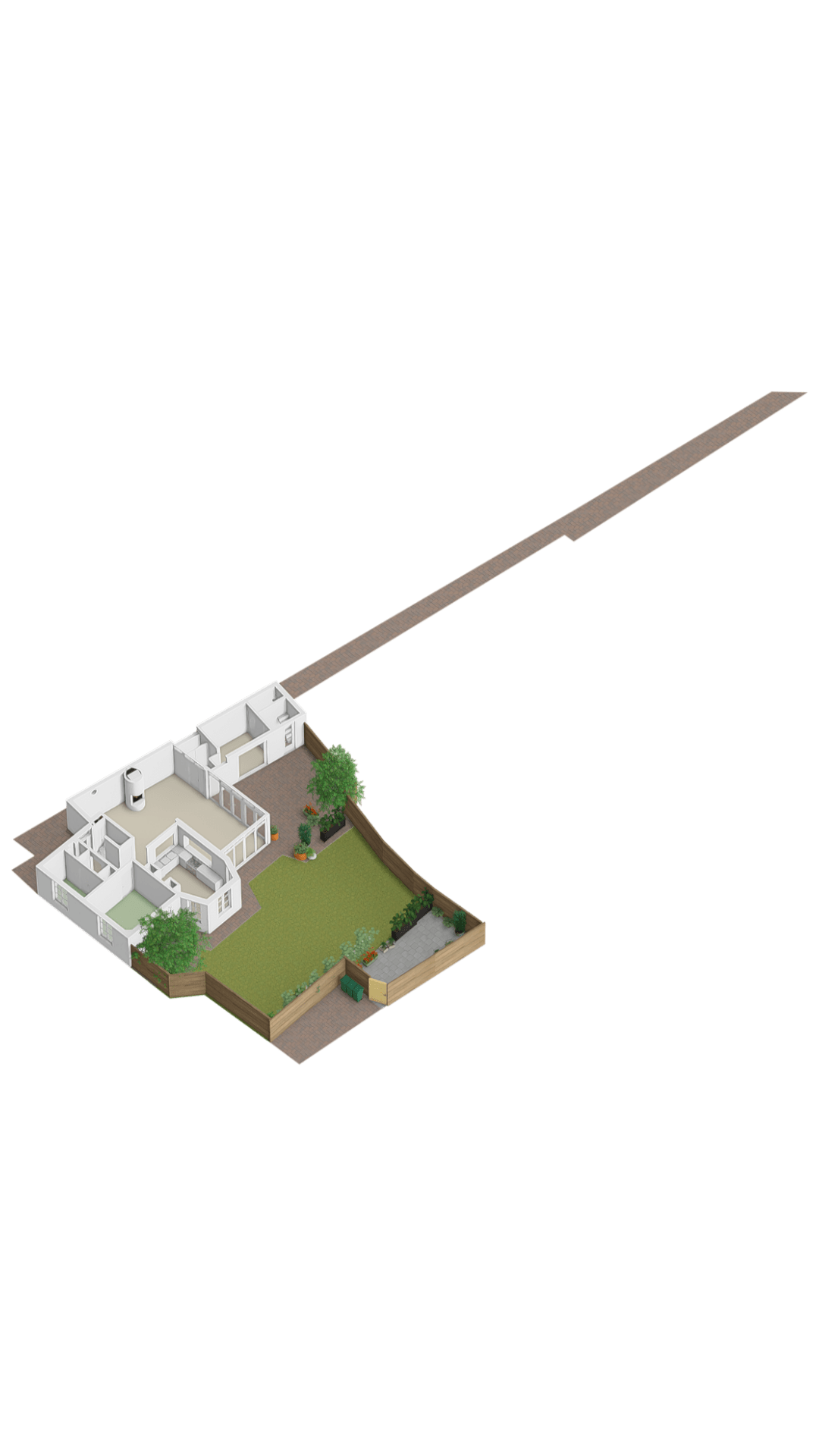 Begane grond: Eigen entree vanuit de tuin met hal en trap naar de 1e etage. Woonkamer, thans in gebruik als thuiskantoor, met badkamer met douche en toilet en was- en kastruimte in de binnendoor naar het woonhuis.