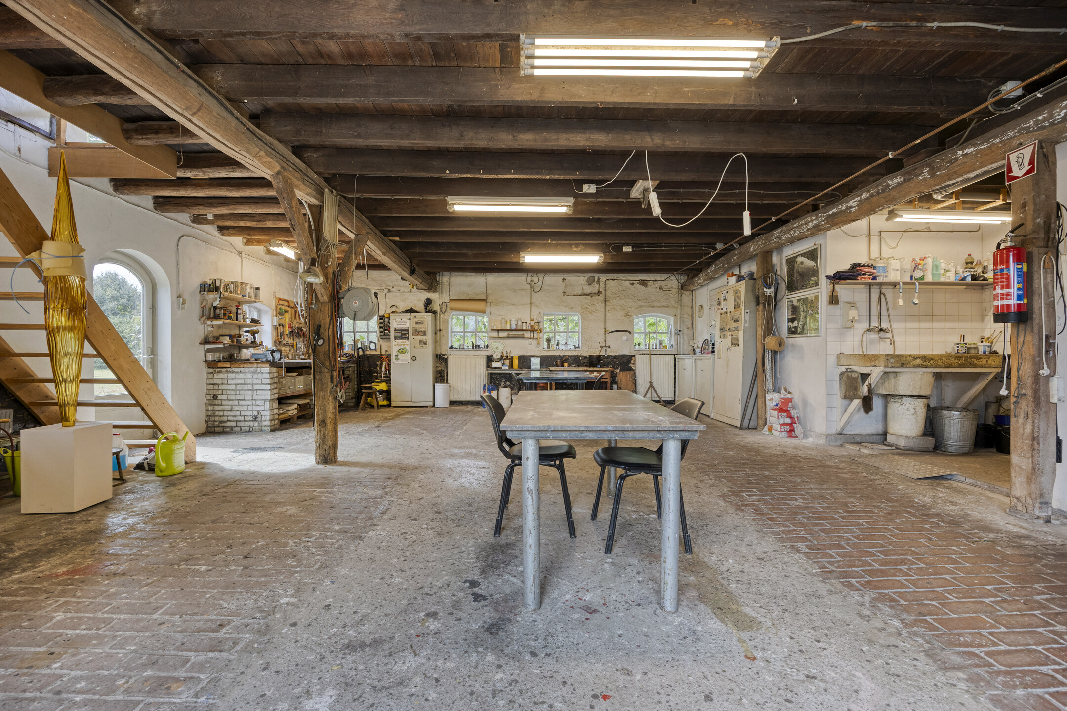 inpandig atelier als gesitueerd aan de voorzijde van de woonboerderij (ca. 87 m²), multifunctioneel in te richten / te gebruiken voor meerdere doeleinden, voorzien een keukenblok, een 2e trap naar de 1e verdieping, tuindeuren naar tuin/terras, loopdeur naar oprit, wandafwerking stucwerk, betonvloer en deels bestrating, balkenplafond.