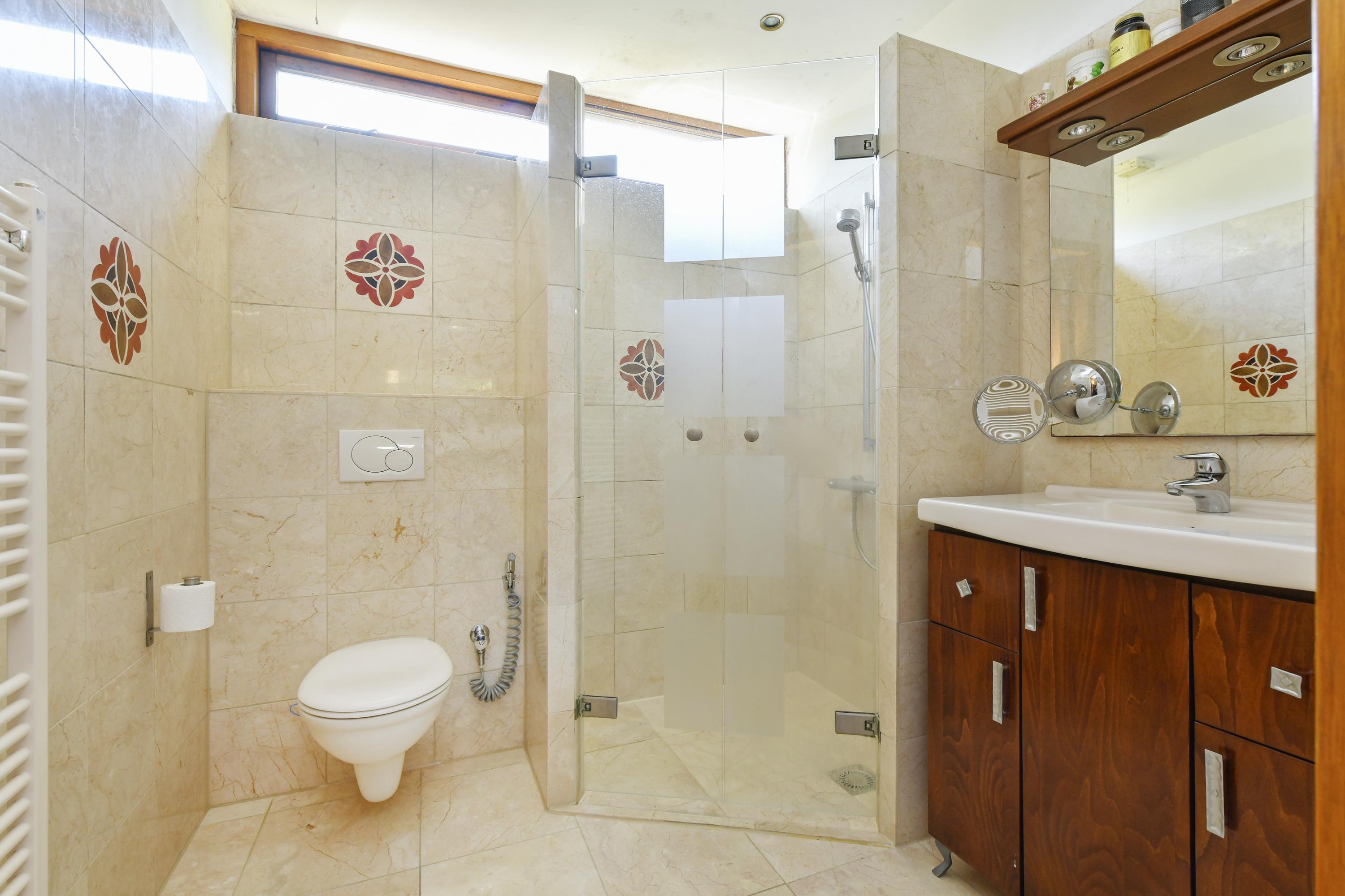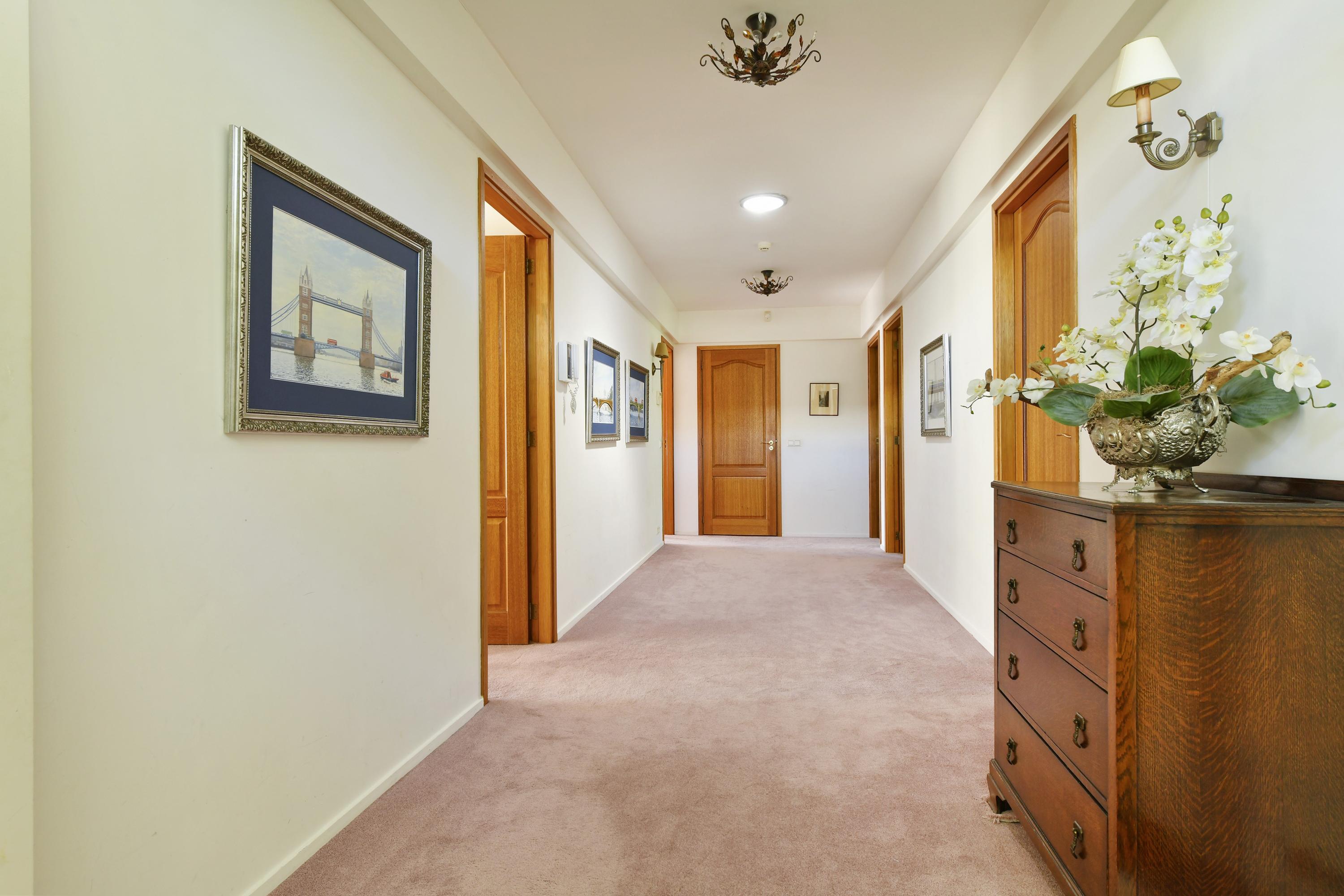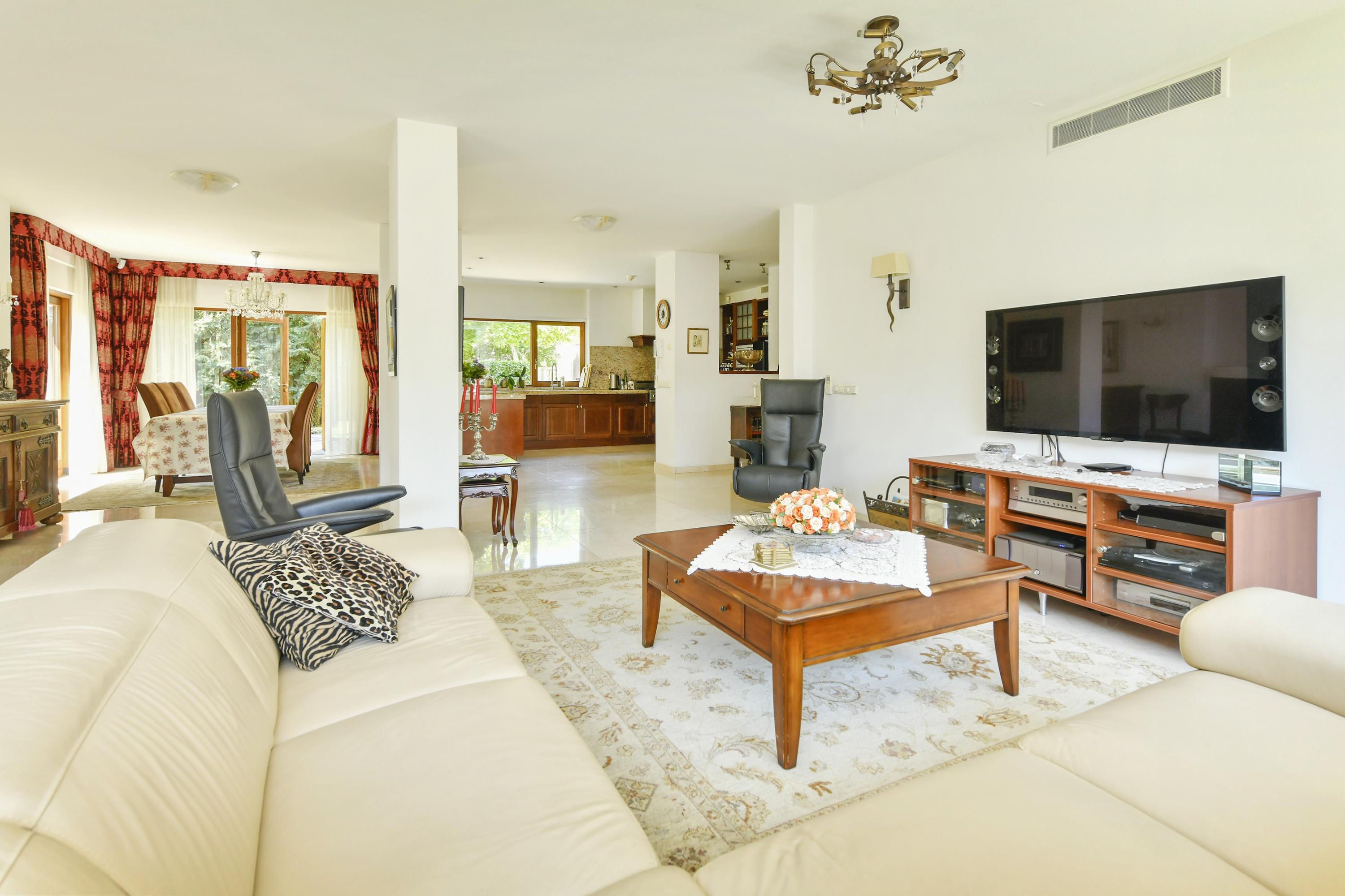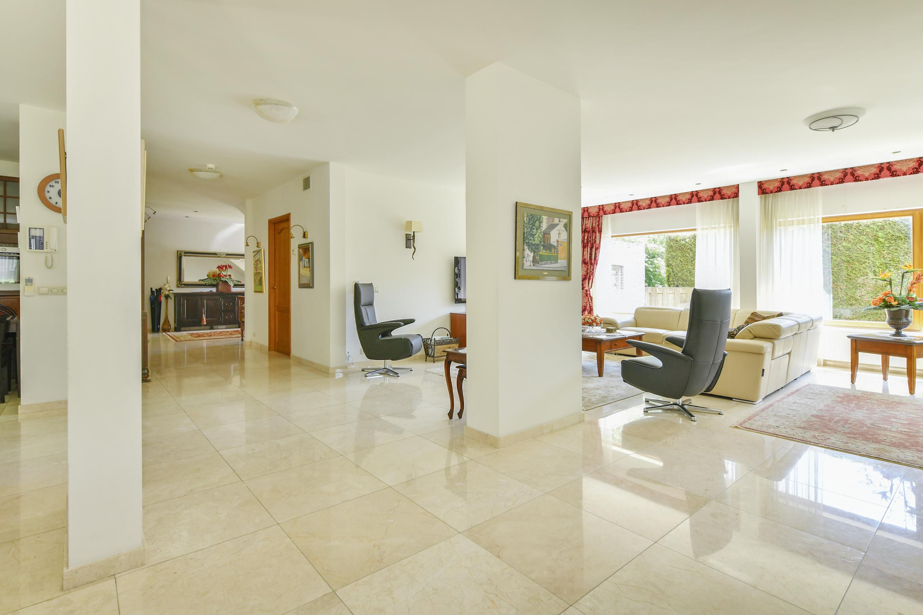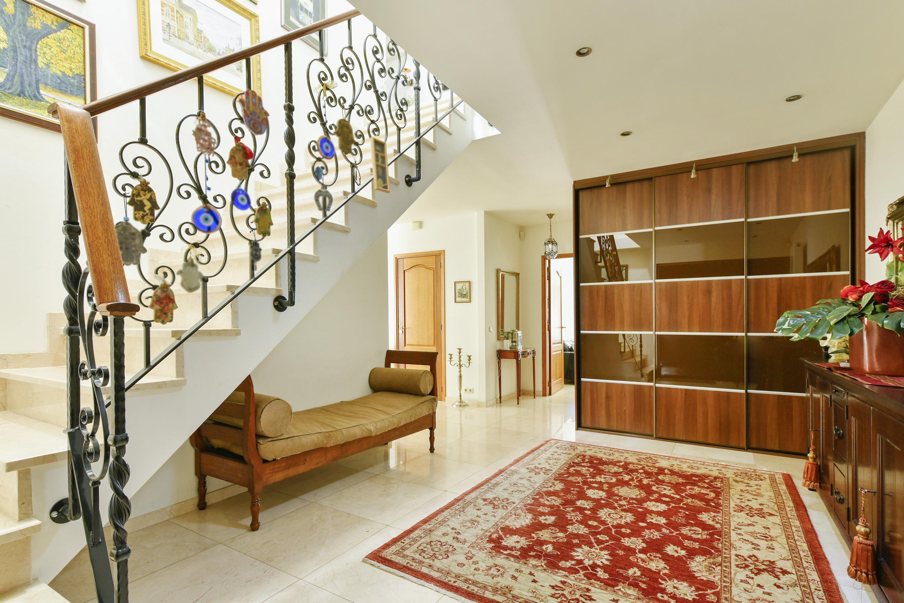 На верхнем этаже пять просторных спален и две ванные комнаты – включая мастер-сьют с гардеробной и прямым выходом в ванную – обеспечивают гибкое использование пространства. Все комнаты оформлены в нейтральных тонах, что позволяет легко реализовать индивидуальный стиль.