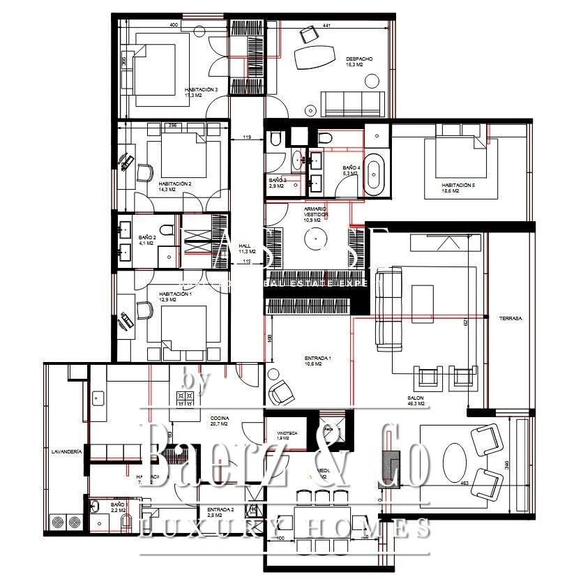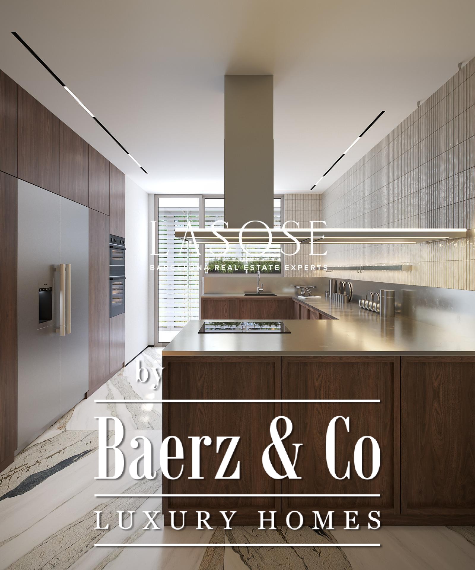 Освещение создает особую атмосферу: все шесть спален с окнами наружу, а трехсторонняя ориентация обеспечивает сквозную вентиляцию и солнечный свет с утра до вечера. Главная гостиная площадью 46 м² выходит на частную террасу с видом на сад, а столовая (16 м²) и кухня (20 м²) определяют ритм повседневной жизни. Четыре ванные комнаты, отдельный кабинет и мастер-сьют с гардеробной 10,9 м² обеспечивают пространство как для уединения, так и для встреч.