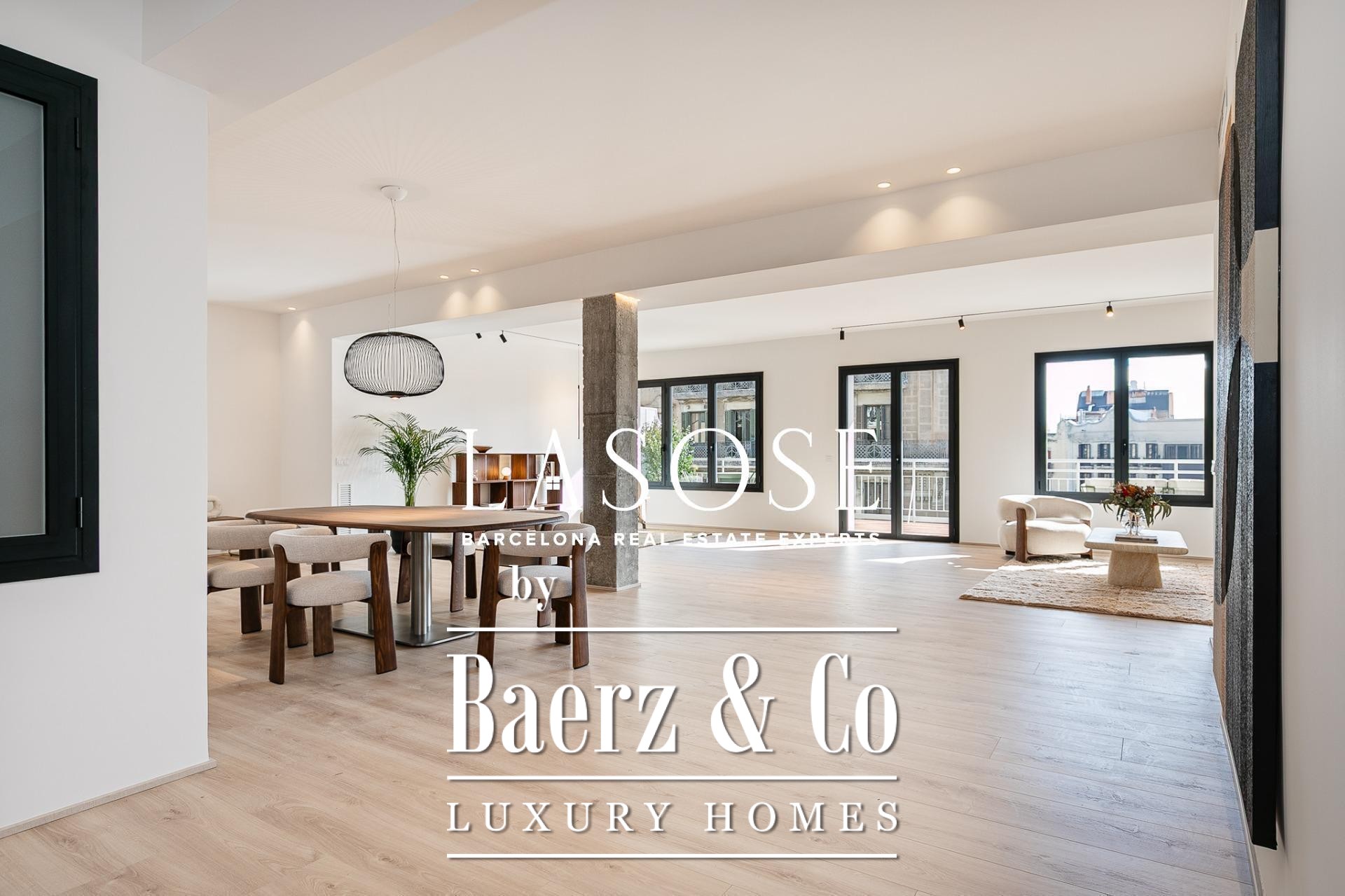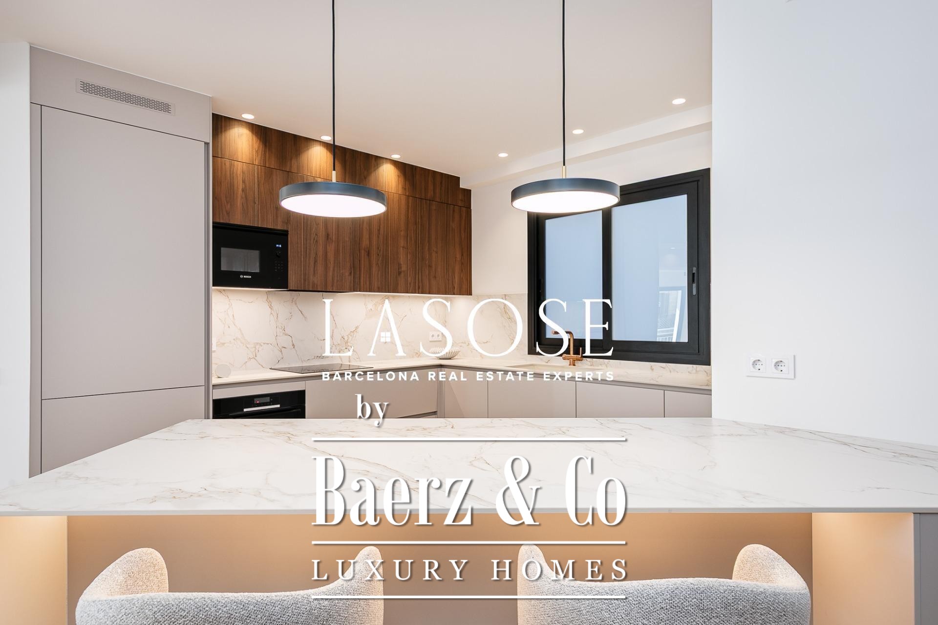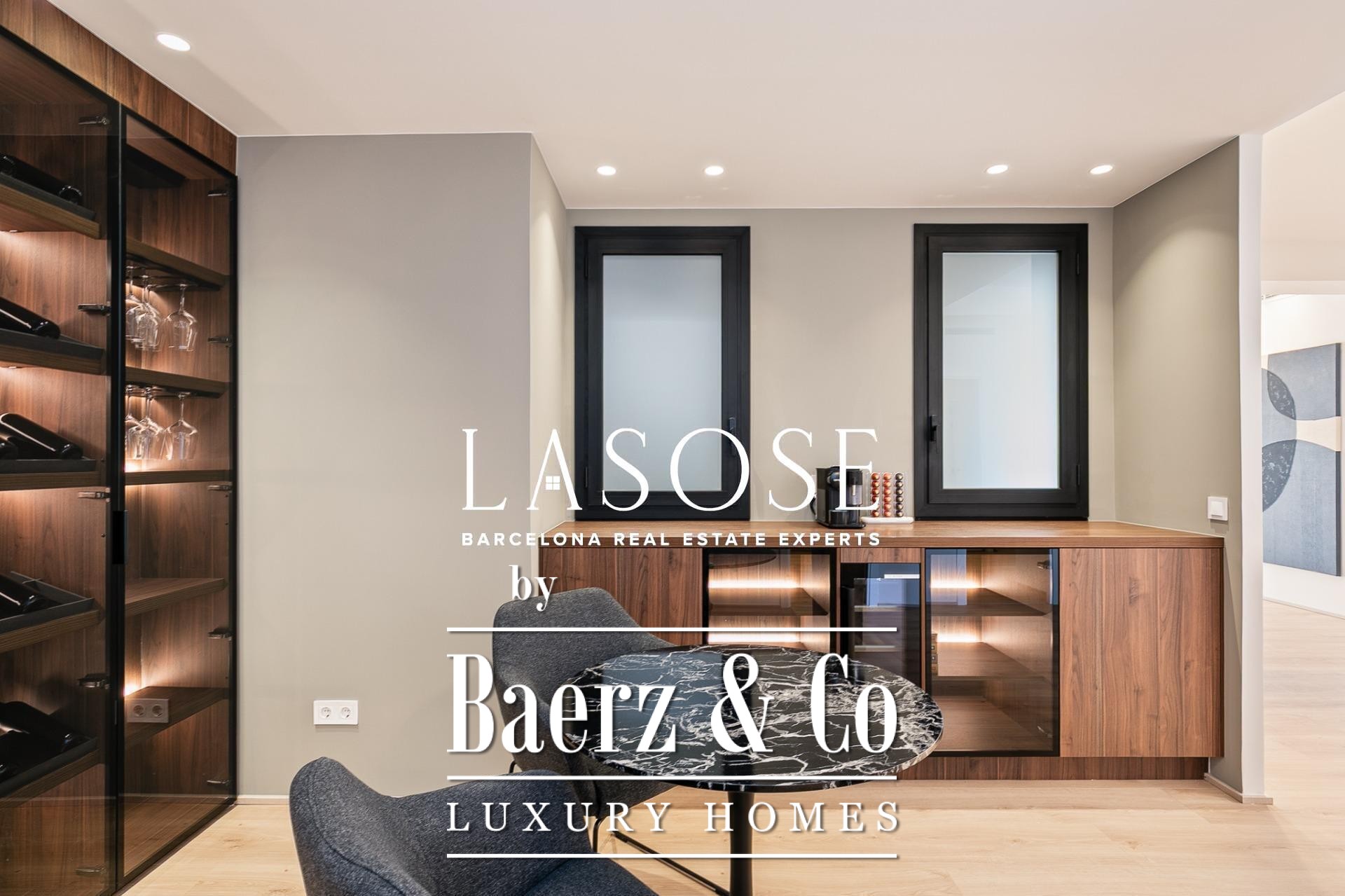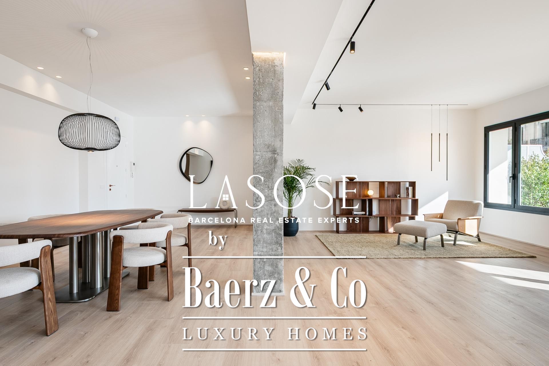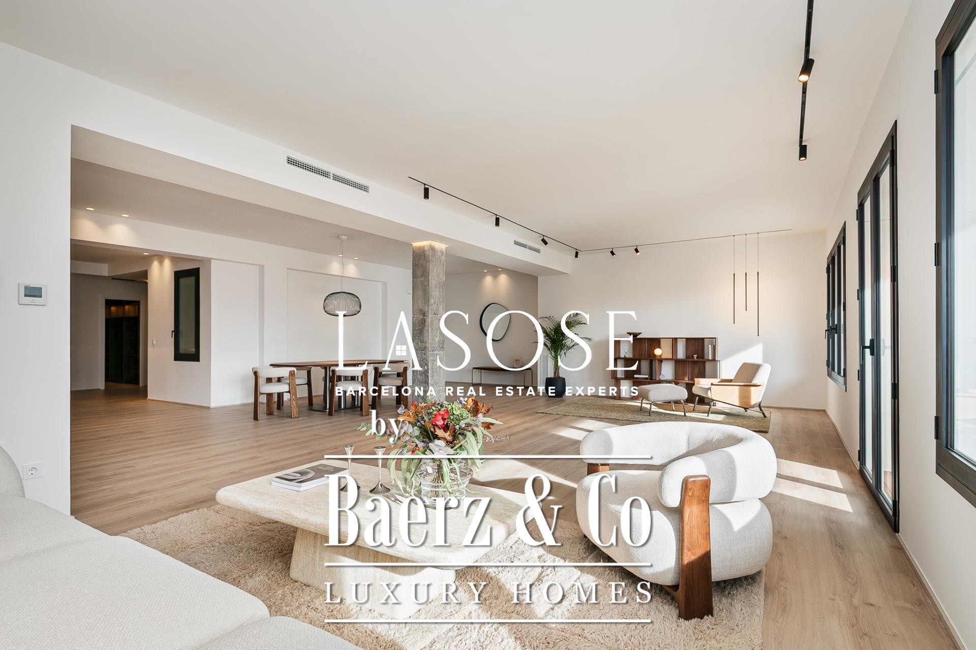 Апартаменты полностью отреставрированы с использованием премиальных материалов. Естественный свет проникает сквозь широкие окна, выходящие на юго-восток, наполняя интерьер светом и выделяя просторную открытую зону гостиной-столовой площадью 90 м². Отсюда двери ведут на угловую панорамную террасу с видом на зелёные бульвары и Plaça Mossèn Jacint Verdaguer. Кухня Santos, оснащённая техникой Bosch, сконцентрирована вокруг острова с интегрированным винным шкафом и кофейной зоной, которую дополняет кладовая для скрытого хранения.