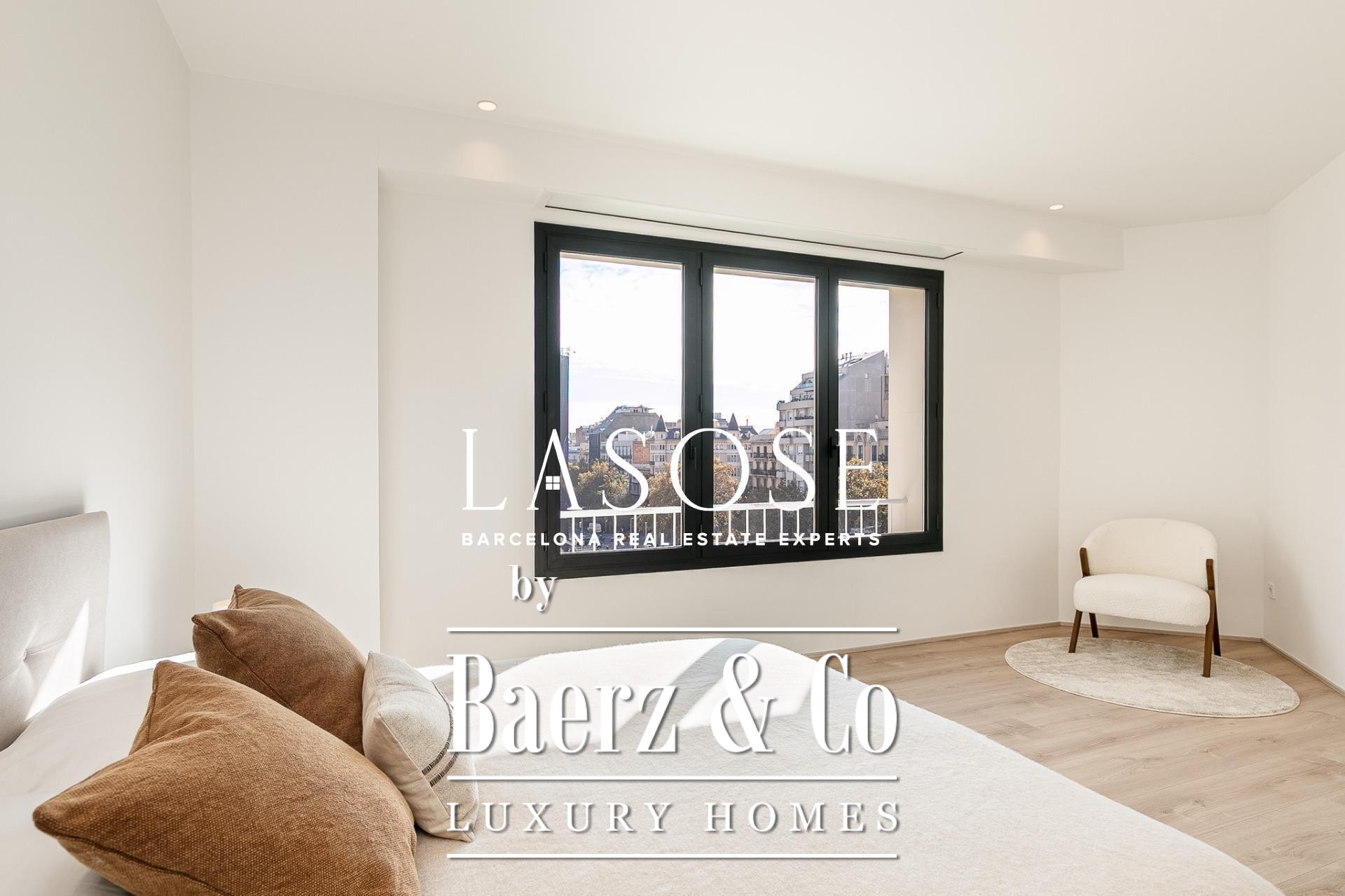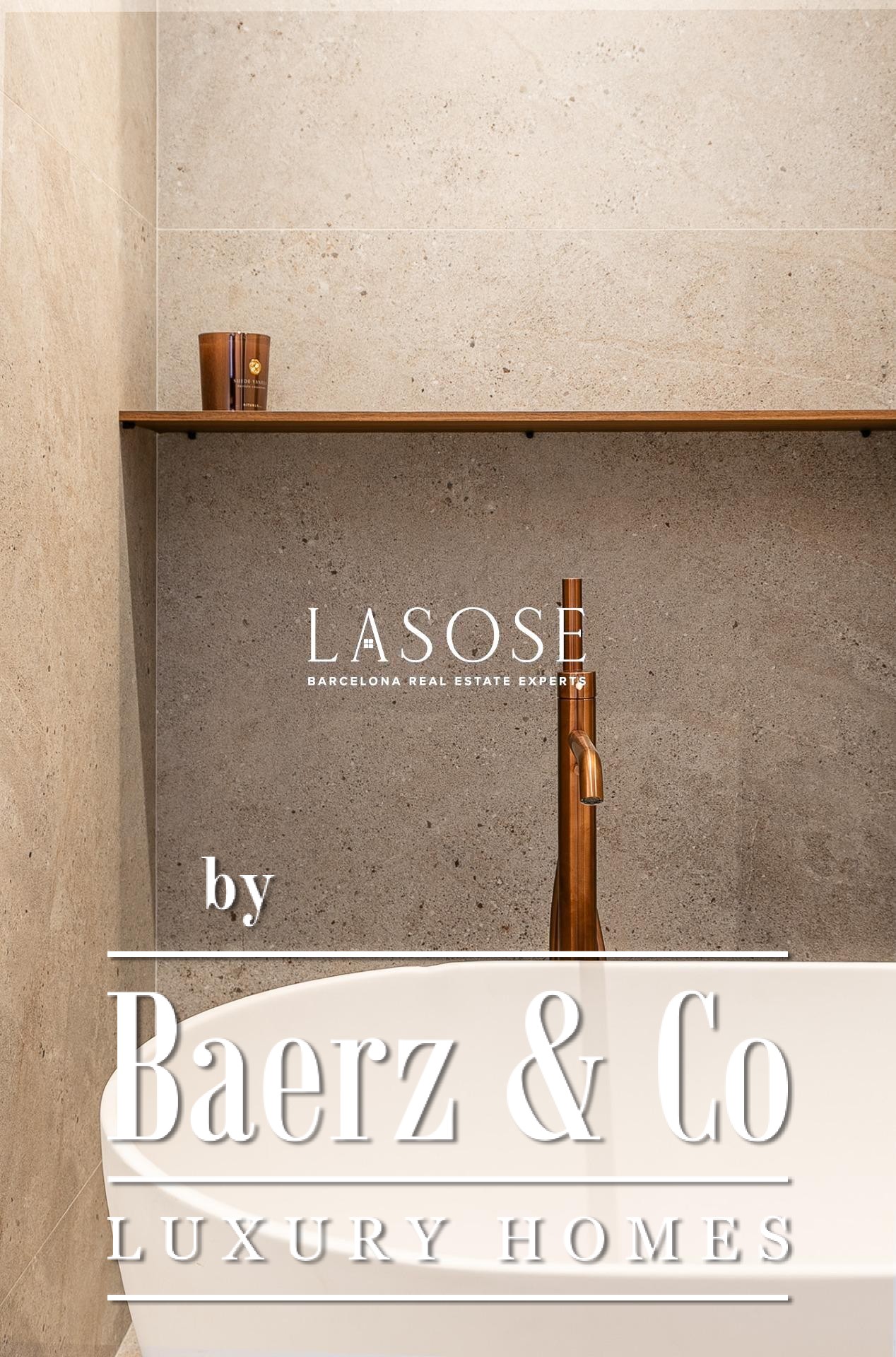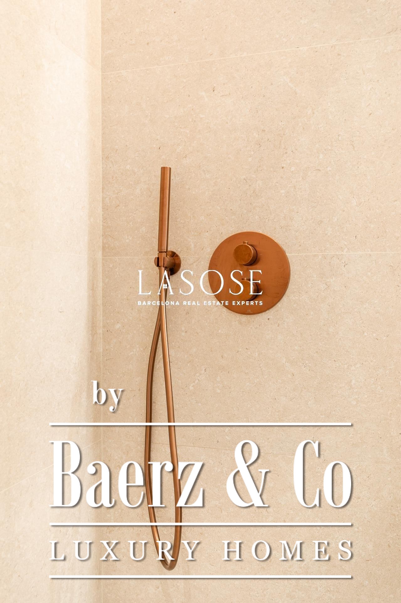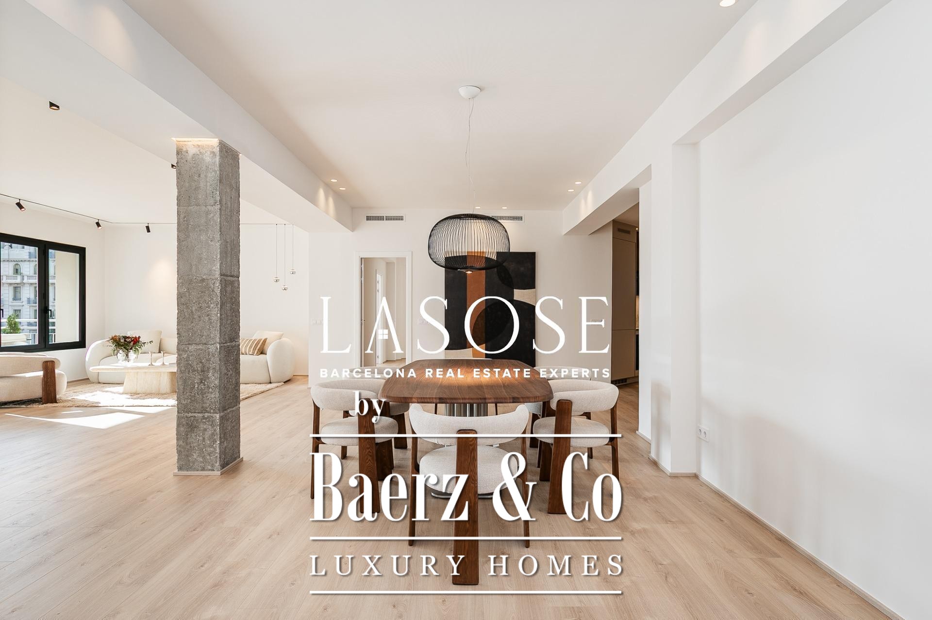 Апартаменты полностью отреставрированы с использованием премиальных материалов. Естественный свет проникает сквозь широкие окна, выходящие на юго-восток, наполняя интерьер светом и выделяя просторную открытую зону гостиной-столовой площадью 90 м². Отсюда двери ведут на угловую панорамную террасу с видом на зелёные бульвары и Plaça Mossèn Jacint Verdaguer. Кухня Santos, оснащённая техникой Bosch, сконцентрирована вокруг острова с интегрированным винным шкафом и кофейной зоной, которую дополняет кладовая для скрытого хранения.