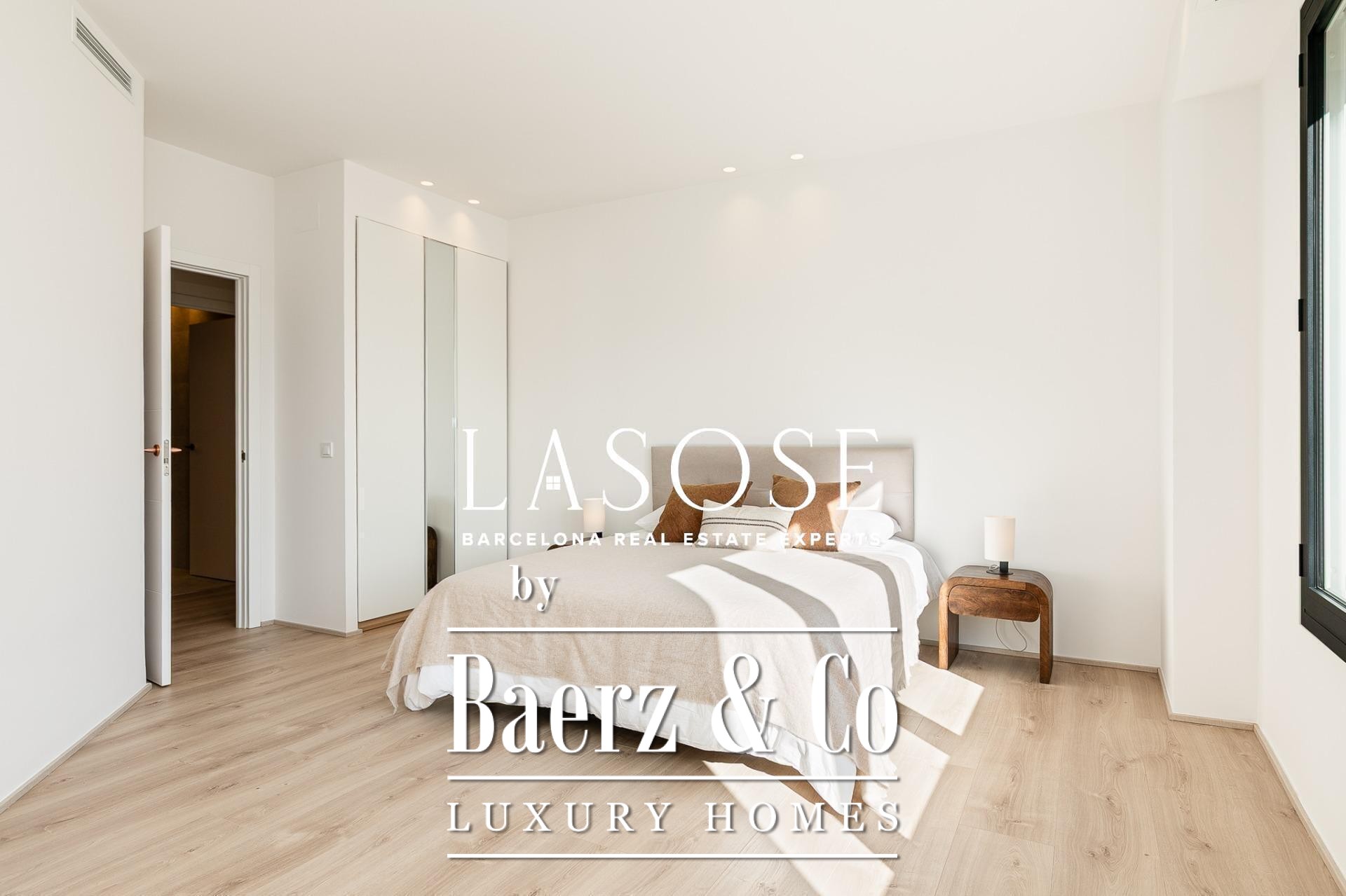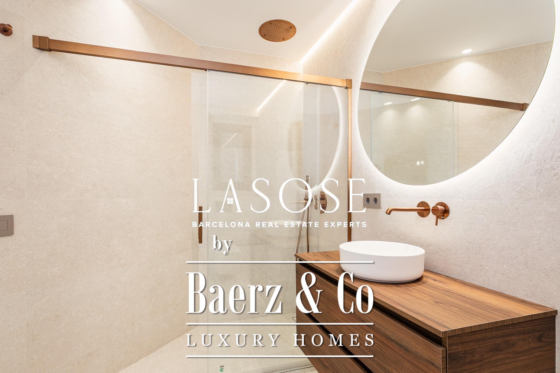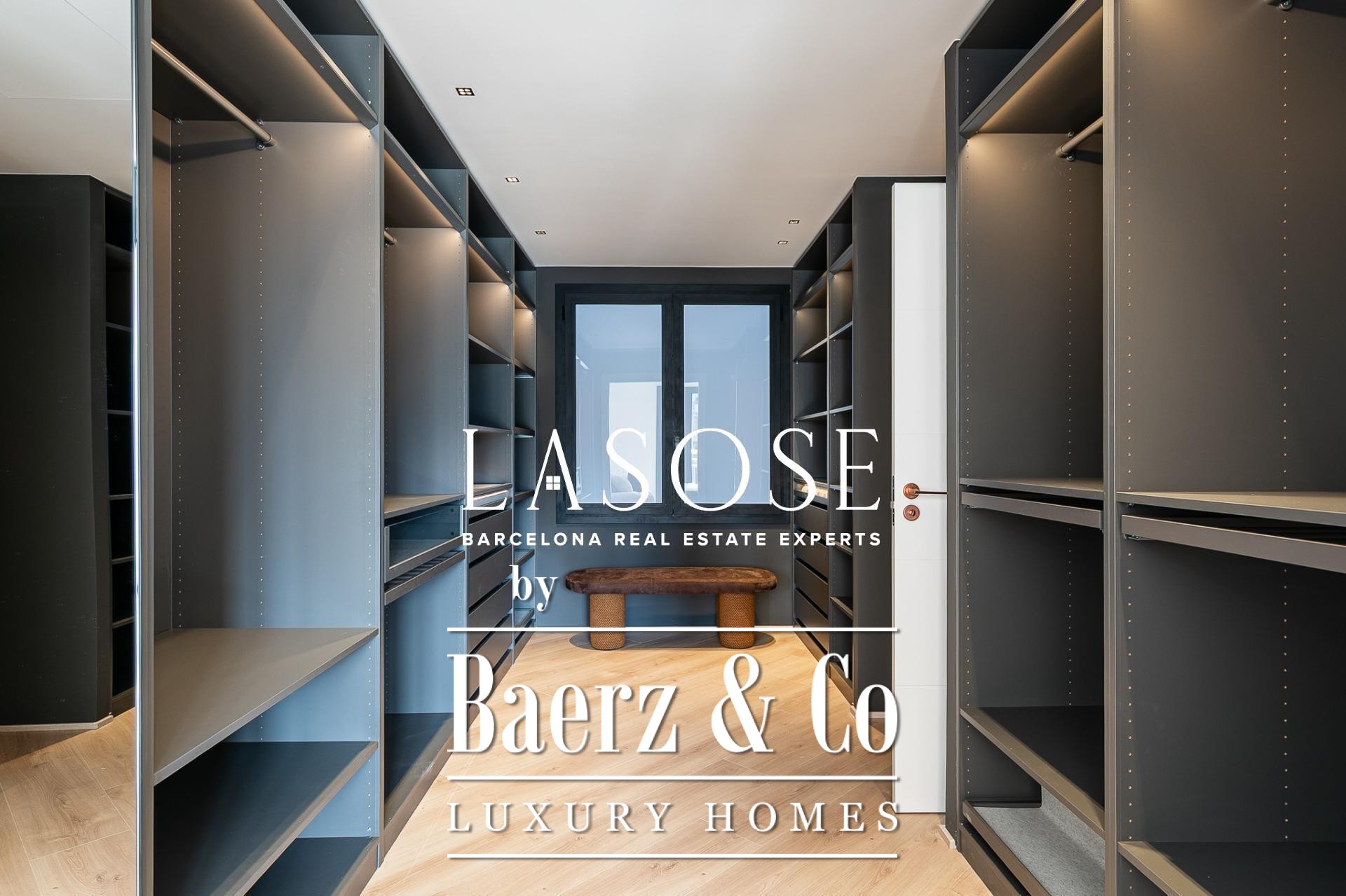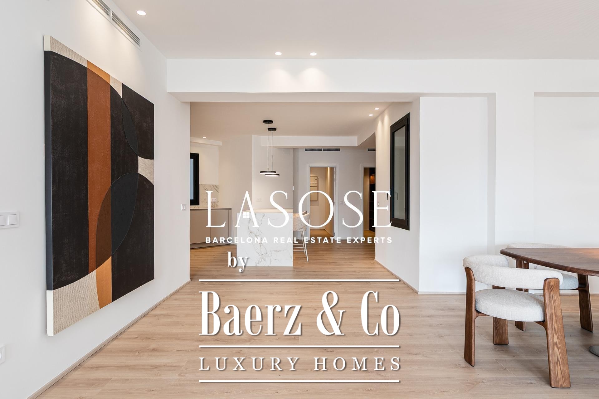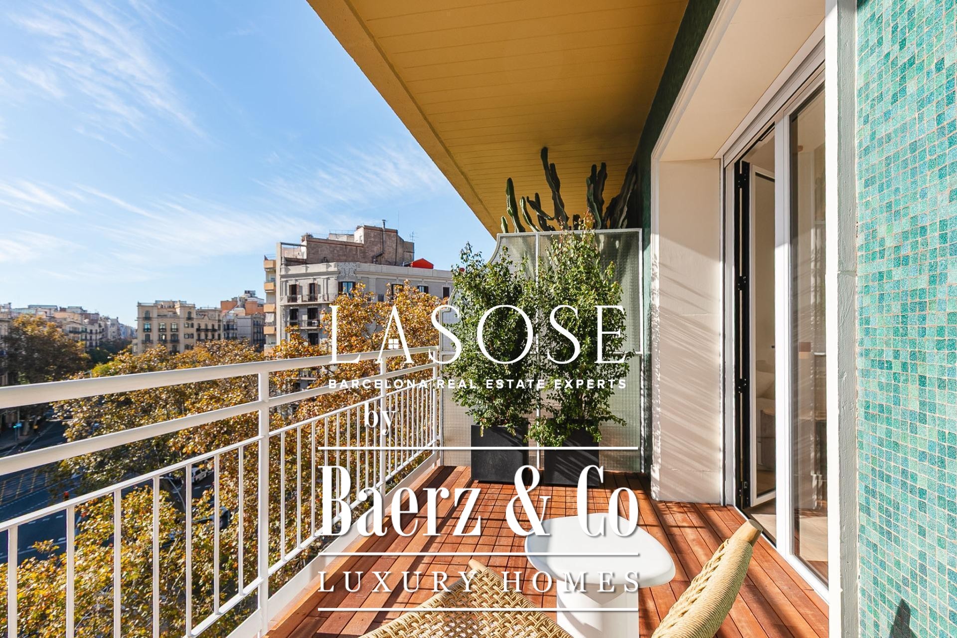 Апартаменты полностью отреставрированы с использованием премиальных материалов. Естественный свет проникает сквозь широкие окна, выходящие на юго-восток, наполняя интерьер светом и выделяя просторную открытую зону гостиной-столовой площадью 90 м². Отсюда двери ведут на угловую панорамную террасу с видом на зелёные бульвары и Plaça Mossèn Jacint Verdaguer. Кухня Santos, оснащённая техникой Bosch, сконцентрирована вокруг острова с интегрированным винным шкафом и кофейной зоной, которую дополняет кладовая для скрытого хранения.