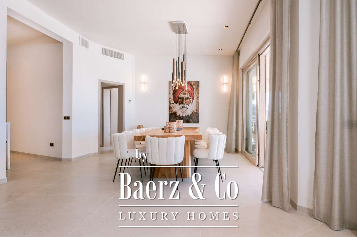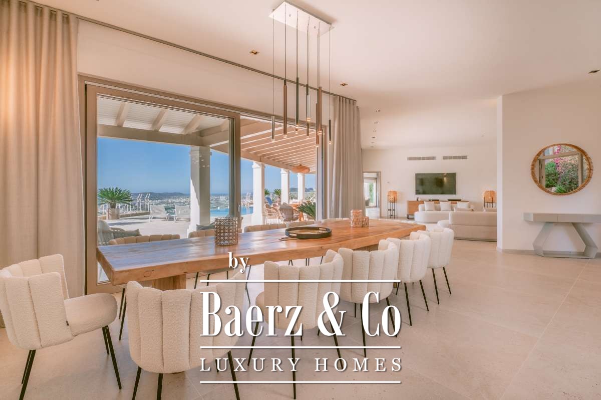 На двух уровнях размещаются семь просторных спален и восемь ванных комнат, что дает свободу планировки для семьи или гостей. Просторная гостиная и столовая зона с панорамным остеклением плавно переходят на солнечные террасы и к превосходному бассейну-инфинити с водопадом. Кухня снабжена бытовой техникой премиум-класса, а сочетание дерева и мрамора обеспечивает ощущение вечной элегантности. Две главные спальни на основном уровне открывают виды на зеленые сады, город Ибиса и море. Дополнительные помещения могут быть адаптированы под частный велнес, творческие или досуговые пространства.