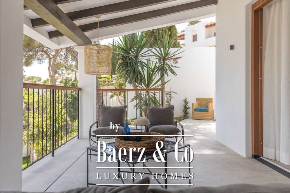 Попадая на основной этаж, вы окунетесь в светлый открытый интерьер гостиной, столовой и кухни, где бохо-шик сочетается с высококачественными, недавно обновлёнными материалами для максимального комфорта. Все помещения выходят на просторную террасу, ориентированную на юг, открывая вид на ухоженный частный сад, сверкающий инфинити-бассейн с тёмно-синими балийскими плитками и захватывающий горизонт — город, лес и Средиземное море, а вдалеке возвышается Дальт Вила. Полностью оборудованная кухня с барной стойкой из натурального камня гармонично соединяется с террасой, создавая уникальный стиль неспешной жизни на свежем воздухе в атмосфере абсолютного уединения.