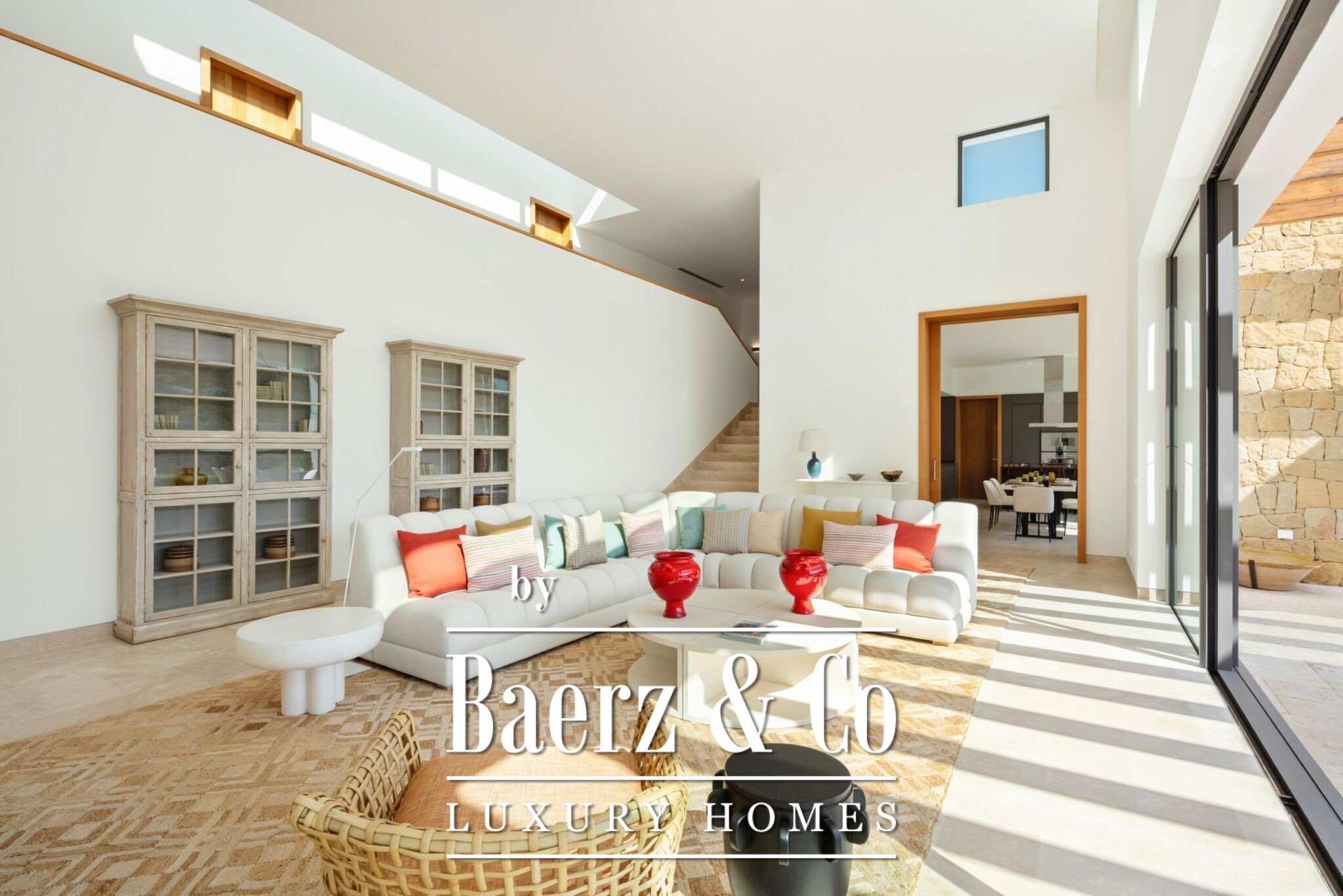 На первом этаже благодаря панорамному остеклению в помещение поступает естественный свет, наполняя гостиную с высокими потолками открытостью и многослойностью. Две зоны отдыха расположены по обе стороны от центрального камина, а обеденная зона плавно переходит в ультрасовременную кухню с нейтральными оттенками и просторными рабочими поверхностями. Прямой выход на террасу объединяет дом с природой, ведя на просторные террасы нижнего уровня и ухоженный участок площадью 1 837 м². Частный бассейн отражает переменчивое небо, открывая виды на окружающий пейзаж и площадку для гольфа первой линии.
