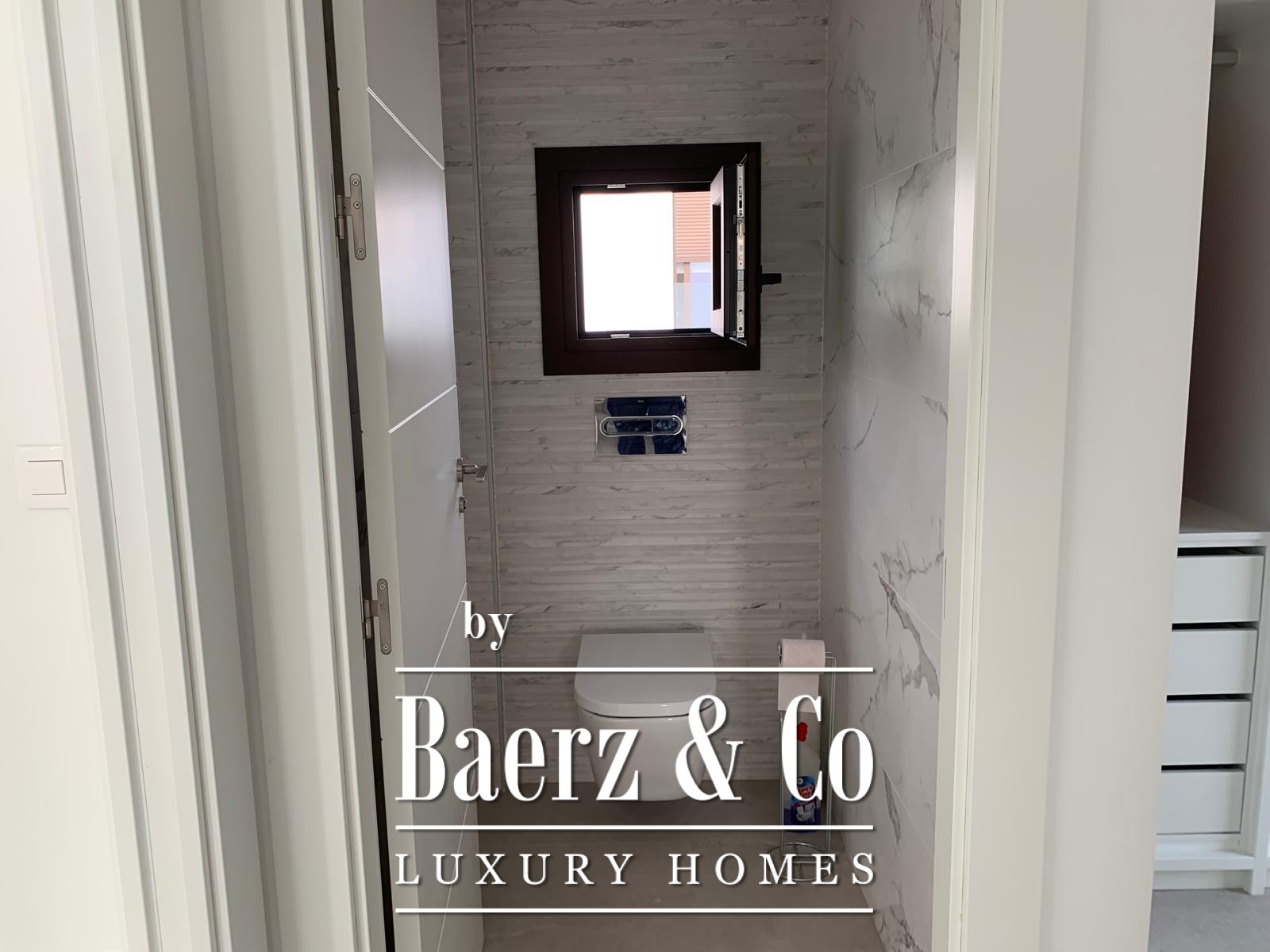 На первом этаже находится уединённый мастер-сьют с собственной ванной комнатой и душем с входом без порога, отдельной гардеробной и самостоятельным туалетом. На первом уровне оборудована открытая кухня с полным набором мебели, откуда начинается вход в светлую гостиную-столовую. Здесь же две спальни, одна из которых с отдельной ванной комнатой, а также гостевой туалет.