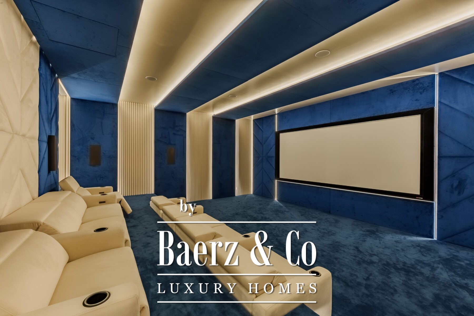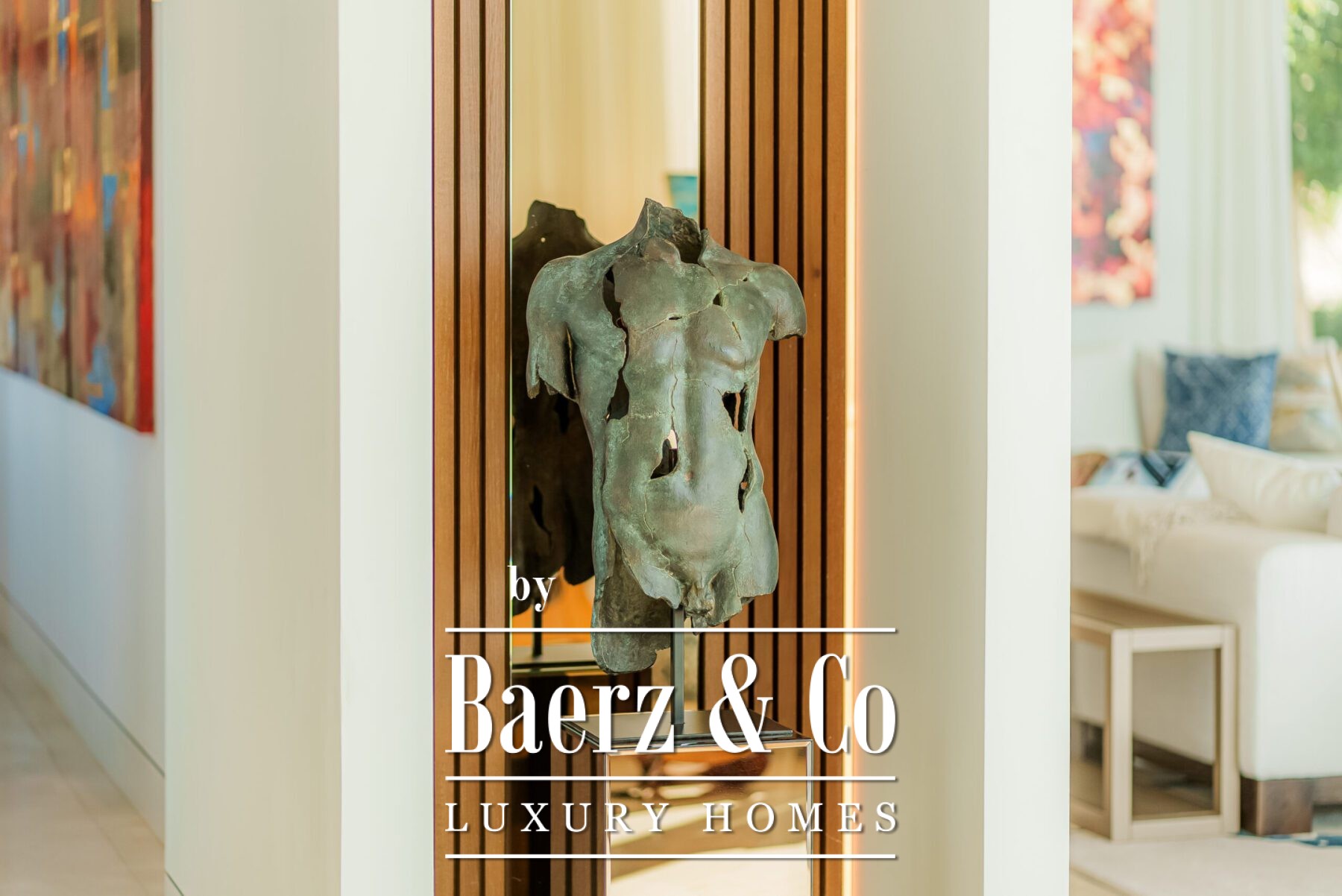 Главная гостиная впечатляет высокими потолками и стеклянными дверями во всю высоту, которые полностью убираются в стены, наполняя помещение естественным светом и объединяя интерьер с просторными террасами, благоустроенным садом и бассейном с эффектом бесконечности. Открытая планировка создана для уединённых и ярких встреч в атмосфере эстетики и утончённого ритма современной жизни.