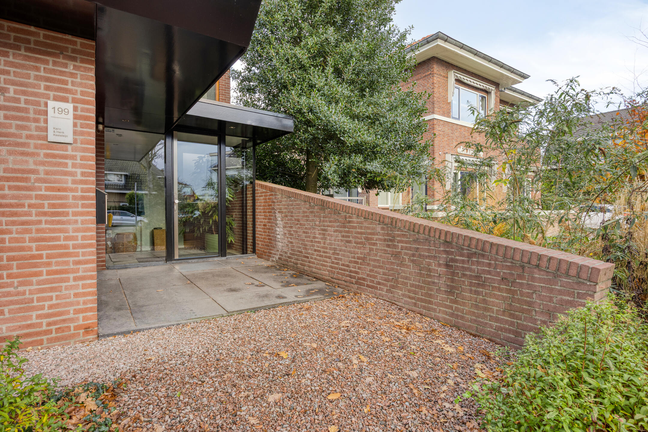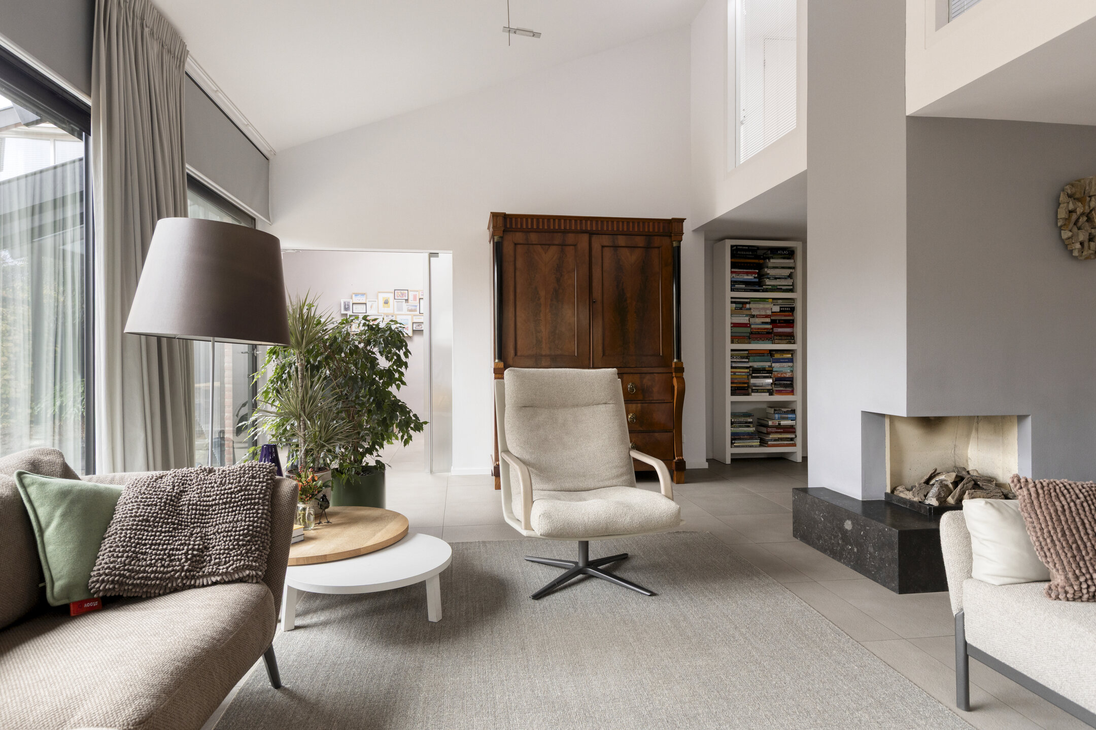 Этот отдельно стоящий дом в Oegstgeest воплощает сдержанное сочетание архитектурной мысли и уединения; расположен на Rhijngeesterstraatweg 199, на участке площадью 718 м², окружённом зеленью. Площадь дома составляет 191 м²; здесь три спальни и две ванные комнаты, при этом предусмотрена возможность проживания на одном уровне — на первом этаже. Ключевая архитектурная реновация в 2006 году и постоянная модернизация позволили достичь энергоэффективности класса A+, благодаря 12 солнечным панелям, высокоэффективной теплоизоляции и гибридному тепловому насосу, установленному в 2023 году.