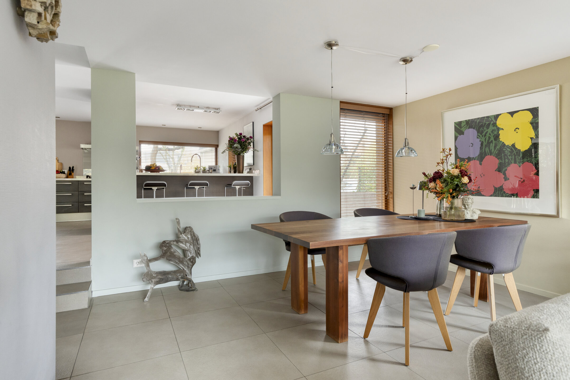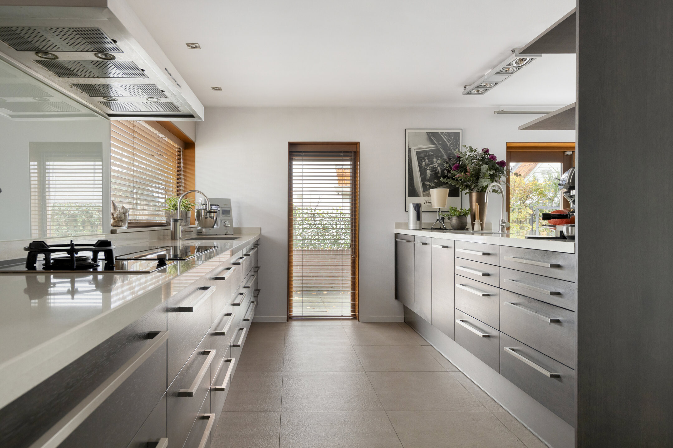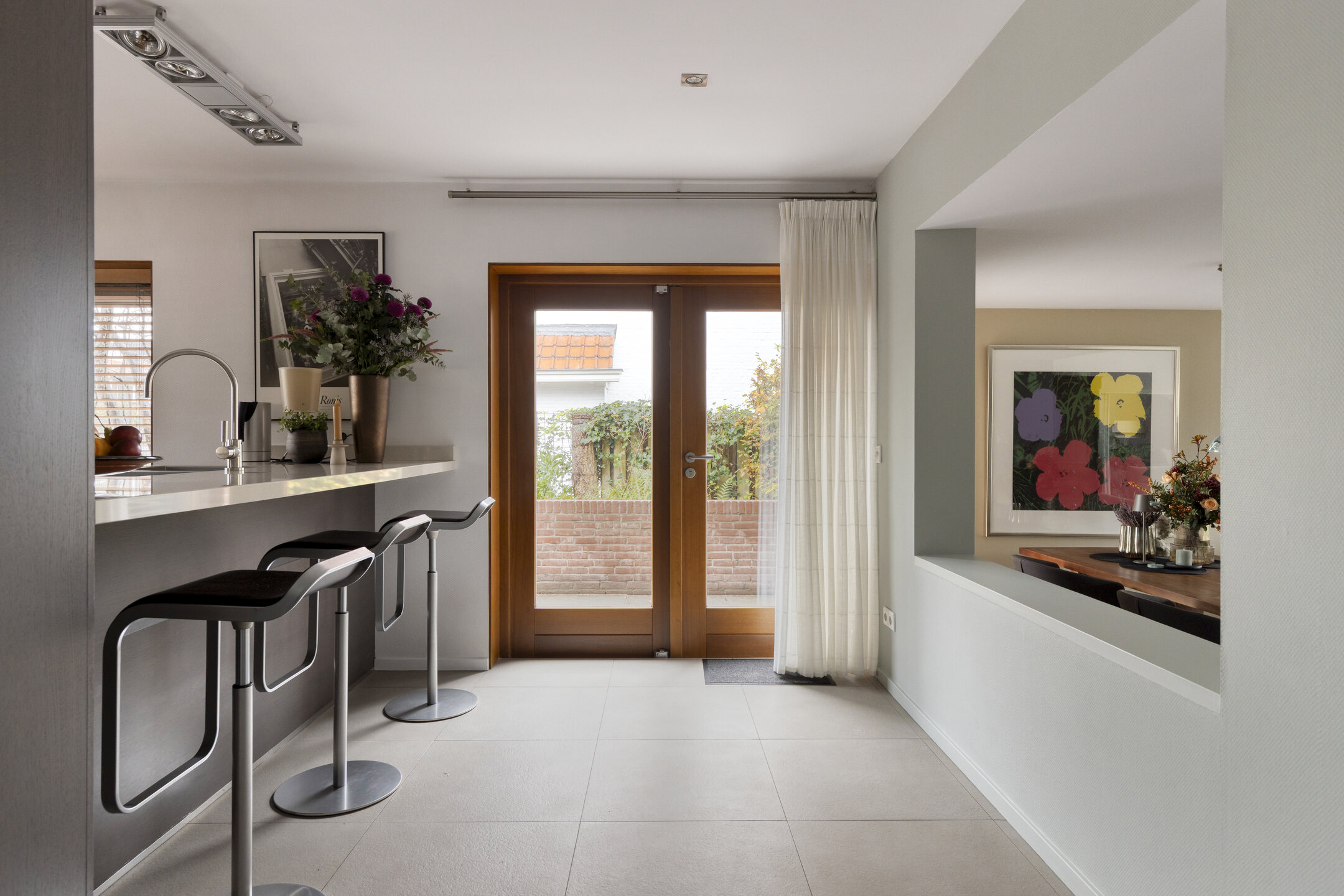 Через остеклённый боковой вход попадаешь в наполненную светом современную кухню, оснащённую индукционной варочной панелью, газовой конфоркой для вок и высококлассной техникой. Планировка открытого типа объединяет кухню с гостиной, где большие стеклянные раздвижные двери, высокие потолки и центральный камин наполняют пространство светом и спокойствием. Стеклянная веранда сзади продлевает сезоны и создаёт визуальную связь с садом, глубиной более 30 метров и ориентацией на запад-северо-запад, где обильно растёт местная зелень и встречается живая природа.