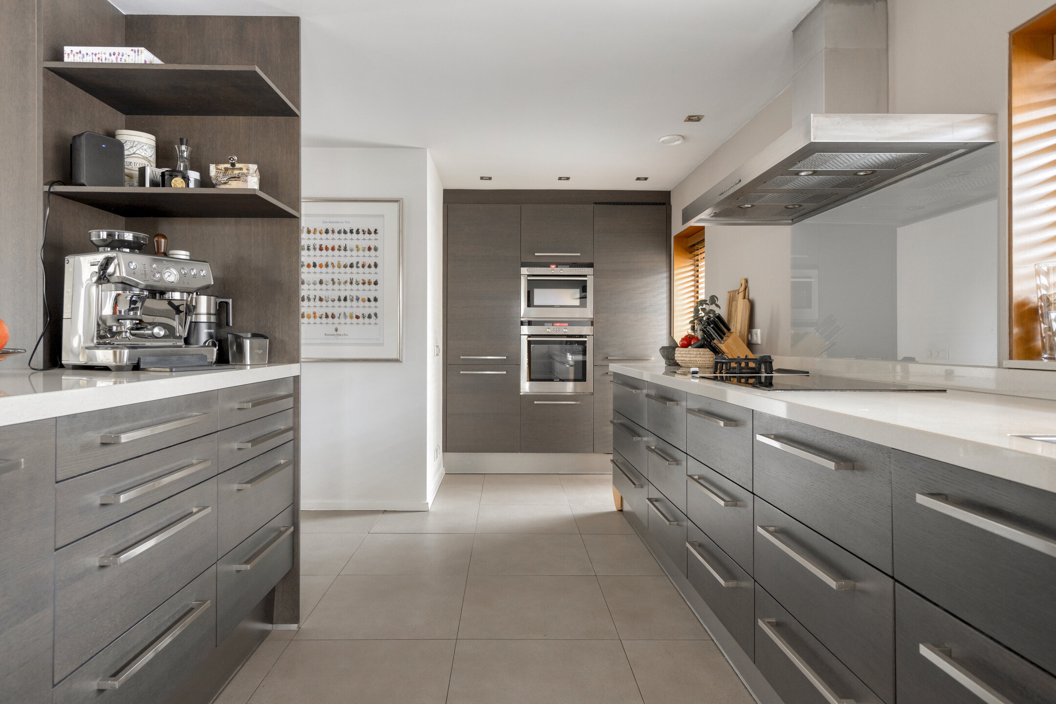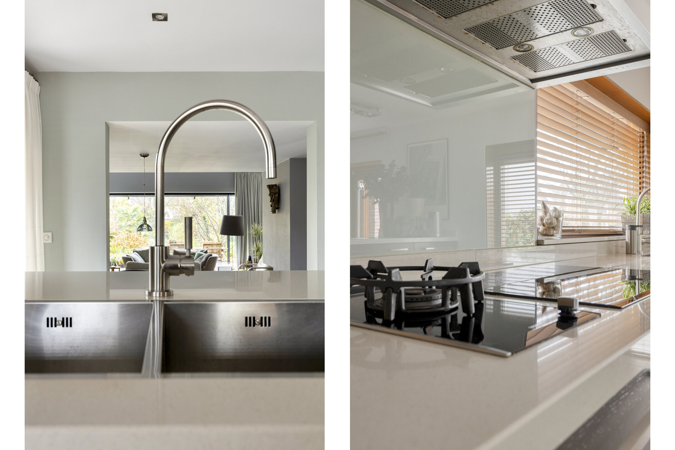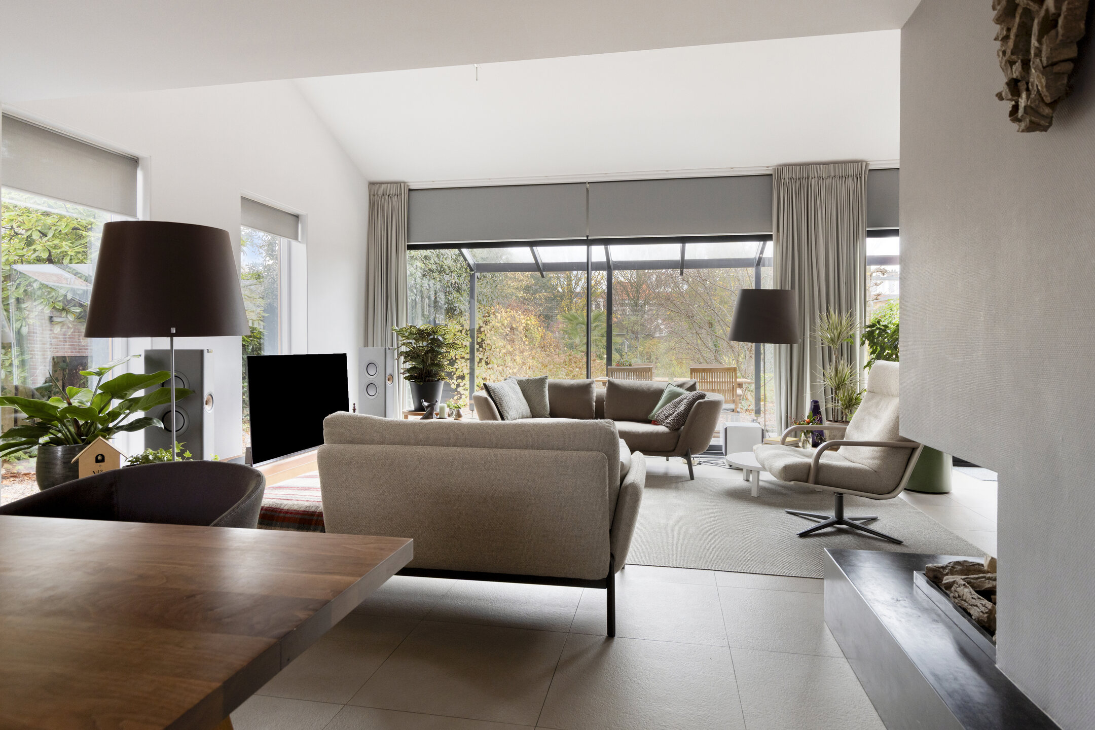 Через остеклённый боковой вход попадаешь в наполненную светом современную кухню, оснащённую индукционной варочной панелью, газовой конфоркой для вок и высококлассной техникой. Планировка открытого типа объединяет кухню с гостиной, где большие стеклянные раздвижные двери, высокие потолки и центральный камин наполняют пространство светом и спокойствием. Стеклянная веранда сзади продлевает сезоны и создаёт визуальную связь с садом, глубиной более 30 метров и ориентацией на запад-северо-запад, где обильно растёт местная зелень и встречается живая природа.