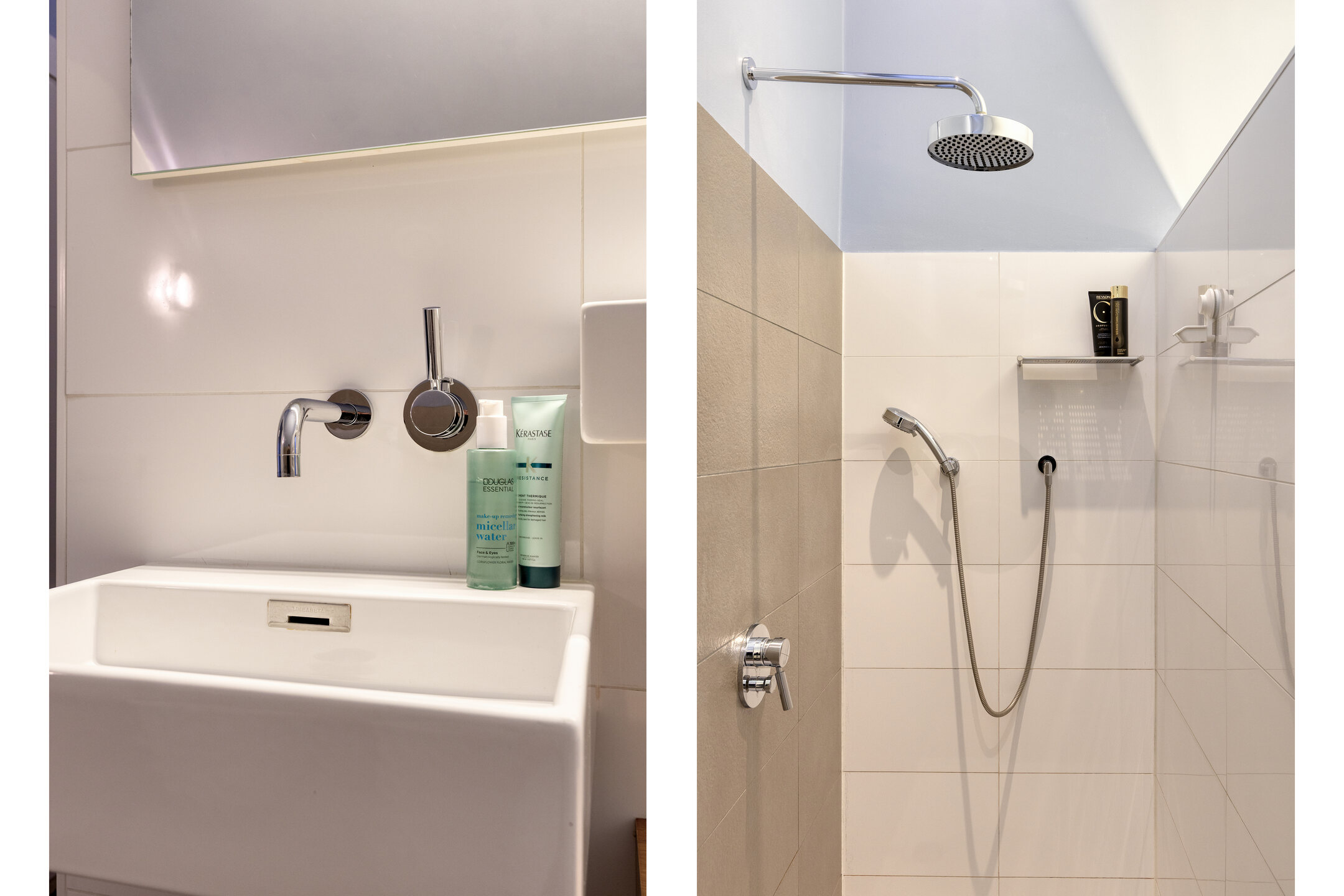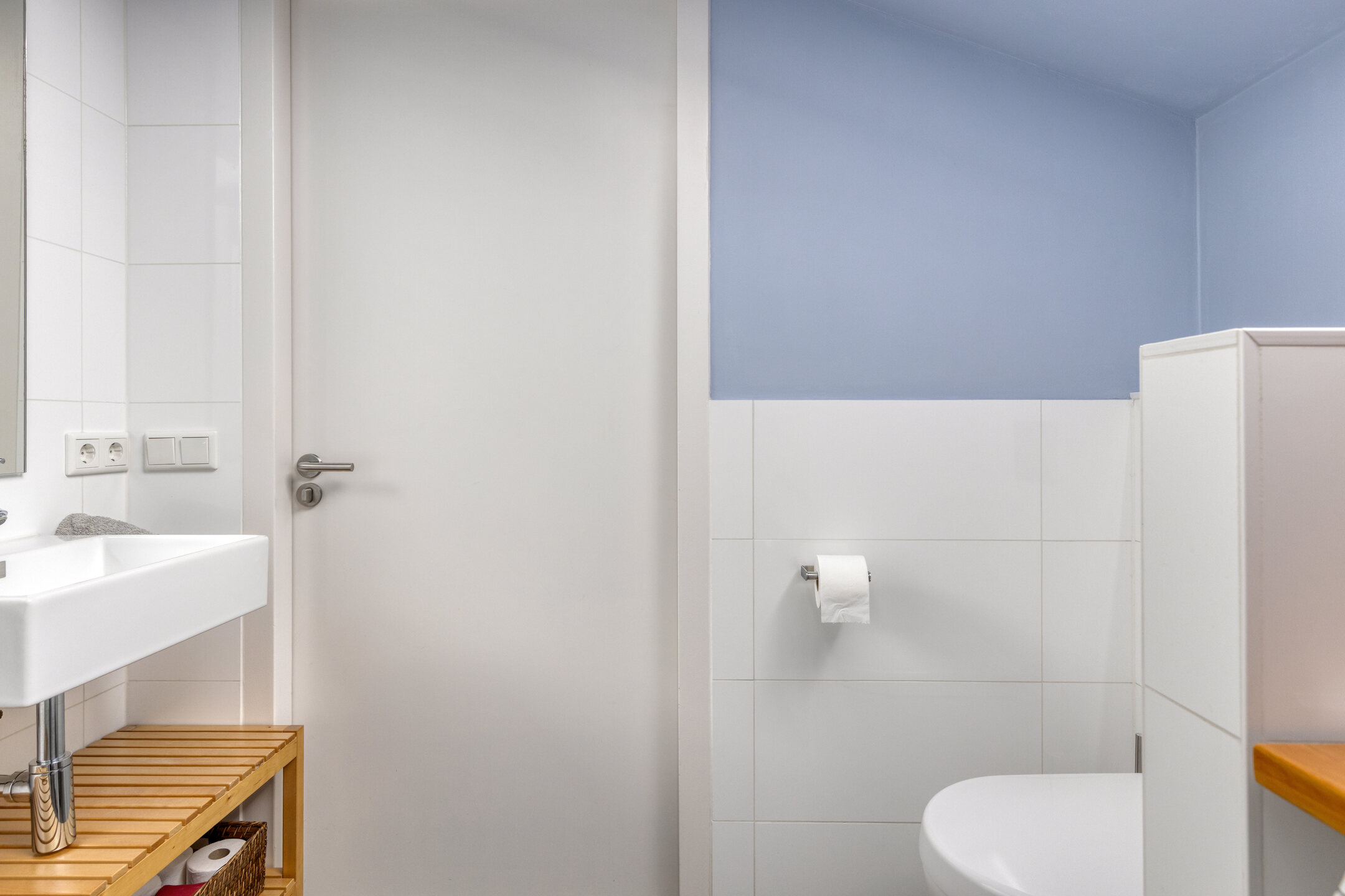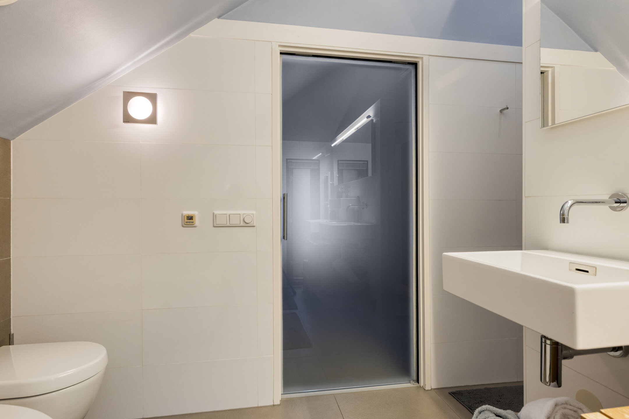 На верхнем этаже в главной спальне имеется ванная комната с отдельной ванной и душем типа walk-in; остальные спальни также сохраняют ощущение пространства и света. Технические удобства — механическая вентиляция, тёплый пол, оптоволоконный интернет — подчёркивают полную модернизацию и высокий уровень обслуживания.