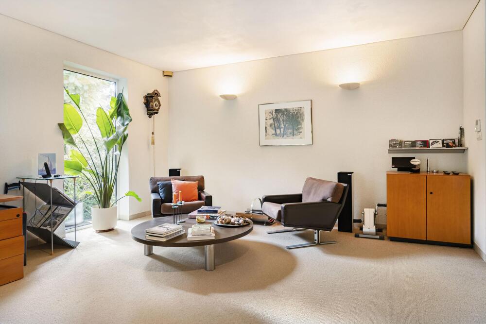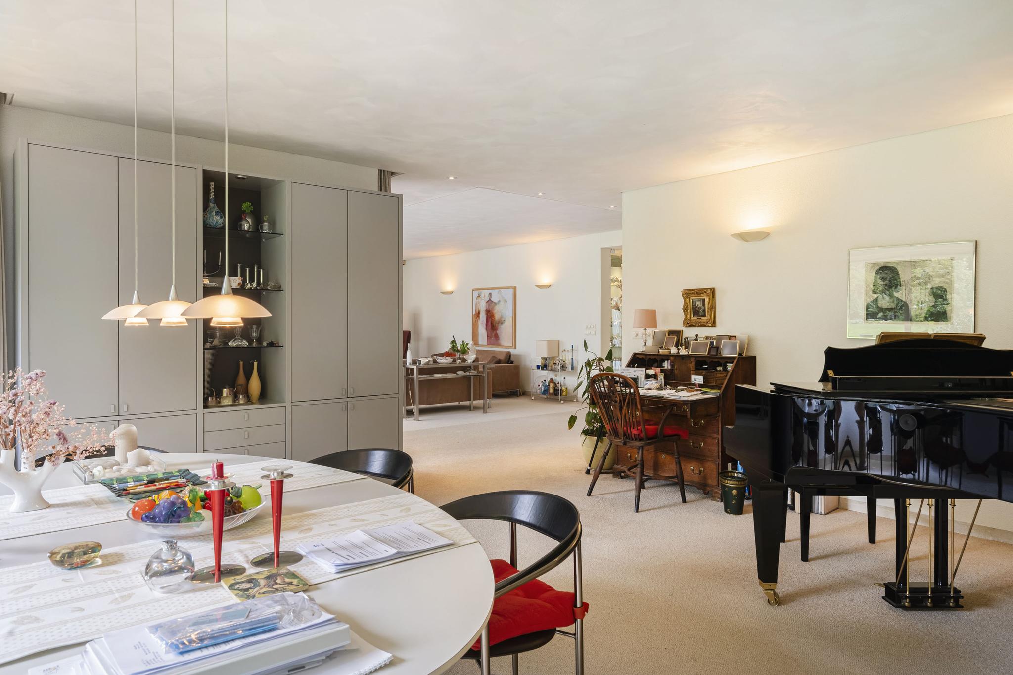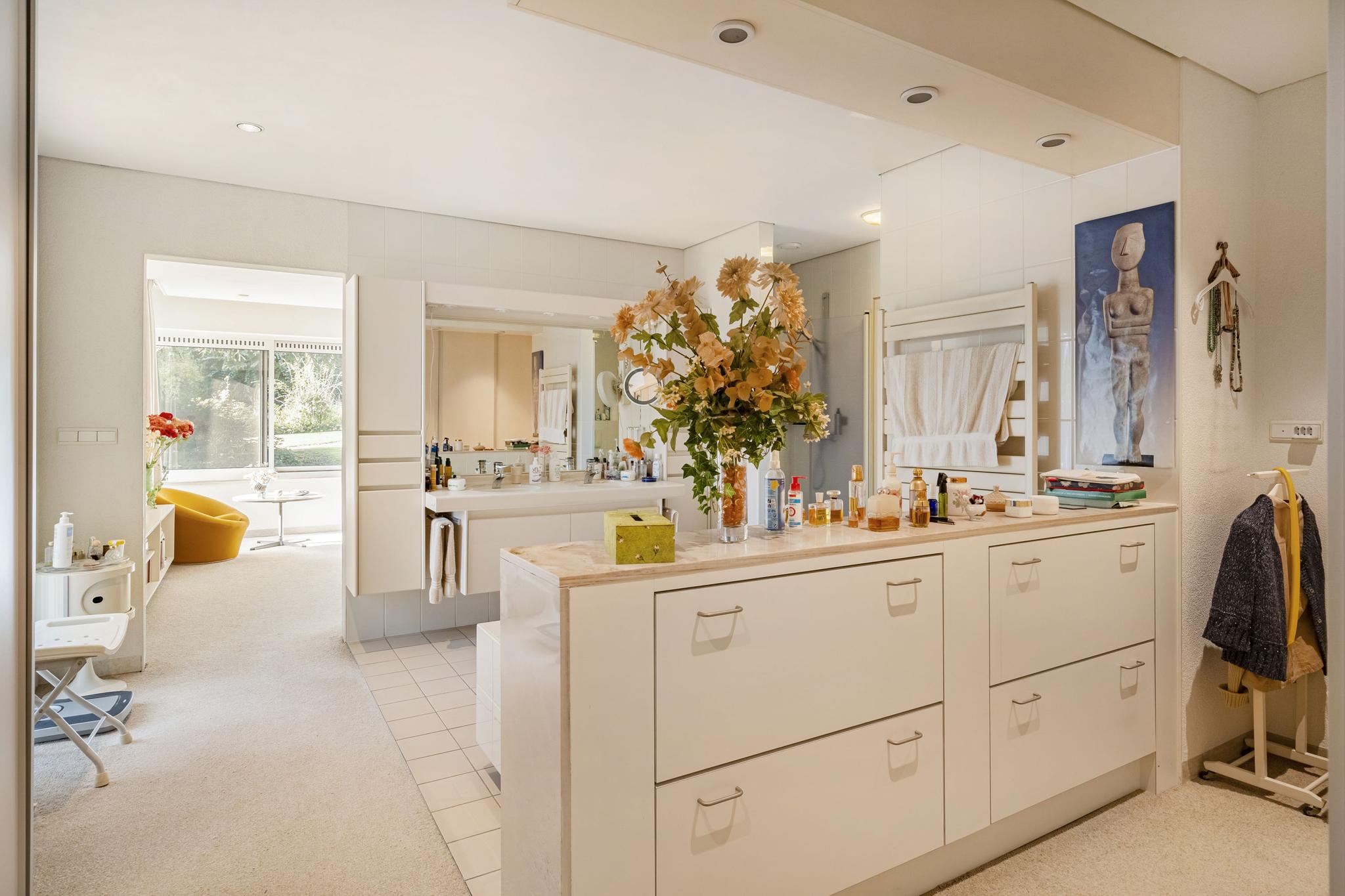 Продуманная планировка включает большую гостиную, столовую с видом на сад, кабинет, а также кухню открытой планировки, смежную с хозяйственным помещением и скрытым грузовым подъемником (дамбвейтером). Элегантные раздвижные двери обеспечивают идеальный баланс между открытостью и приватностью. Крытый бассейн с противотоком и раздвижными дверями в сад определяет домашний стандарт велнеса. Главная спальня оснащена кондиционером и имеет прямой выход в сад, а две ванные комнаты предлагают как ванну, так и душевую кабину.