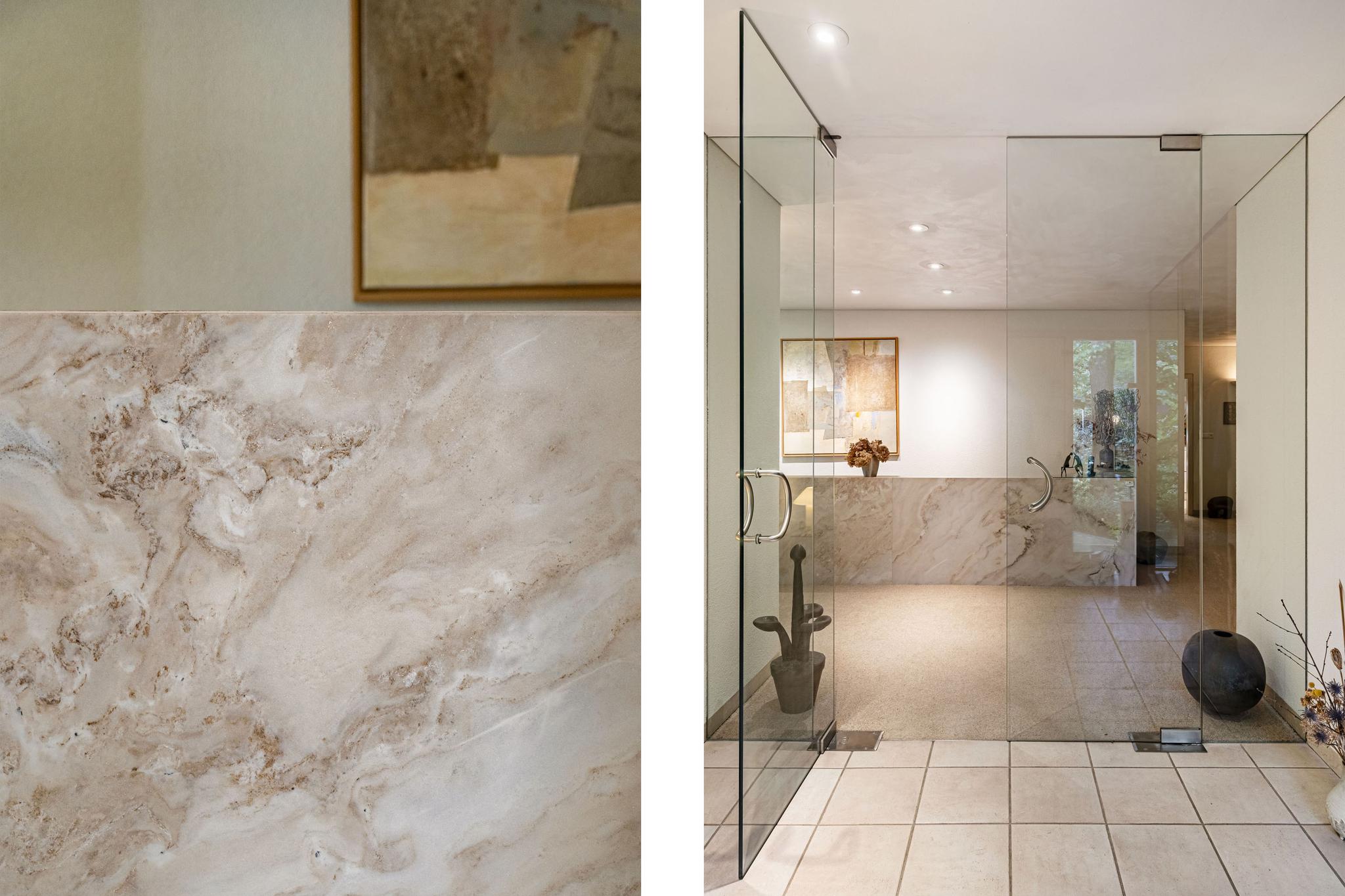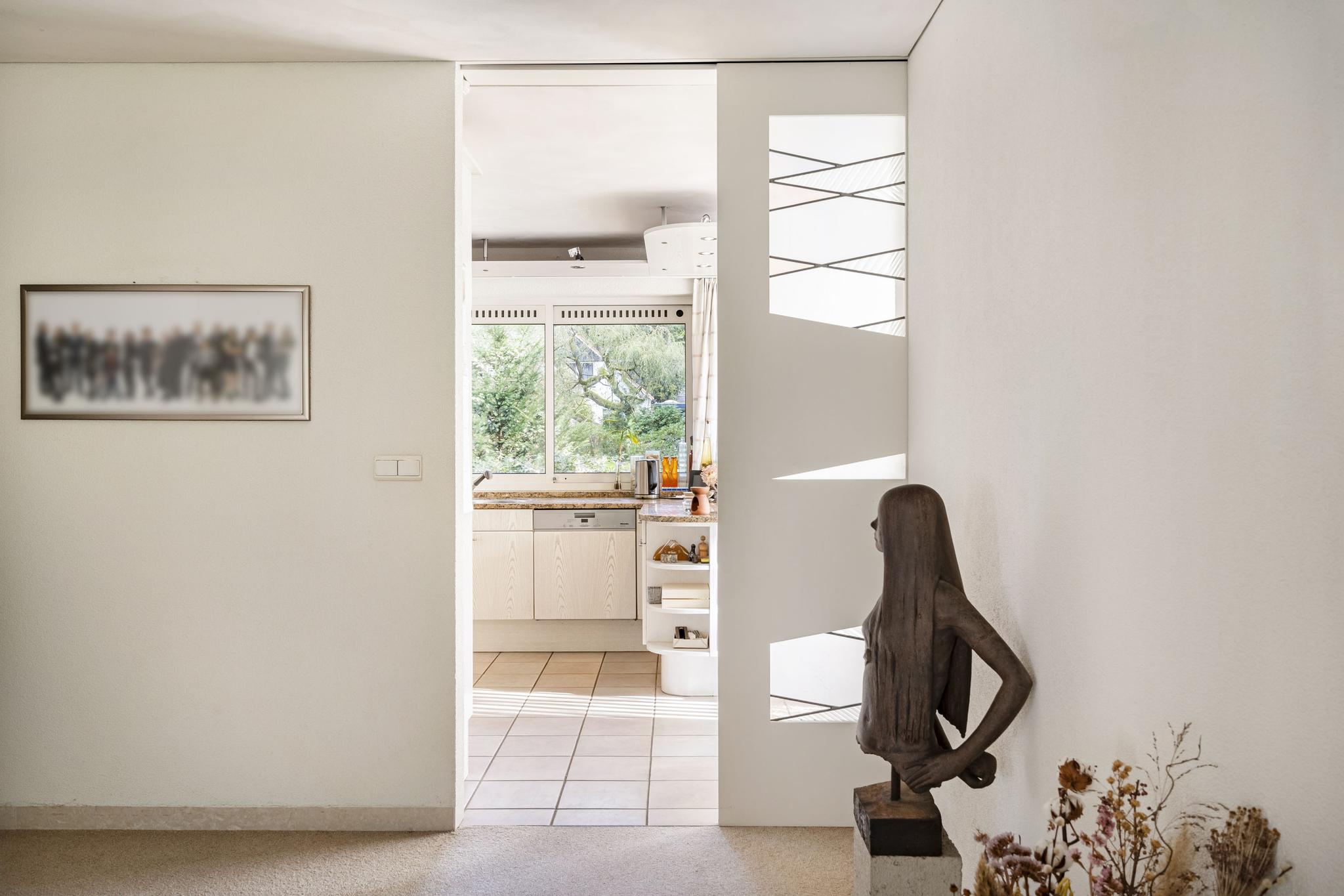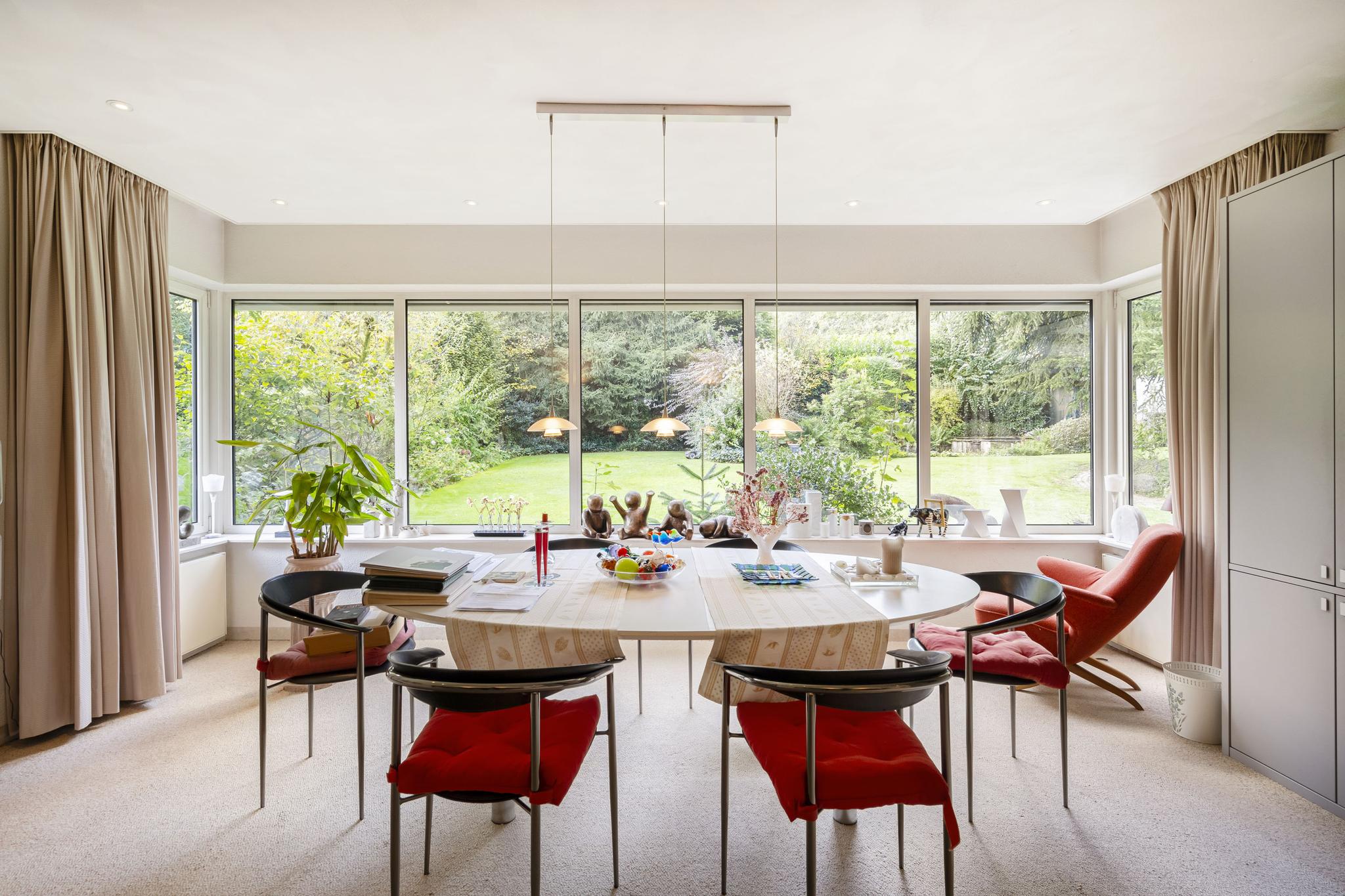 Продуманная планировка включает большую гостиную, столовую с видом на сад, кабинет, а также кухню открытой планировки, смежную с хозяйственным помещением и скрытым грузовым подъемником (дамбвейтером). Элегантные раздвижные двери обеспечивают идеальный баланс между открытостью и приватностью. Крытый бассейн с противотоком и раздвижными дверями в сад определяет домашний стандарт велнеса. Главная спальня оснащена кондиционером и имеет прямой выход в сад, а две ванные комнаты предлагают как ванну, так и душевую кабину.