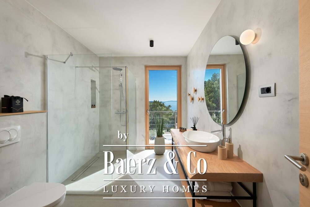 户外设有6×5米泳池、夏季厨房及户外淋浴,让住户在地中海植被环绕下享受惬意的露天生活。别墅还包含一块下方额外529平方米的地块,已获得建筑许可证并配备公用设施,确保永久享有全景海景。