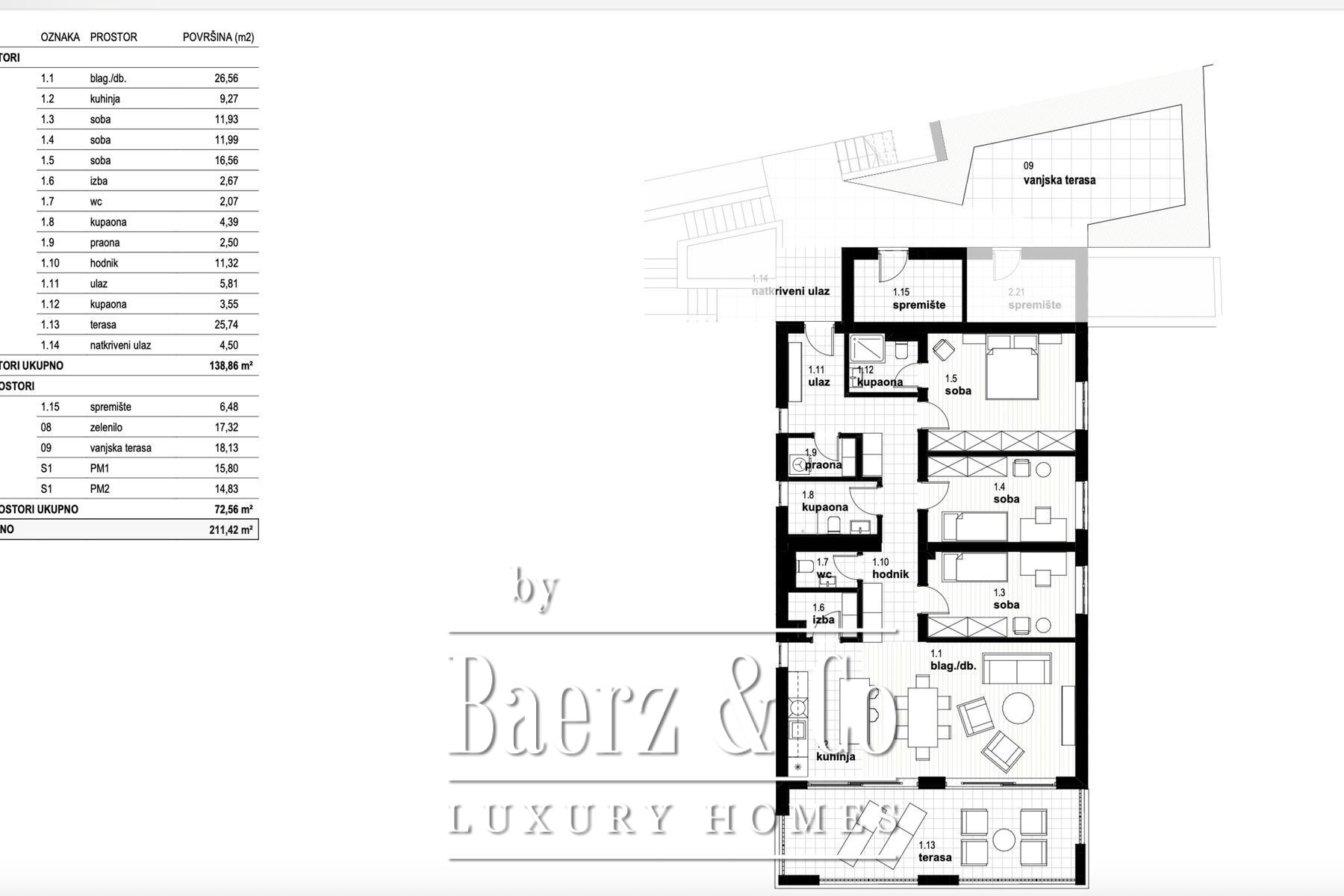 每间卧室比例精致,面积从9.17平方米至19.20平方米不等,并配有实用功能空间,包括步入式衣帽间、洗衣房、储藏室和独立储物间。三间浴室与一间客用卫生间共同为家人和来宾提供舒适体验。户外设有覆盖面积达25.74平方米的露台及另外两处露台,与园林化花园和私人泳池自然衔接,安静赏景,俯瞰Kvarner海岸的粼粼波光。
