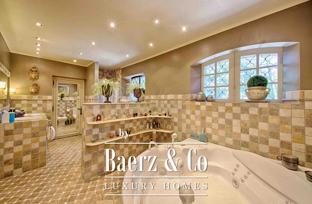 五间卧室分布合理,确保私密与舒适,并配有专属酒窖与独立看护住宅,隐蔽安置于园区一隅。十八棵百年橄榄树交错分布,以其银白色叶片为户外用餐区遮荫,并环绕泳池、池畔小屋与烧烤区。充裕的自然采光赋予室内平和氛围,而用材与细节处理—空调、壁炉、窗帘、灌溉系统、户外照明及光纤接入—均契合现代生活需求。