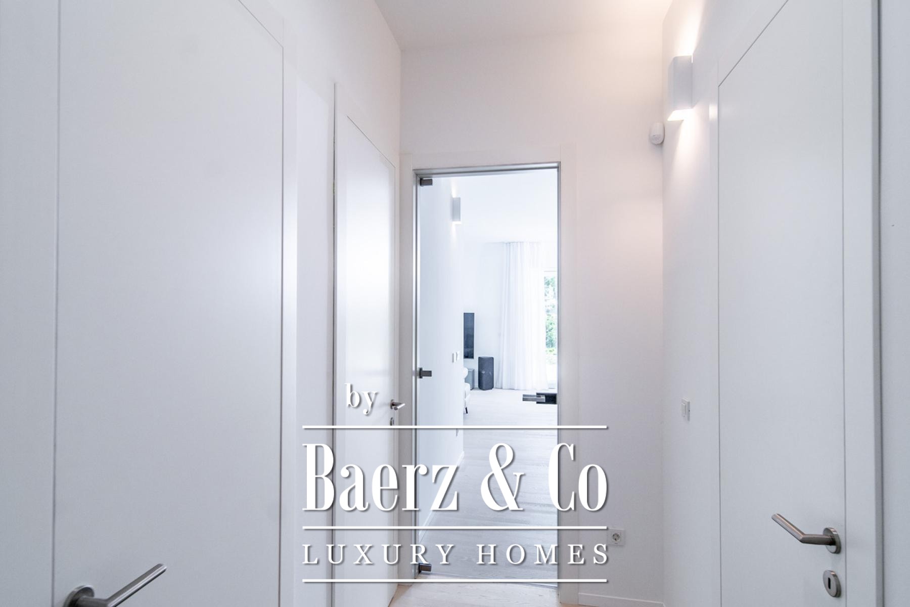 别墅采用现代风格,单层平屋顶设计,室内面积400平方米,结构专为抵御风雨而打造。外墙由38厘米粘土砖砌筑、12厘米隔热层及Baumit饰面共同保障卓越能效。设有两间卧室、两间浴室以及303厘米的层高,内部空间开阔且自然采光充足。夏季,大片玻璃幕墙通过深邃屋檐为室内遮阳,冬季,低角度阳光则为核心空间带来温润暖意。