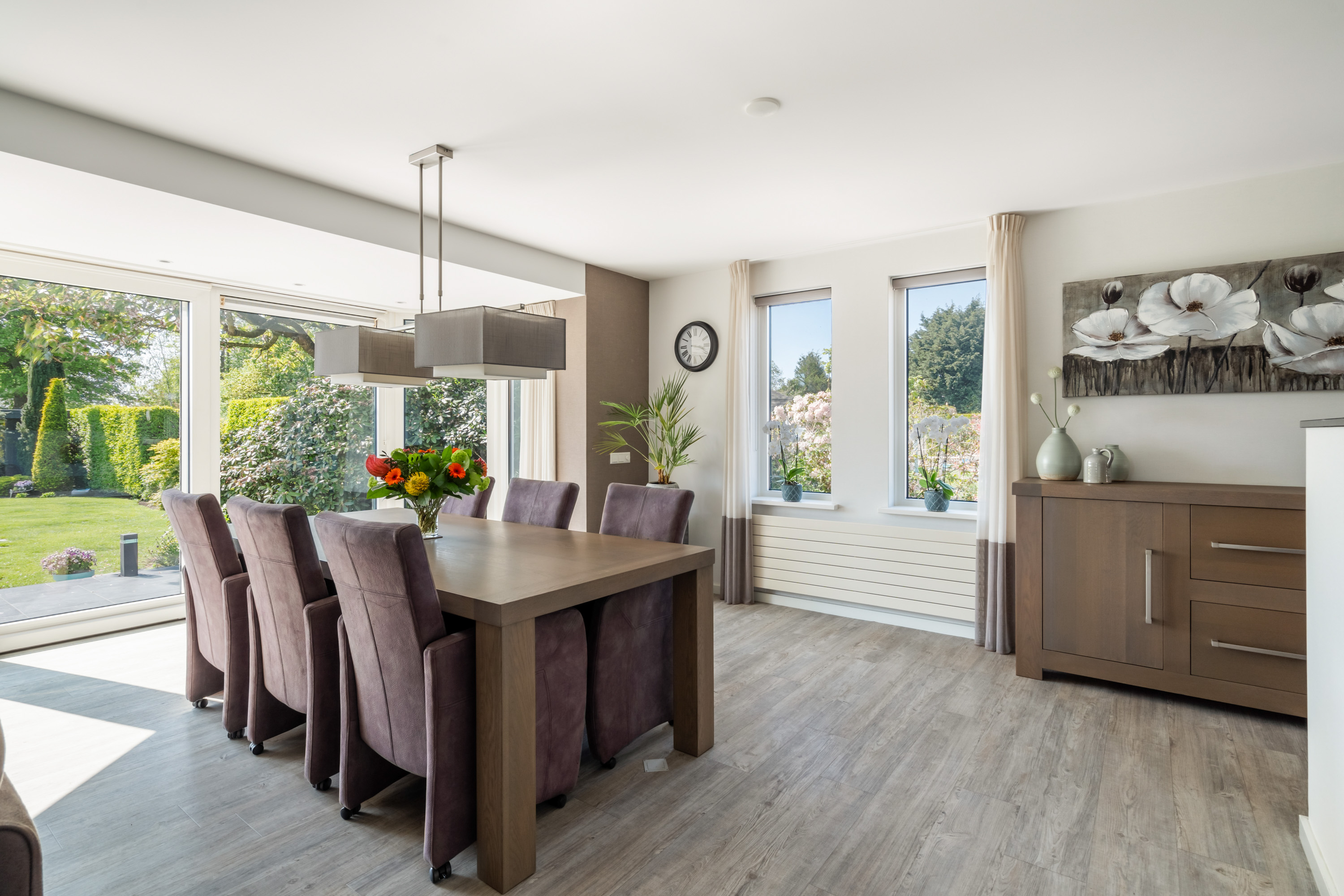 这栋位于Zevenhoven的独立住宅于Kromme Mijdrecht河畔,呈现罕见的私密性、自然归属感与现代高效性之间的极致平衡。167平方米的精心布局室内空间,设有三间卧室和一间浴室,配套1,006平方米的景观园地,水景、光影与精湛工艺共同勾勒出日常节奏。主入口置身于修剪有序的前花园,步入其间的明亮门厅,细腻用材与巧妙细节营造出静谧持久的居住氛围。灵活的双向入户设计提供私密性,非常适合在家办公与家庭生活的无缝切换,或从容迎接贵宾。起居室通透大窗、壁炉与可推拉的落地门使室内外融汇,开阔通达花园。现代开放式厨房配备Siemens厨电及Quooker热水龙头,邻接的大飘窗营造出临河用餐区。后部的家庭工作室享有充足自然光,适合专注办公或创意灵感激发。装修完善的地下室设有休息区、卧室及功能区,拓展了接待与生活空间。楼上两间主卧拥有广阔景致与舒适体验,其中一间直通独立阳台并配备空调。浴室处处体现用心设计,自然采光充沛,设施齐全。室外花园于2017年重新规划,设有加高硬木露台、焕新河岸和码头,让滨水生活轻松惬意——一处别出心裁的奢华别墅目前在Zevenhoven发售。带顶阳台全年舒适无忧,呼应宅邸对悠闲与全天候享受的承诺。私家安防停车位配备摄像头监控和电动汽车充电桩,出行无忧。全保温工作室储物间满足多元实用需求,同时以A级能效与20块太阳能板(年产约7000千瓦时)展现可持续理念。地暖、三重通风与升级的基础设施让住宅未来十足无忧。房产坐拥Groene Hart宁静美景,兼具宁谧与便捷,紧邻城镇配套设施,是持久河畔生活的理想邀请。